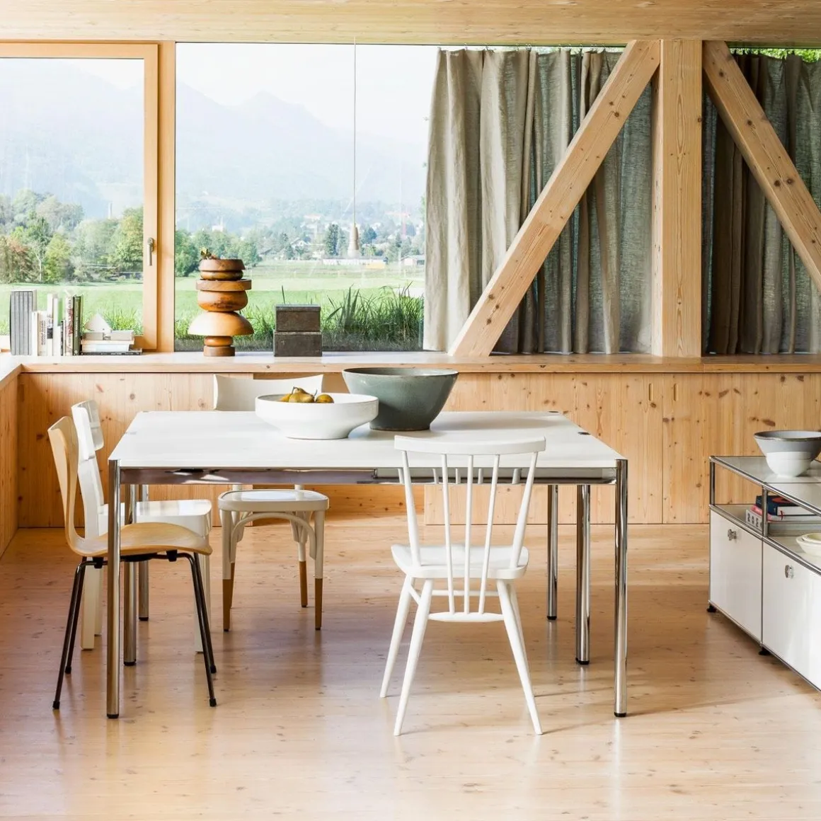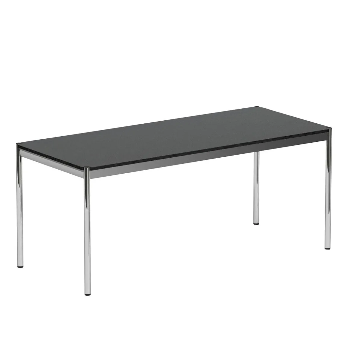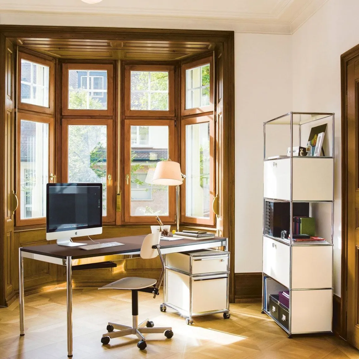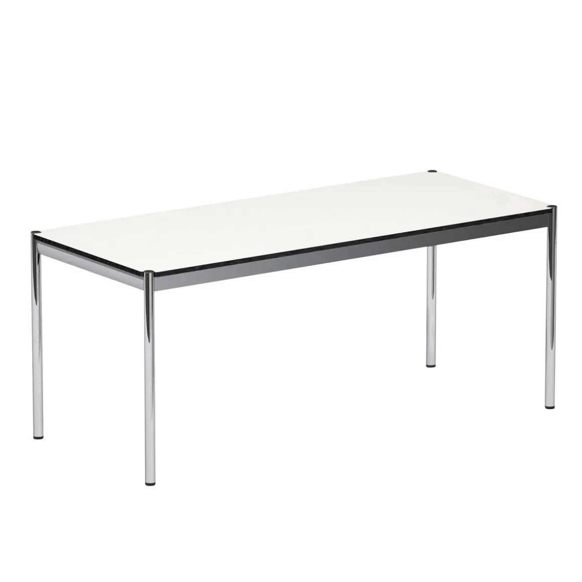 La table USM Haller est constituée de quatre piétements tubulaires avec vérins de réglage et d’une ceinture porteuse en acier chromé. Les plateaux, déclinés en plusieurs dimensions, coloris et matériaux viennent parfaire cette conception épurée. Utilisable en table de repas ou table de conférence, la table USM Haller se dote en option d’une multitude d’accessoires lorsqu’elle devient poste de travail.