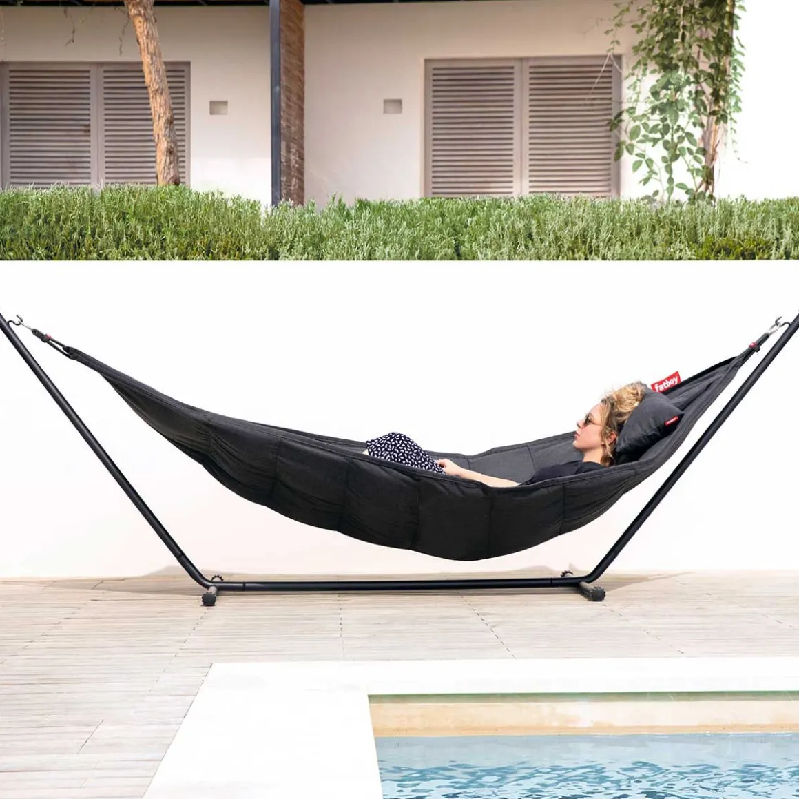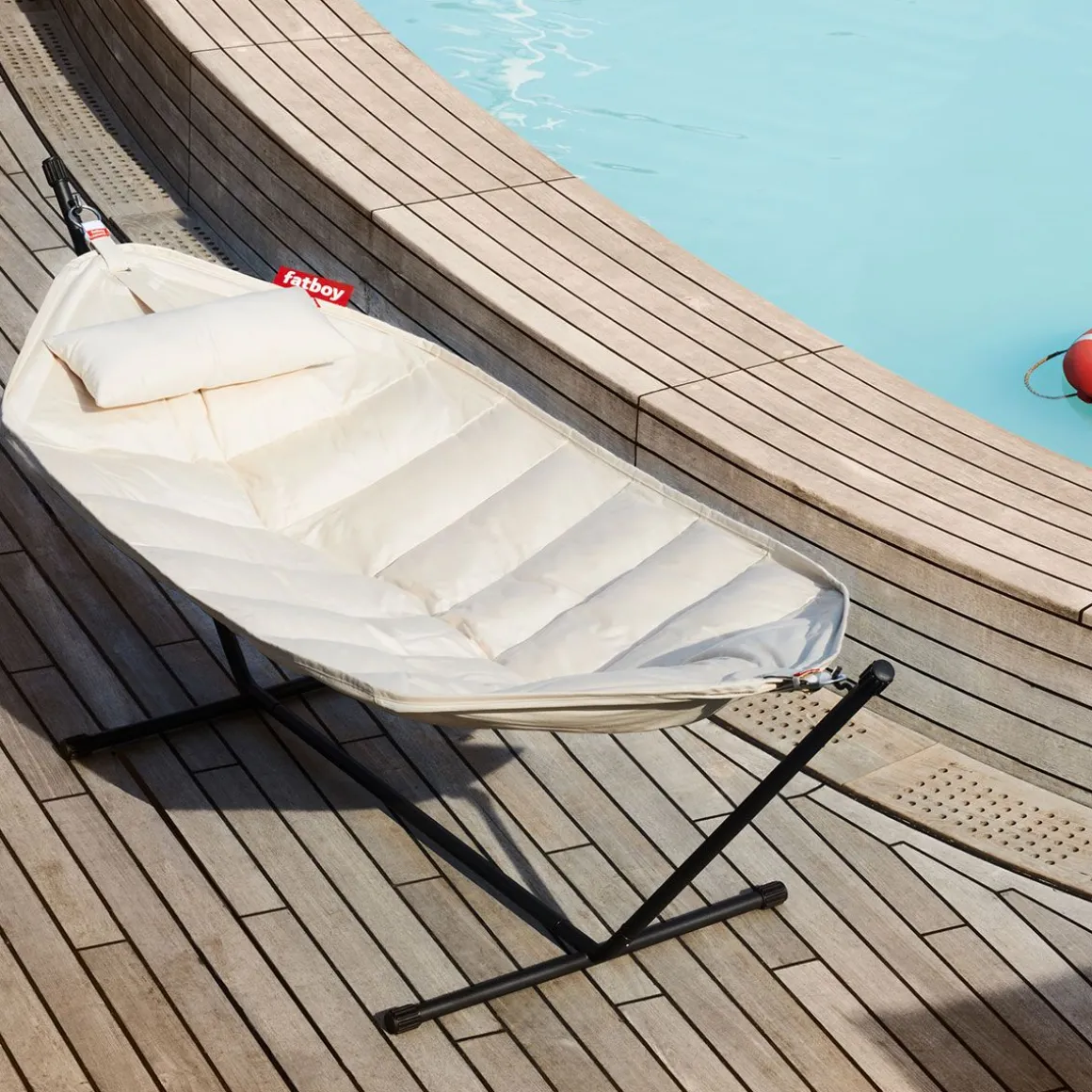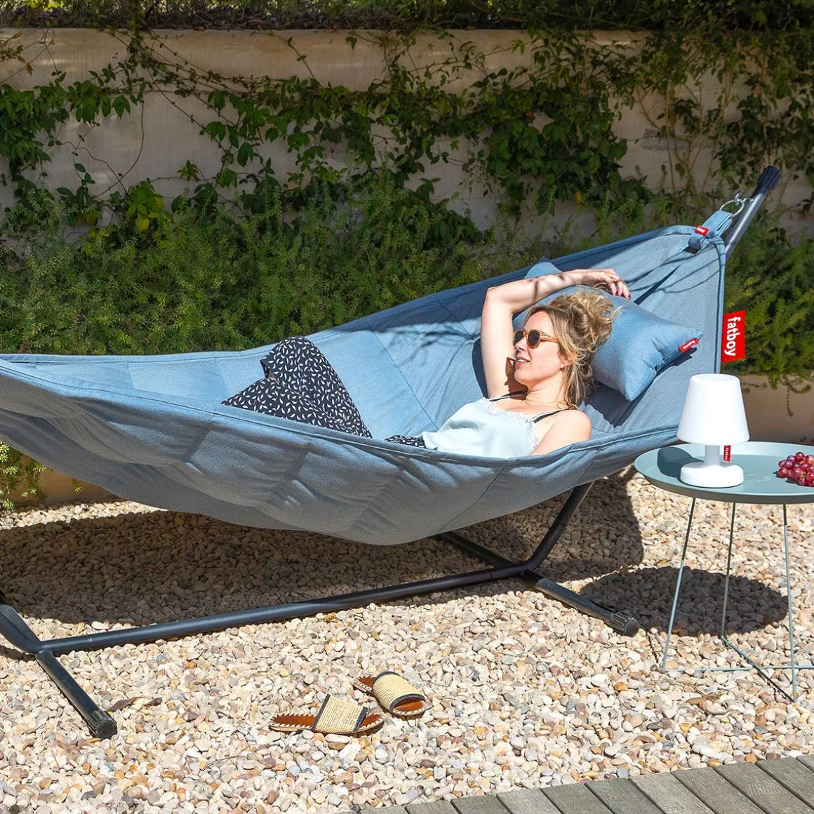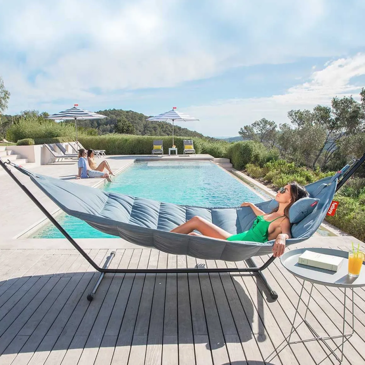 3,2,1… Détente ! Le Headdemock Superb est un confortable hamac d’extérieur pour deux (max. 150 kg) avec support. Pas besoin d’un mur ou d’un arbre – détendez-vous où vous voulez.