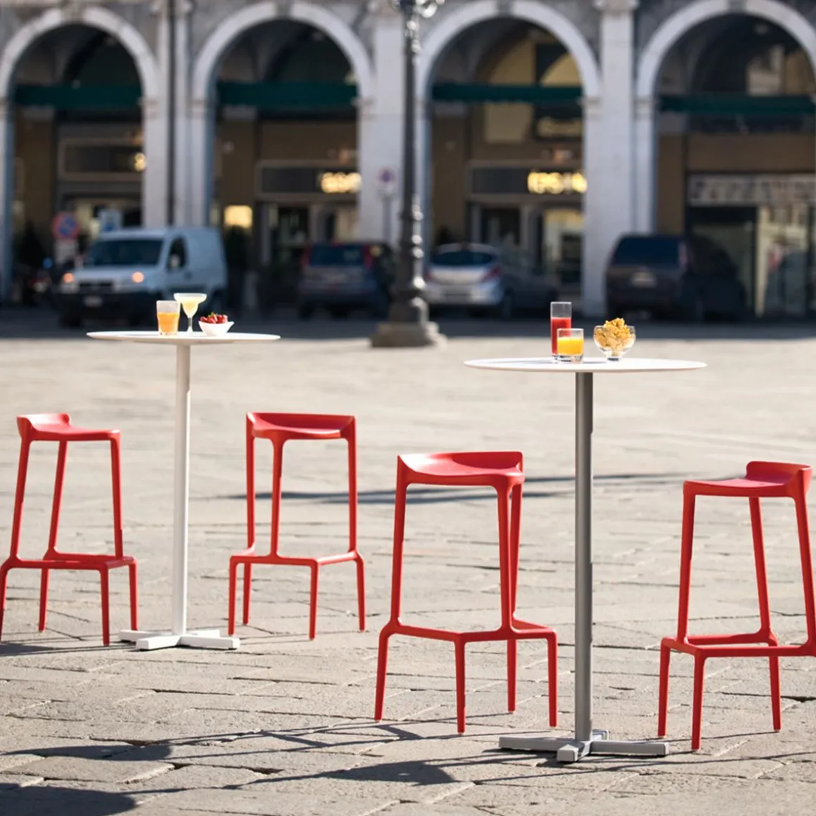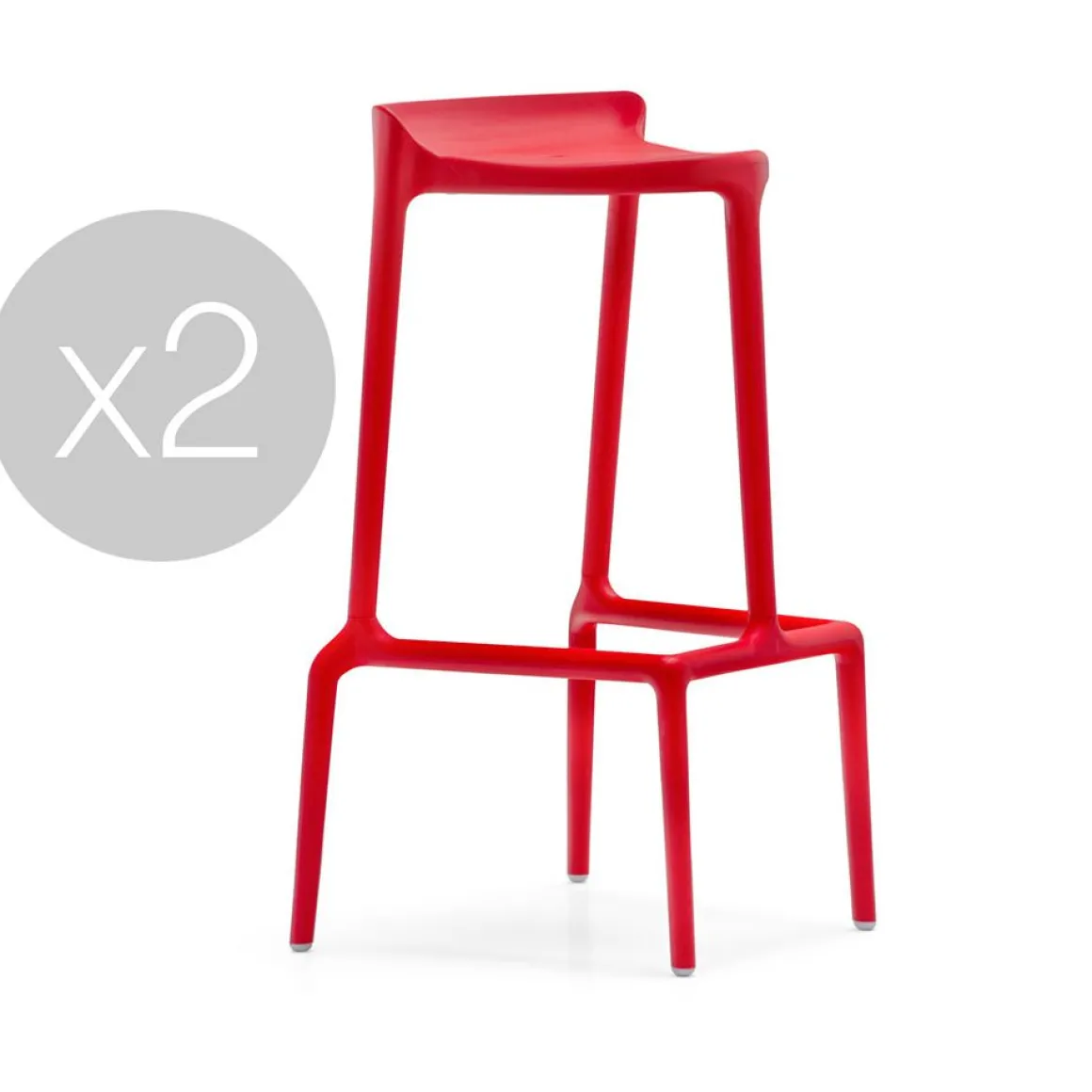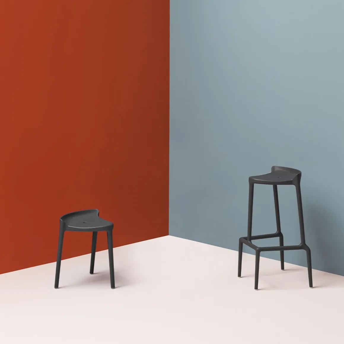 Un tabouret haut et empilable et, sans base, une assise basse. Jeune et coloré il est réalisé entièrement en polypropylène avec l’aide du gas pour le rendre plus léger, rigide et résistant. Apte pour l’extérieur.