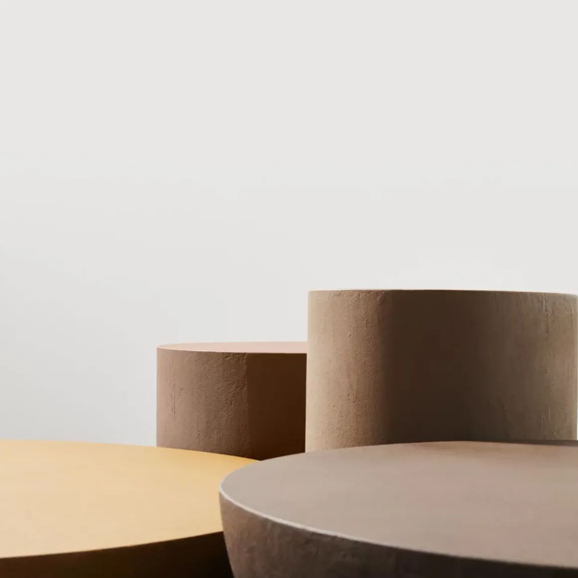 La collection se compose de tables basses en polymère haute densité, finition avec couche d’argile. Traitement antitache mat. Disponible en quatre tailles et trois couleurs: Ombra, Cassel ou bien Siena.