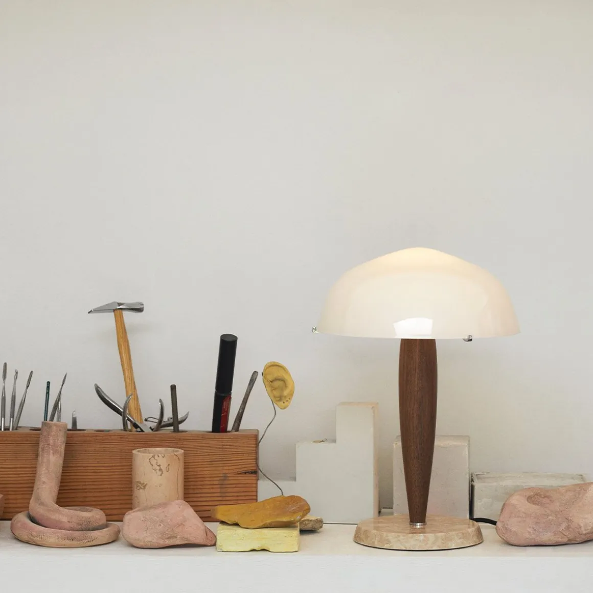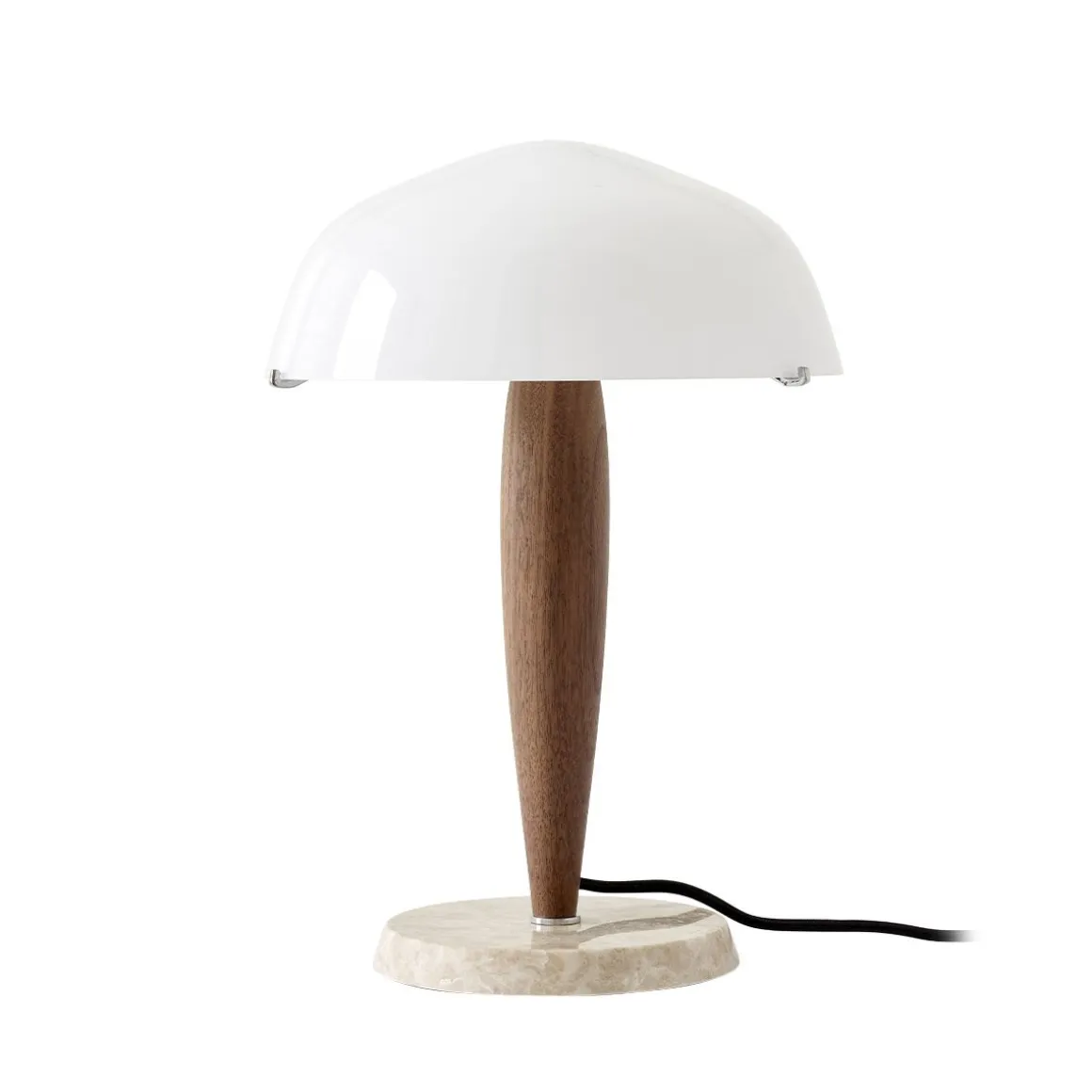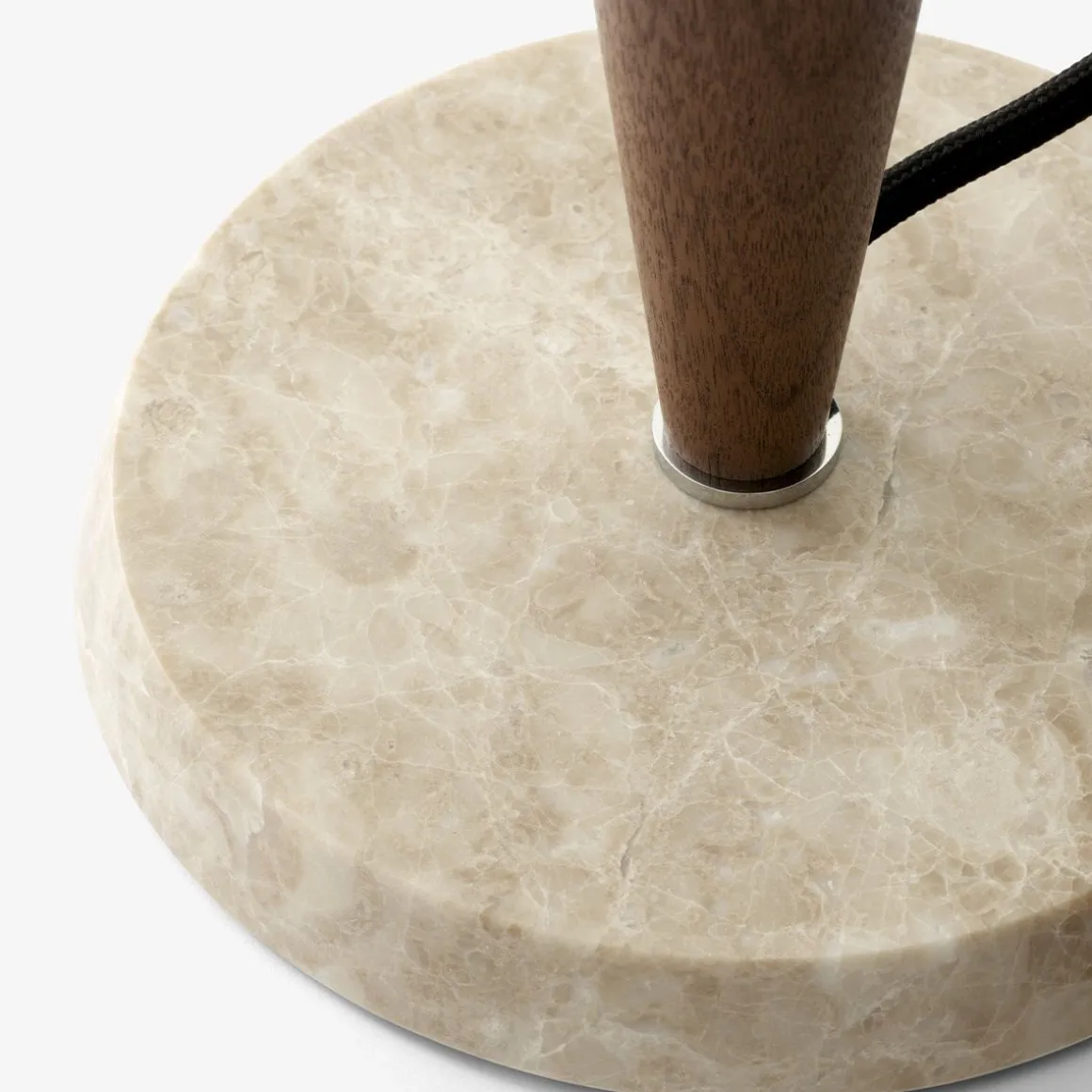 Matériaux : abat-jour en verre opale, tige en noyer, marbre beige, détails chromés, cordon textile