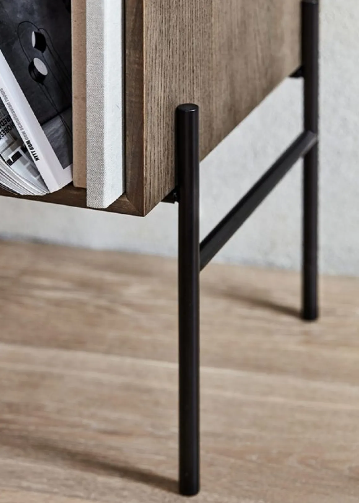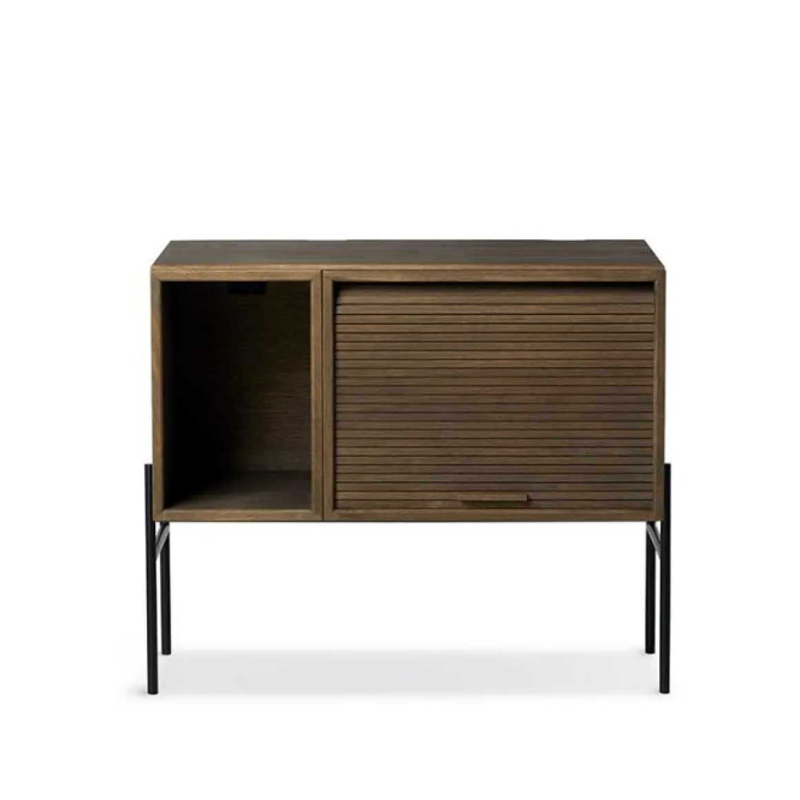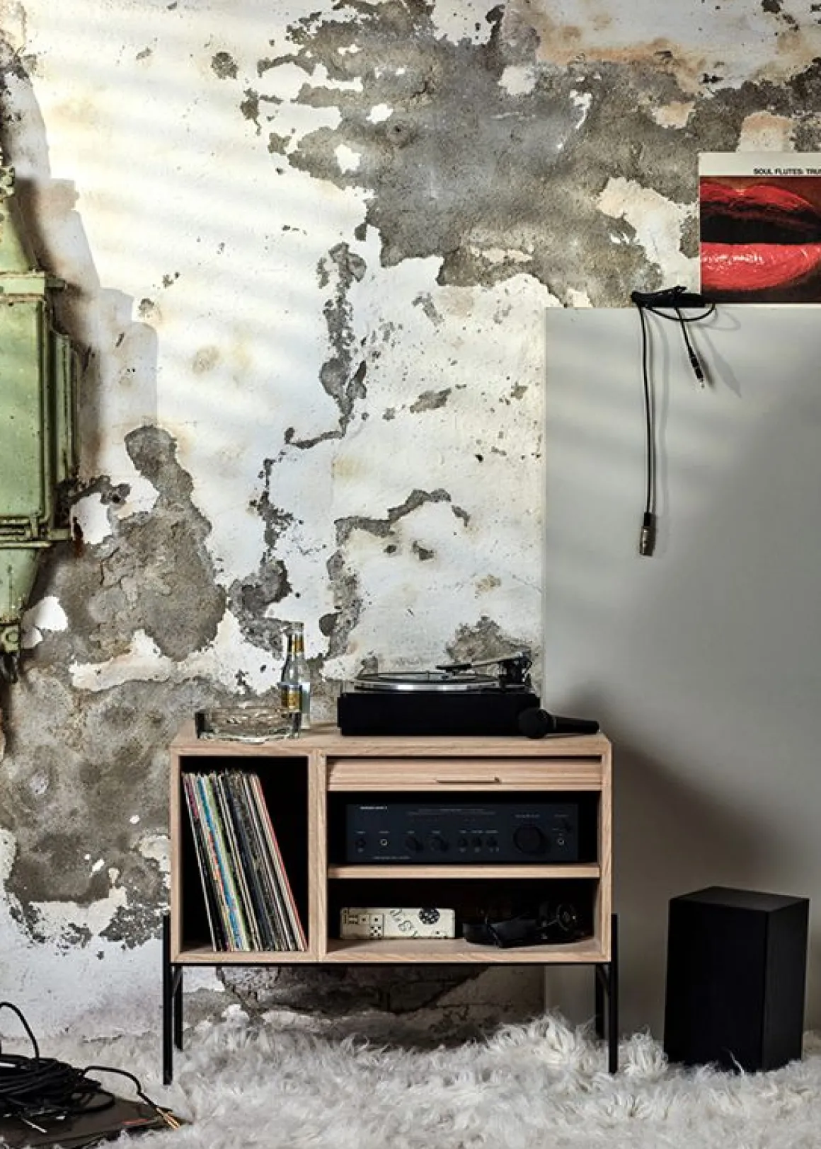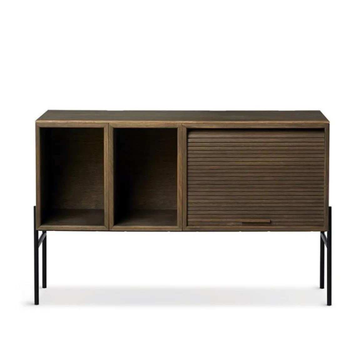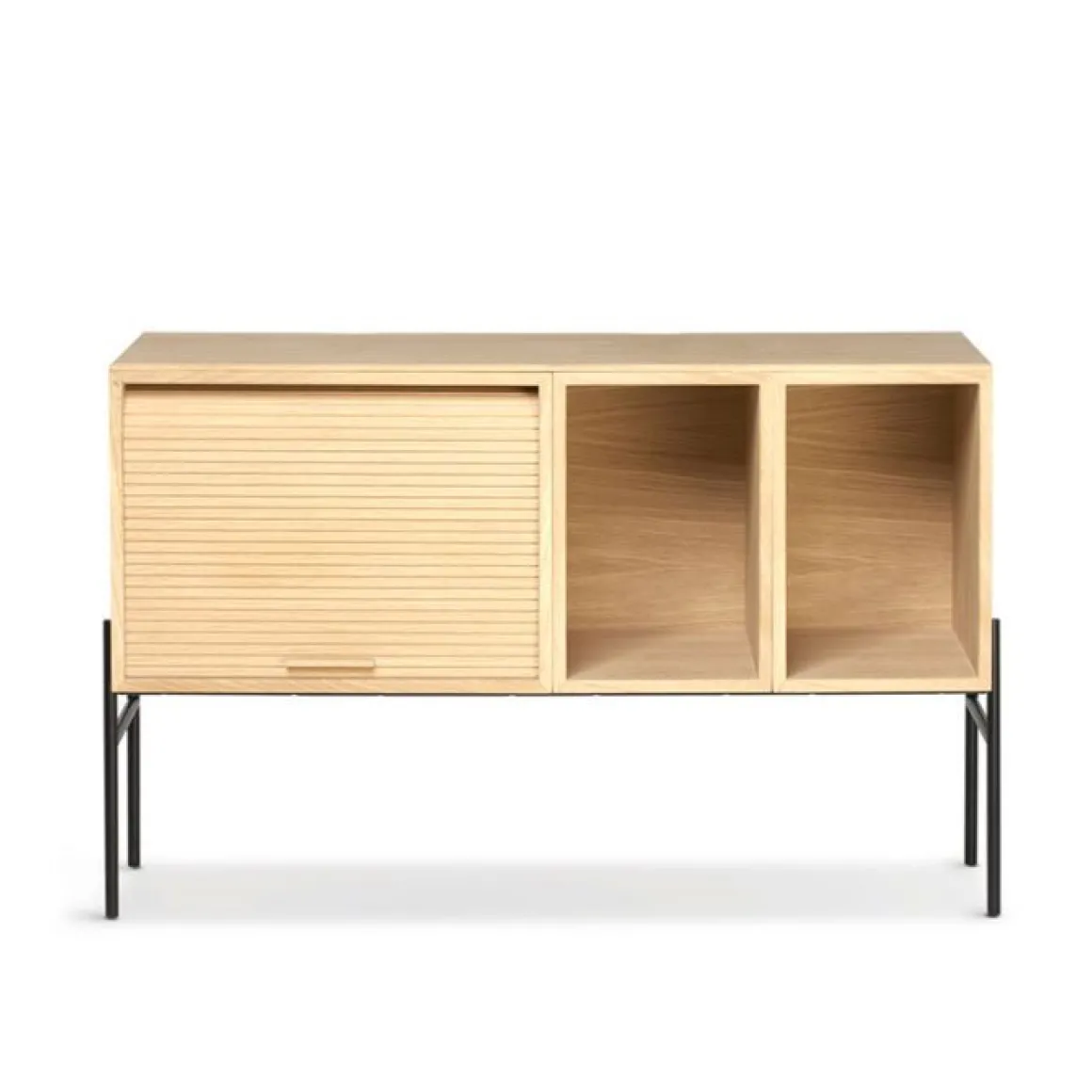 Le meuble Hifive est un sytème de stockage et de rayonnage chic. Le système comprend des composants modulaires simplifiés: une unité ouverte, une armoire avec une porte à défilement, une base métallique élégante et un plateau en bois qui unit les unités avec une seule surface. Si aucune base n’est requise, les unités peuvent être montées directement sur le mur. L’armoire est conçue pour contenir des équipements tels que des récepteurs, des amplificateurs et des lecteurs multimédia. Sa porte défilante se ferme pour dissimuler le contenu, cachant l’électronique derrière un écran en bois flexible. L’unité ouverte est dimensionnée pour accueillir les disques vinyle de la vieille école, mais peut également stocker de la musique et des médias télévisés. Les unités sont disponibles en placage de chêne fumé, en placage de chêne peint en noir et en placage de chêne couleur claire.