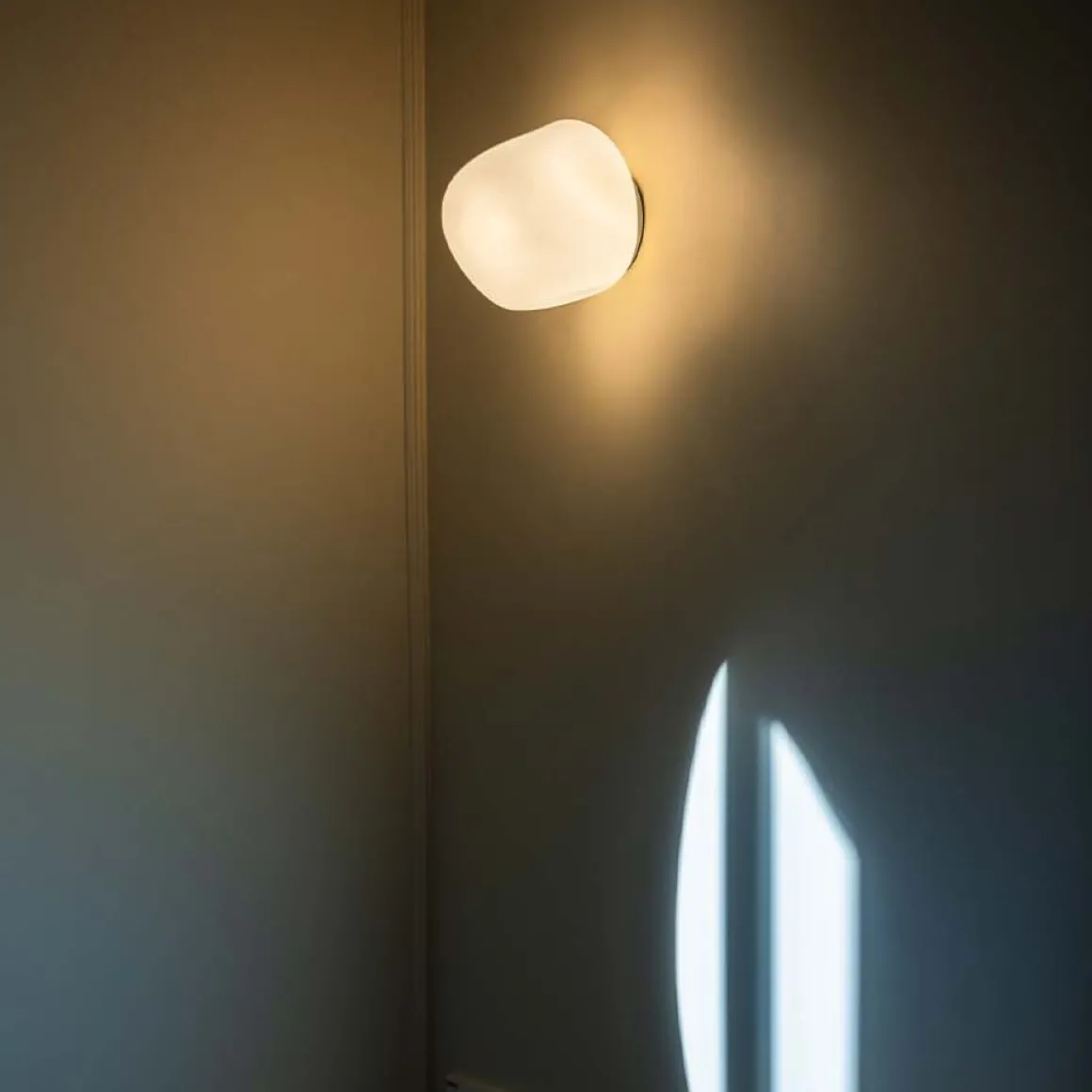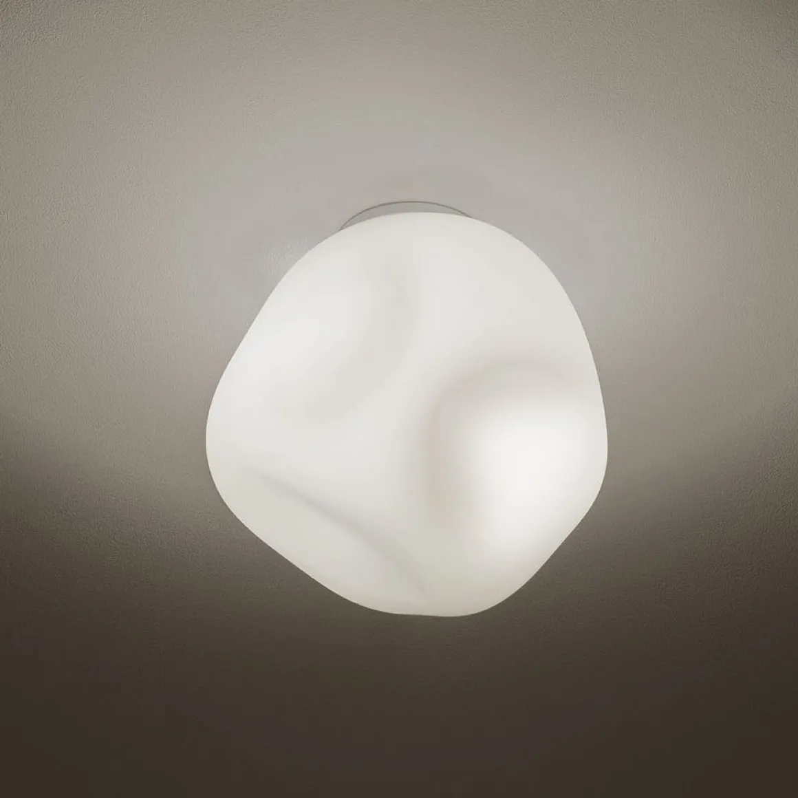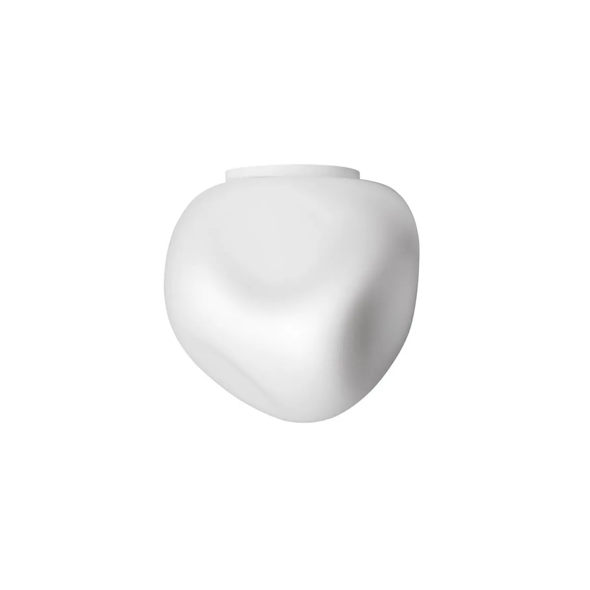 Réalisés en verre soufflé mat, les plafonniers Hoba ont une forme asymétrique et irrégulière qui rappelle une météorite cristallisée au moment de son envol. Elles diffusent une lumière chaude et enveloppante.