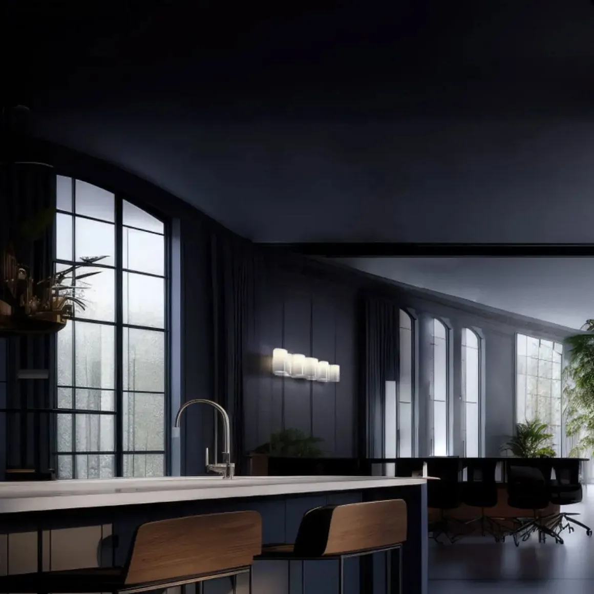 Honey de Stilnovo. Honey applique est un jeu modulaire sophistiqué qui interprète la lumière comme un élément architectural. Il marque l’espace avec rythme et harmonie, conférant une élégance discrète et contemporaine. Les diffuseurs ondulés en matériau opale filtrent la lumière de manière naturelle, générant des nuances délicates et des reflets dynamiques qui soulignent la tridimensionnalité du design.