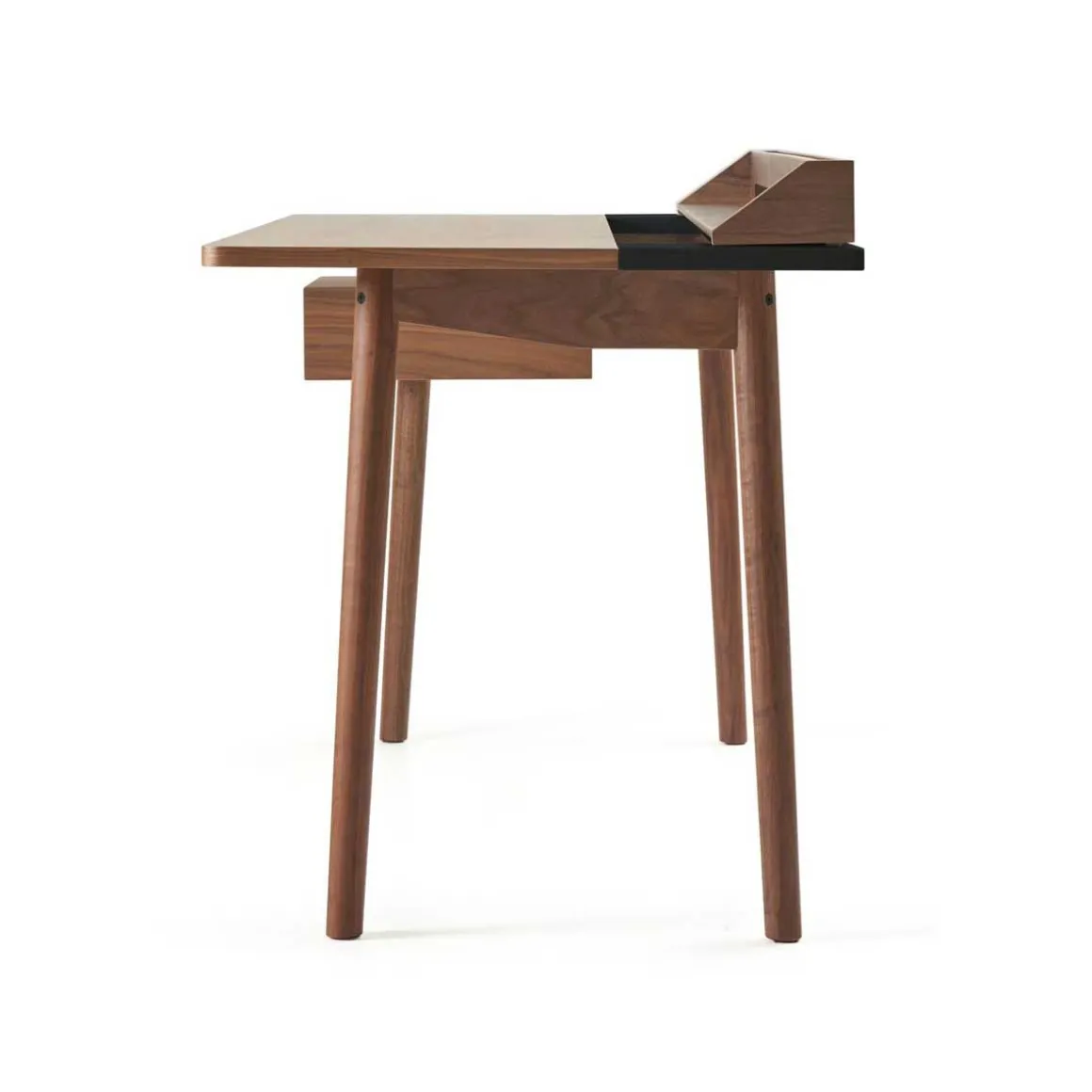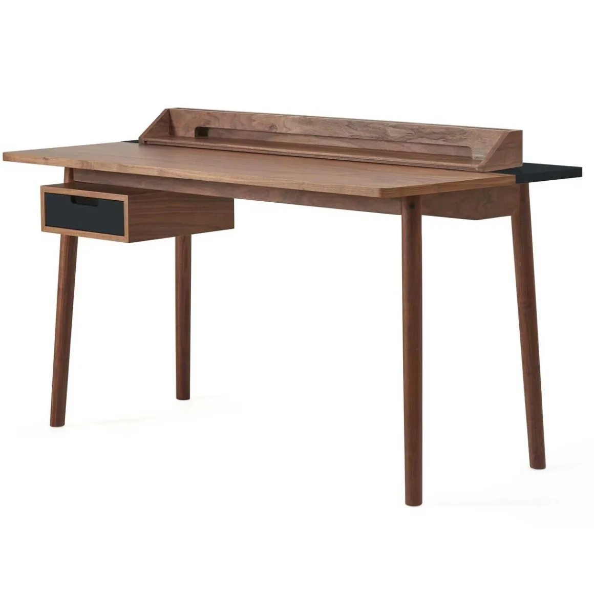 Matériaux :Plan de travail en MDF plaqué noyer finition mat, Pupitre et pieds en chêne massif, Laque satinée colorée sur le tiroir et l’arrière du plan de travail