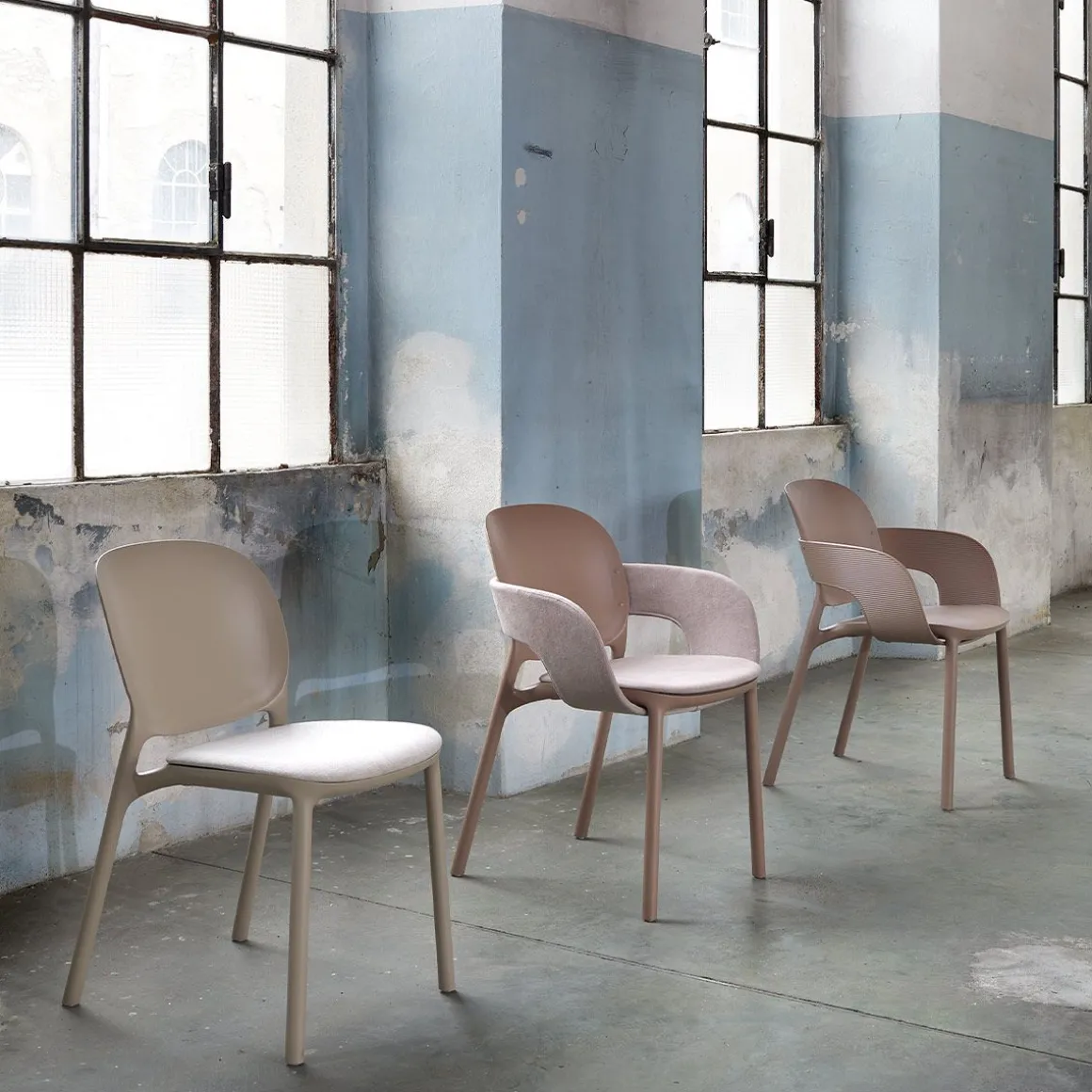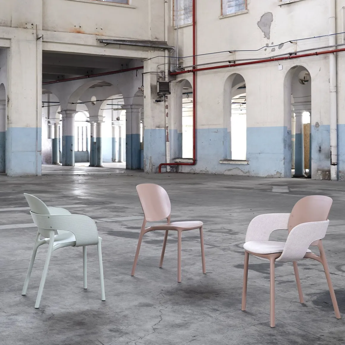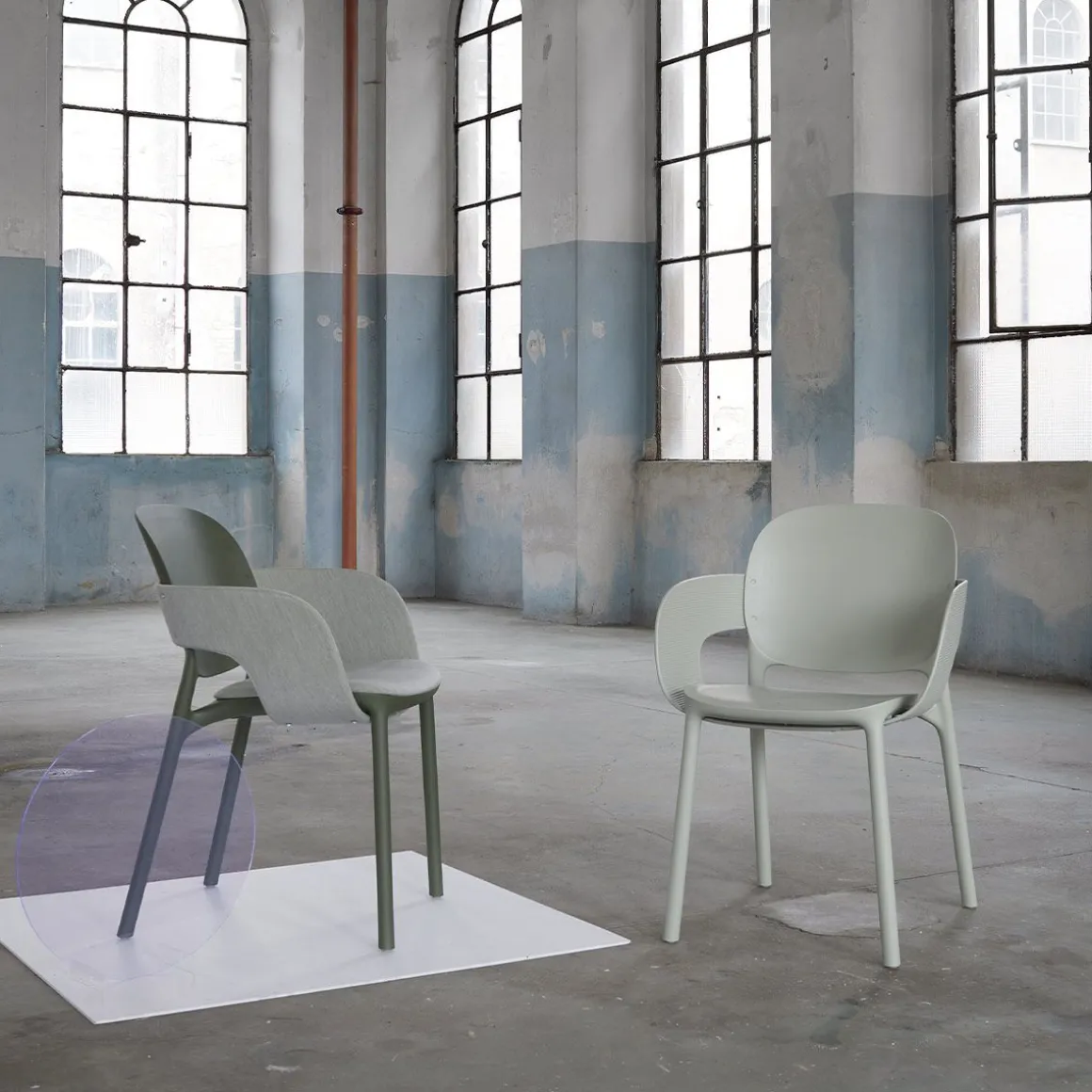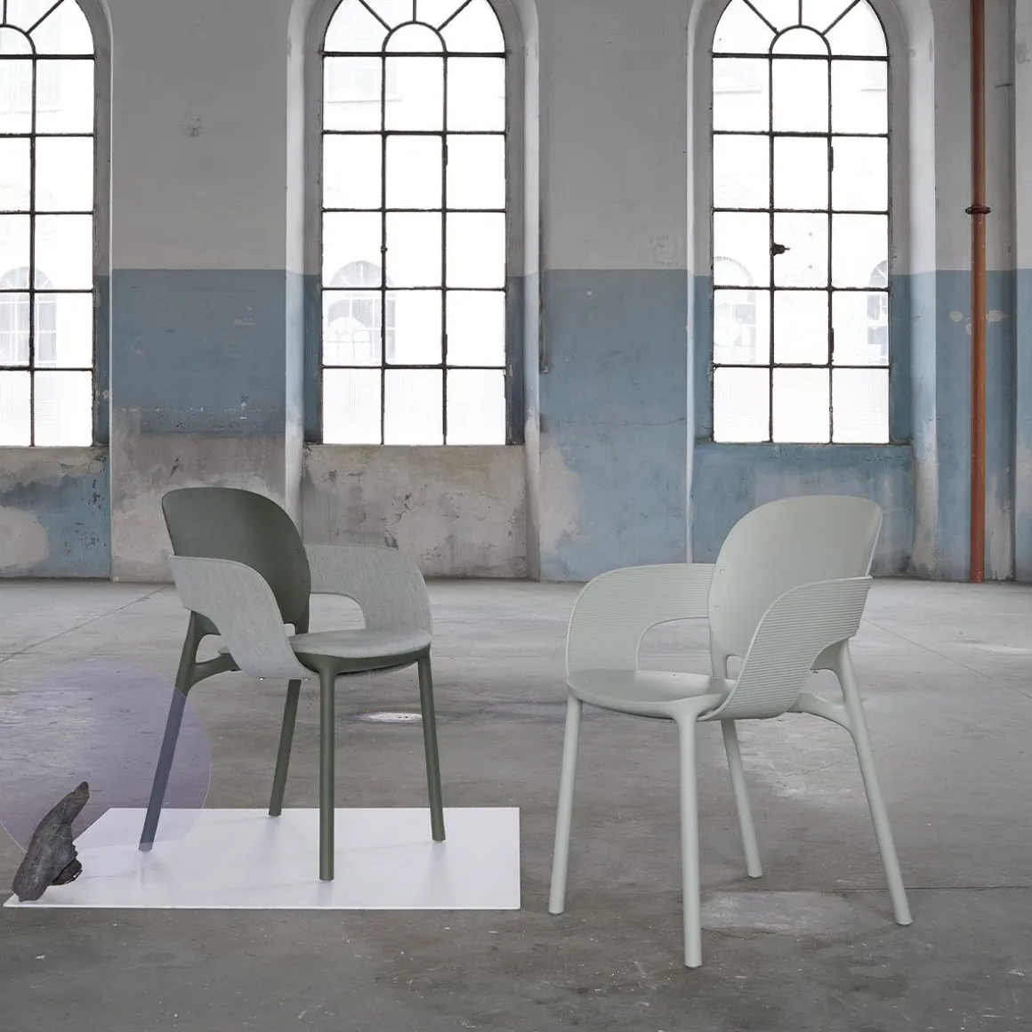 Pour HUG, chaise et fauteuil, un élément extrêmement distinctif a été pensé: entre l’assise et le dossier, aux formes arrondies et en équilibre pour une meilleure utilisation, les designers ont introduit un élément à bande, enveloppant comme une accolade. Un confort à apprécier aussi bien à l’extérieur qu’à l’intérieur, selon la tendance désormais consolidée de traiter les environnements avec les mêmes codes esthétiques. Il existe deux variantes: on pourra opter pour une version entièrement en technopolymère particulièrement graphique et belle à regarder sous tous les angles, définie par un motif à rayures en relief sur toute la longueur de la bande; ou une plus gracieuse avec l’ajout d’un coussin d’assise et d’une bande rembourrée tapissée de tissu, pour augmenter l’effet de confort enveloppant.