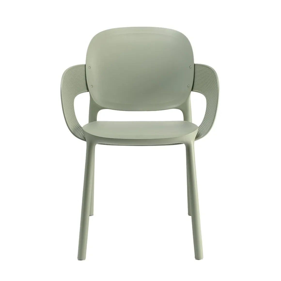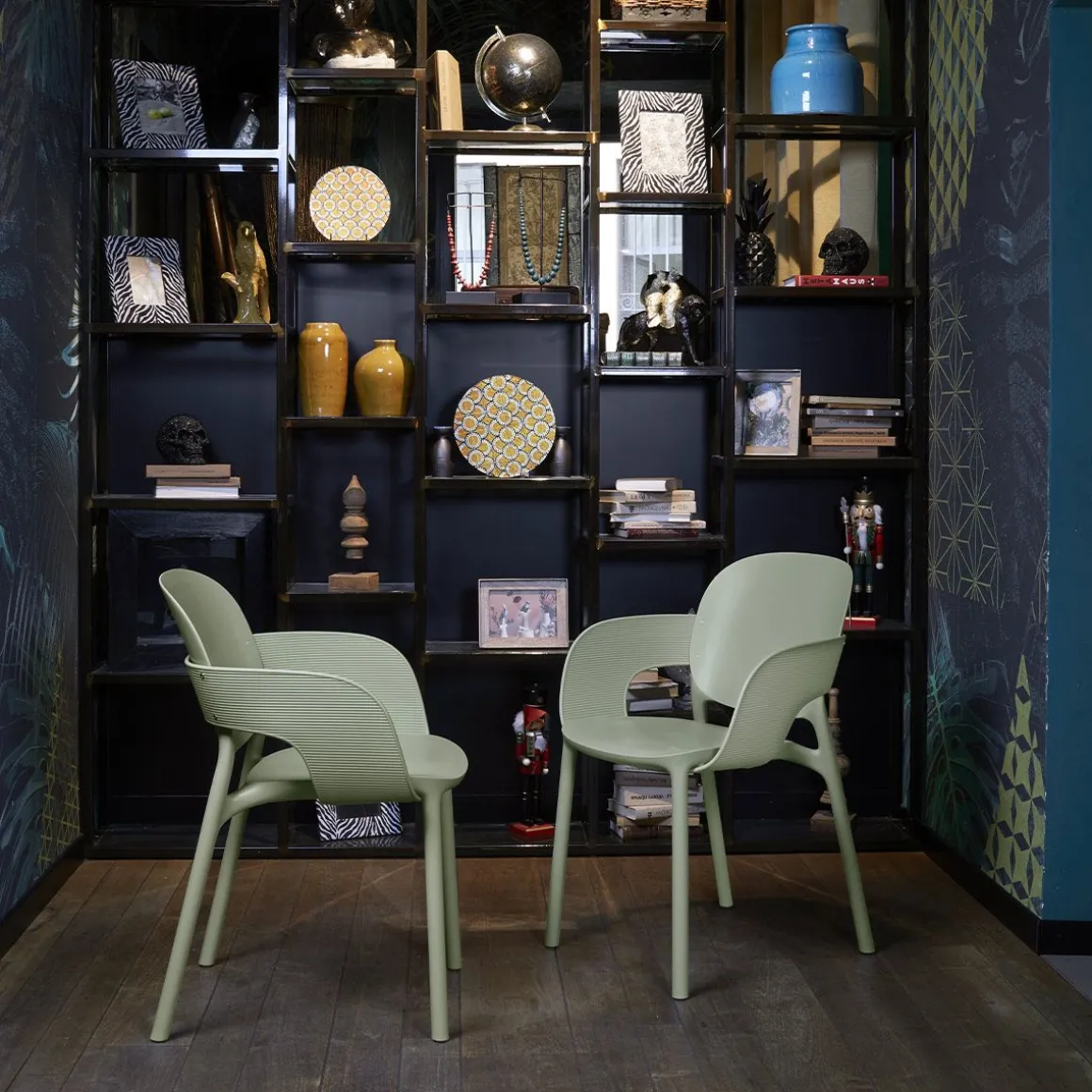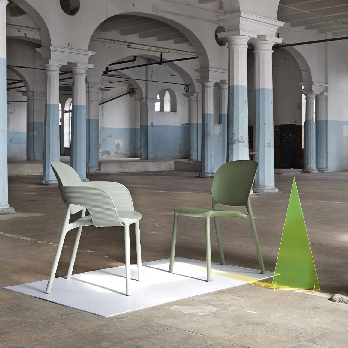 Pour HUG, chaise et fauteuil, un élément extrêmement distinctif a été pensé: entre l’assise et le dossier, aux formes arrondies et en équilibre pour une meilleure utilisation, les designers ont introduit un élément à bande, enveloppant comme une accolade. Un confort à apprécier aussi bien à l’extérieur qu’à l’intérieur, selon la tendance désormais consolidée de traiter les environnements avec les mêmes codes esthétiques. Il existe deux variantes: on pourra opter pour une version entièrement en technopolymère particulièrement graphique et belle à regarder sous tous les angles, définie par un motif à rayures en relief sur toute la longueur de la bande; ou une plus gracieuse avec l’ajout d’un coussin d’assise et d’une bande rembourrée tapissée de tissu, pour augmenter l’effet de confort enveloppant.