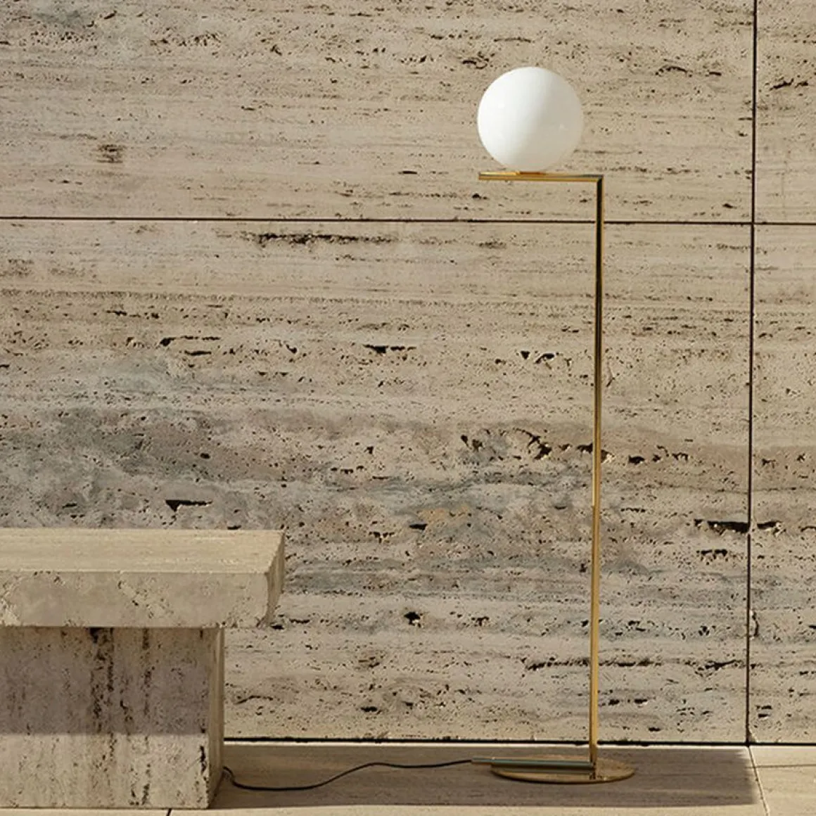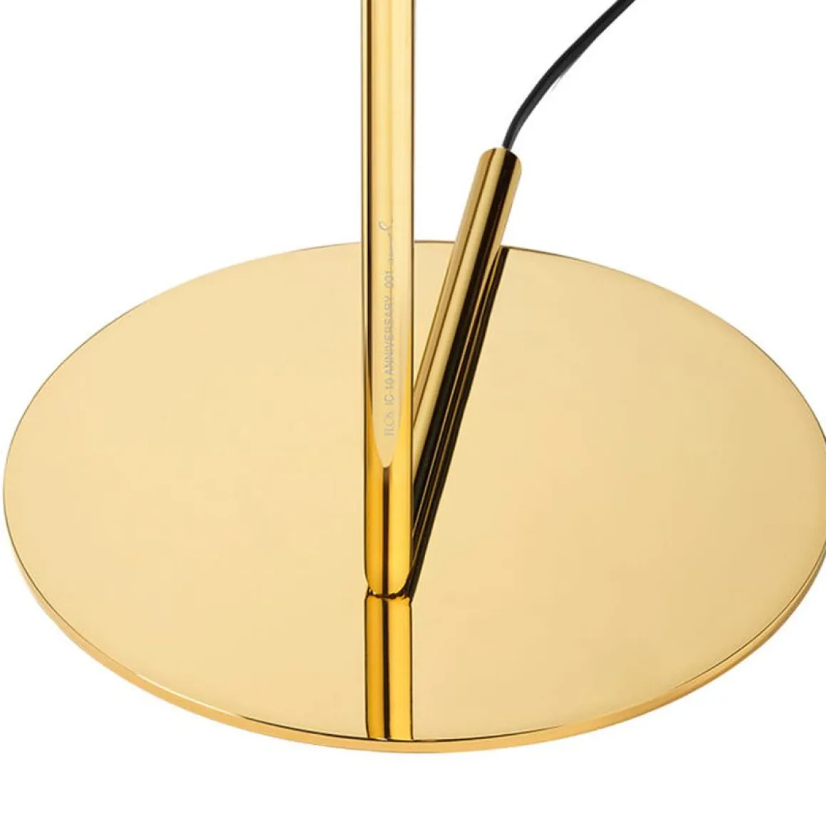 Lampadaire à lumière diffuse. Structure en bain dor 24 carats. Diffuseur opale en verre soufflé. Variateur sur le câble d’alimentation.