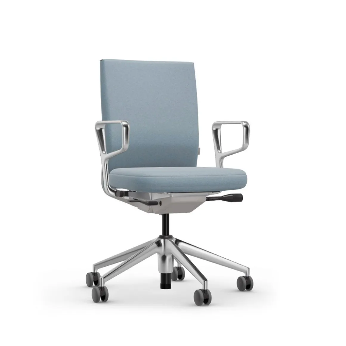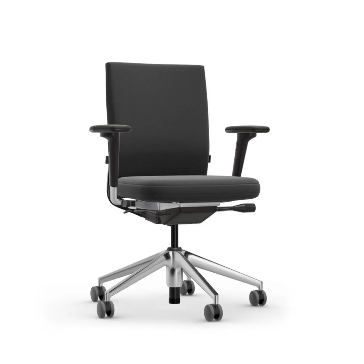 Accoudoirs : accoudoirs 2D réglables en hauteur et largeur ou accoudoirs 3D à hauteur, largeur et profondeur réglages et poivrants à 360°. Supports d’accoudoirs en aluminium poli. Manchons pour accoudoirs en polyamide assorti à la couleur du cadre (basic dark ou soft grey).