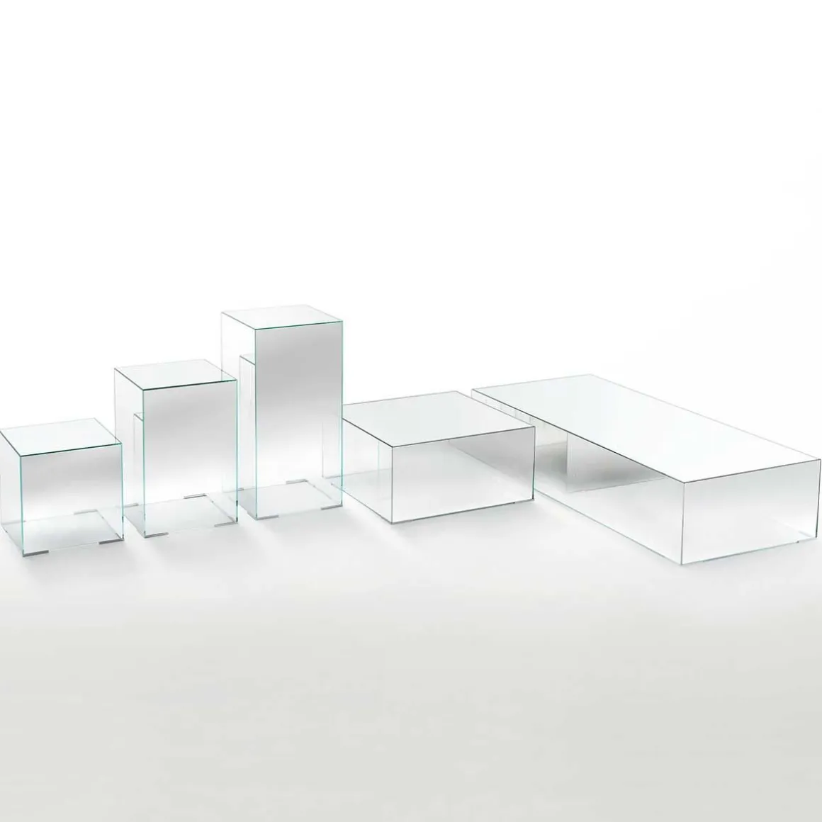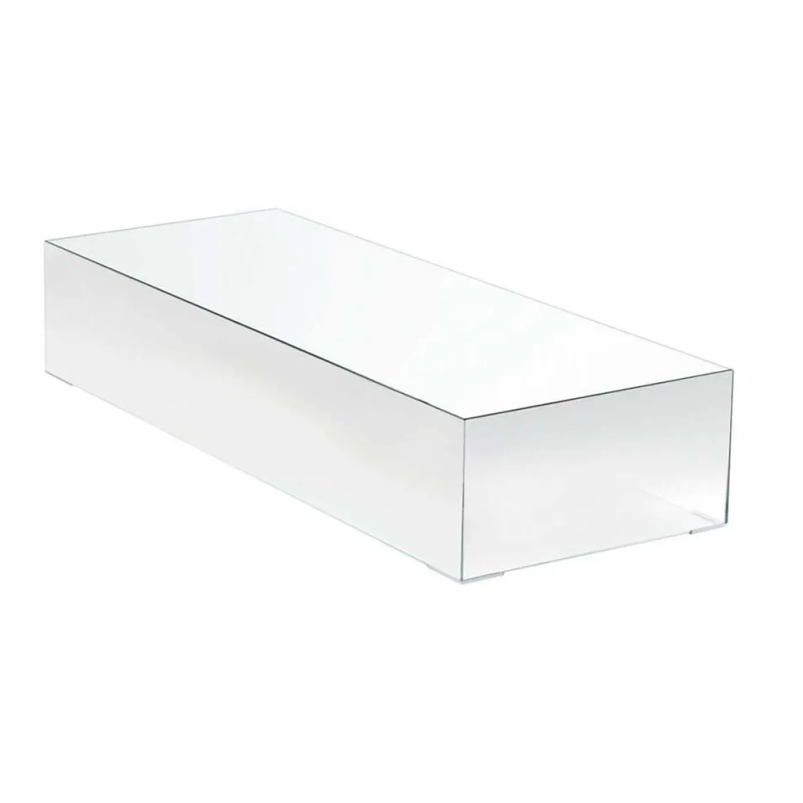 Illusion de Glas Italia et créé par Jean-Marie Massaud est une série de tables basses en forme de parallélépipède avec plateau finition miroir et cotés en miroir nuancé dégradé.