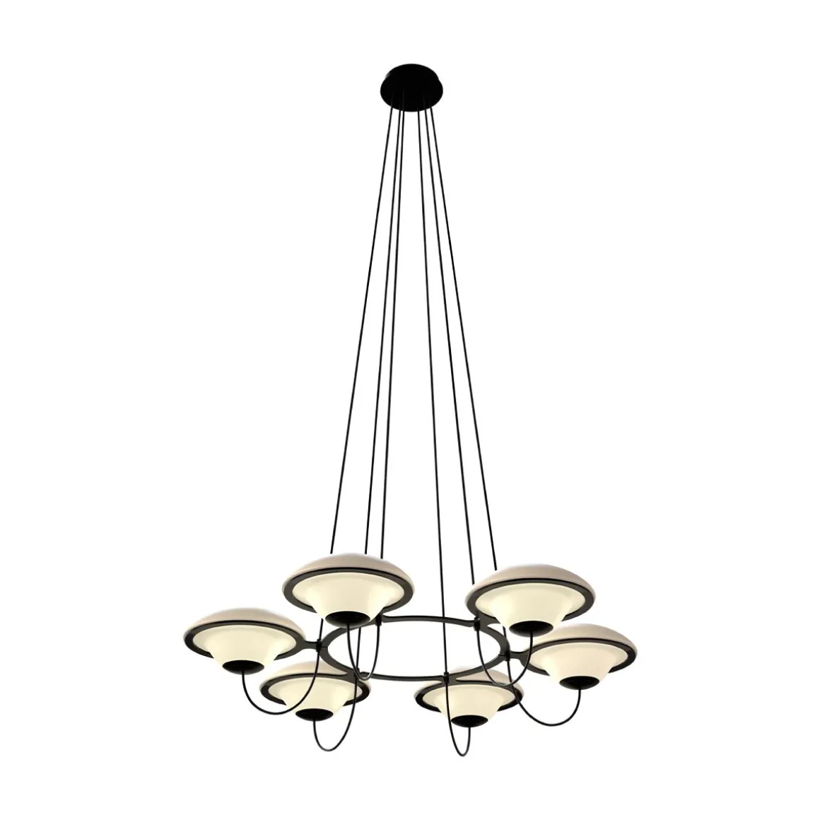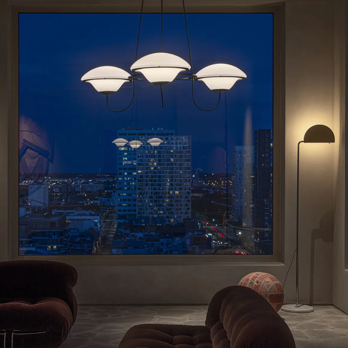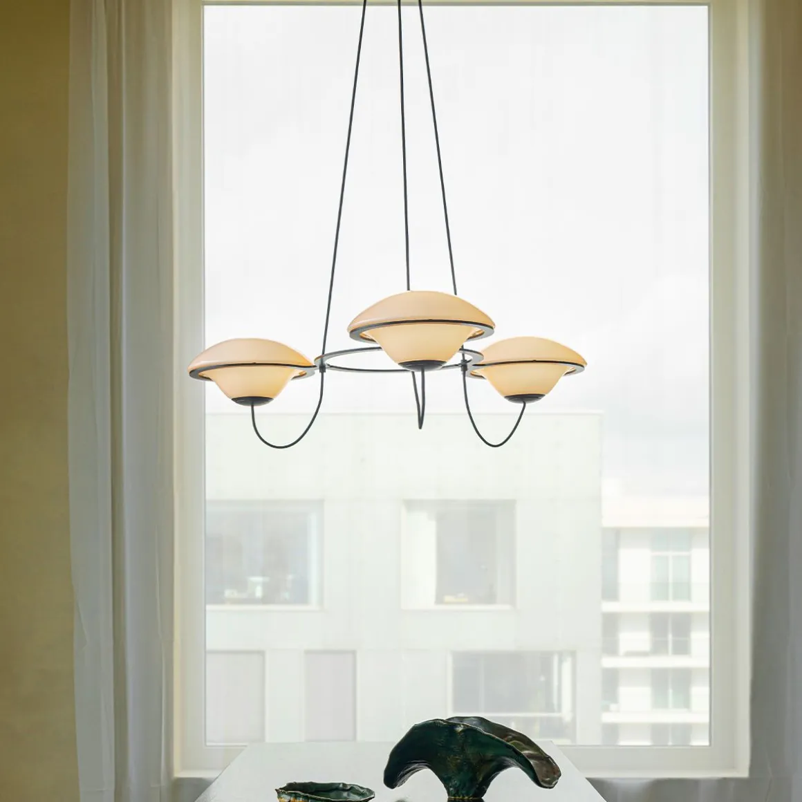 Avec ses lumières « ufoesques », le lustre In the Air créé par Douglas Mont, se revendique de ce répertoire où la fantaisie rétro-futuriste le dispute à une science-fiction nostalgique. Voir et revoir les comics américains ou les films hollywoodiens de série B envahis de soucoupes volantes pour évaluer l’empreinte de cet arsenal lumineux fonctionnant par flotte de trois ou six aéronefs. Lumineux, biomorphique, posé sans ancrage sur des cercles métalliques, à l’instar de quelques lumières totémiques des années soixante italiennes, In the Air se pose en équilibre spatial, profilé telle une aéro-station en lévitation opalescente. Deux poids, deux mesures selon le nombre de lumières, sans en modifier ADN et allure.