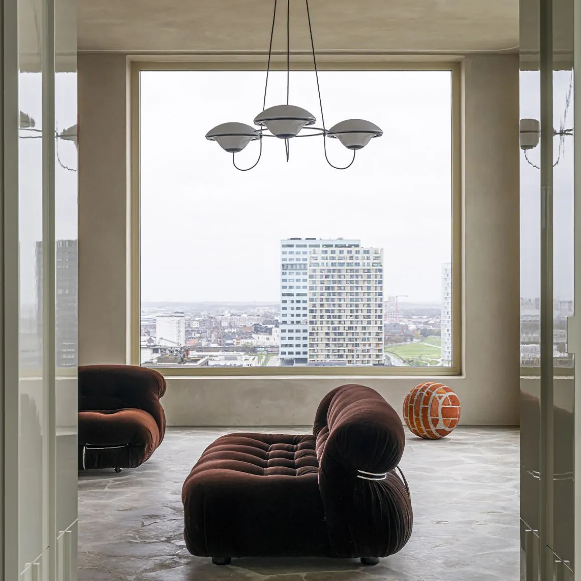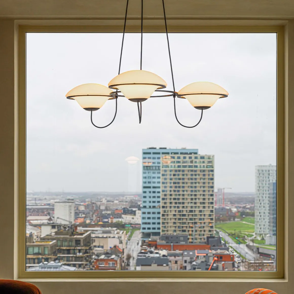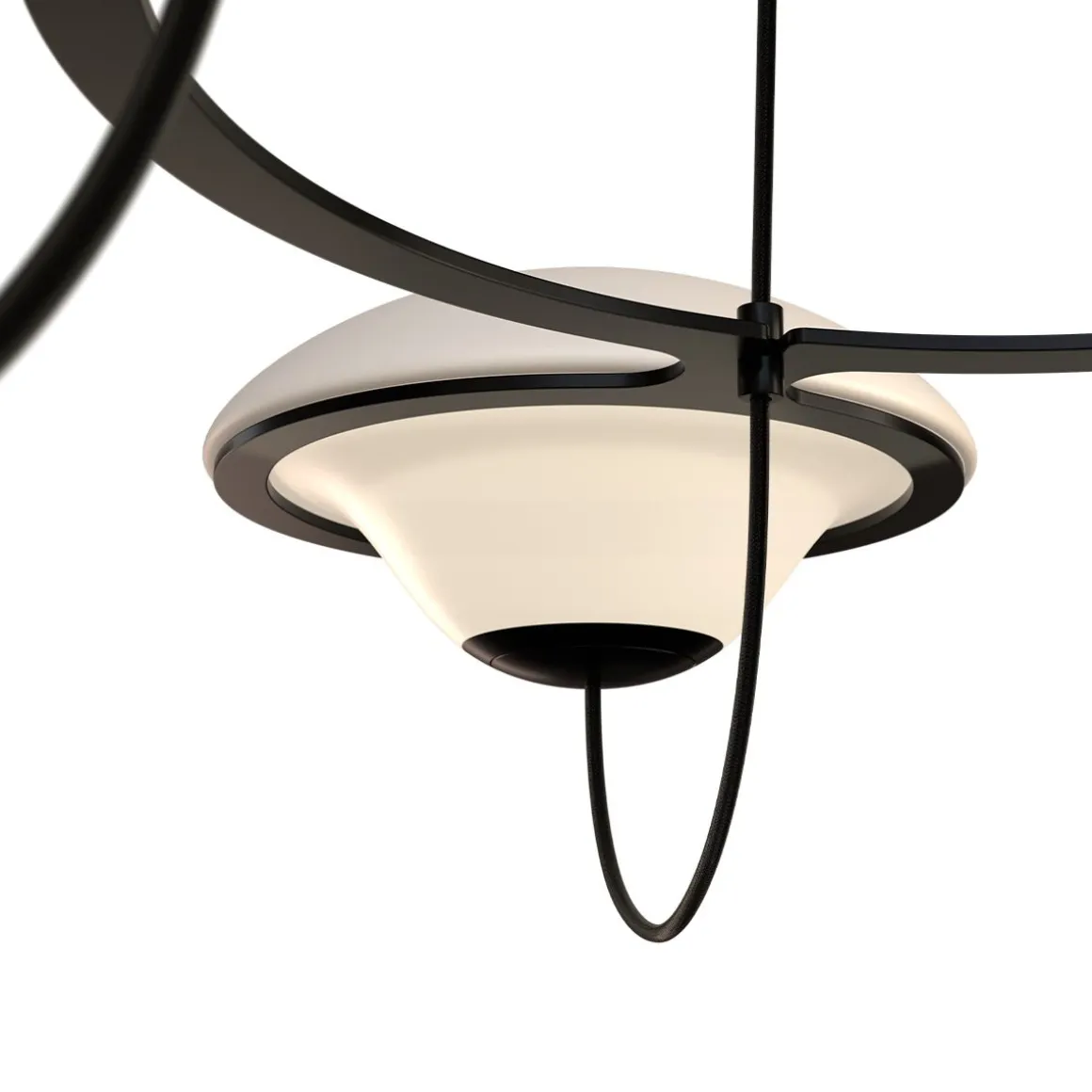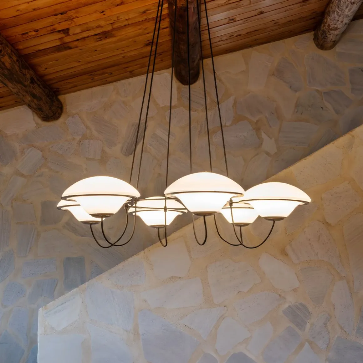 Avec ses lumières « ufoesques », le lustre In the Air créé par Douglas Mont, se revendique de ce répertoire où la fantaisie rétro-futuriste le dispute à une science-fiction nostalgique. Voir et revoir les comics américains ou les films hollywoodiens de série B envahis de soucoupes volantes pour évaluer l’empreinte de cet arsenal lumineux fonctionnant par flotte de trois ou six aéronefs. Lumineux, biomorphique, posé sans ancrage sur des cercles métalliques, à l’instar de quelques lumières totémiques des années soixante italiennes, In the Air se pose en équilibre spatial, profilé telle une aéro-station en lévitation opalescente. Deux poids, deux mesures selon le nombre de lumières, sans en modifier ADN et allure.