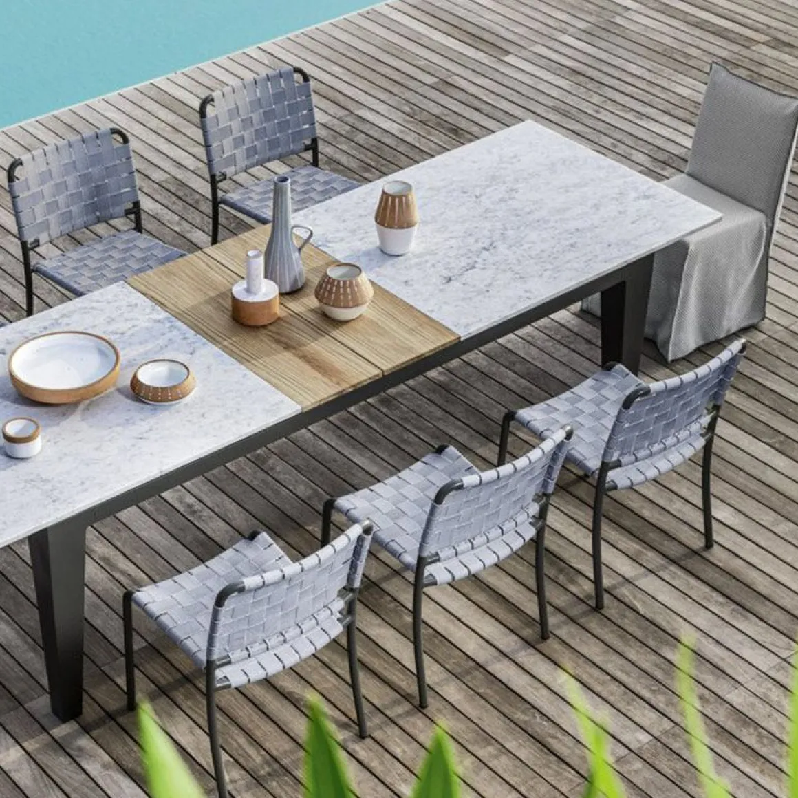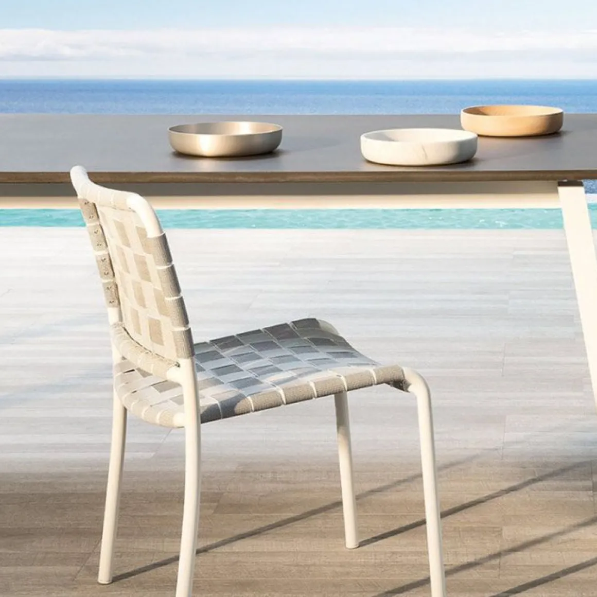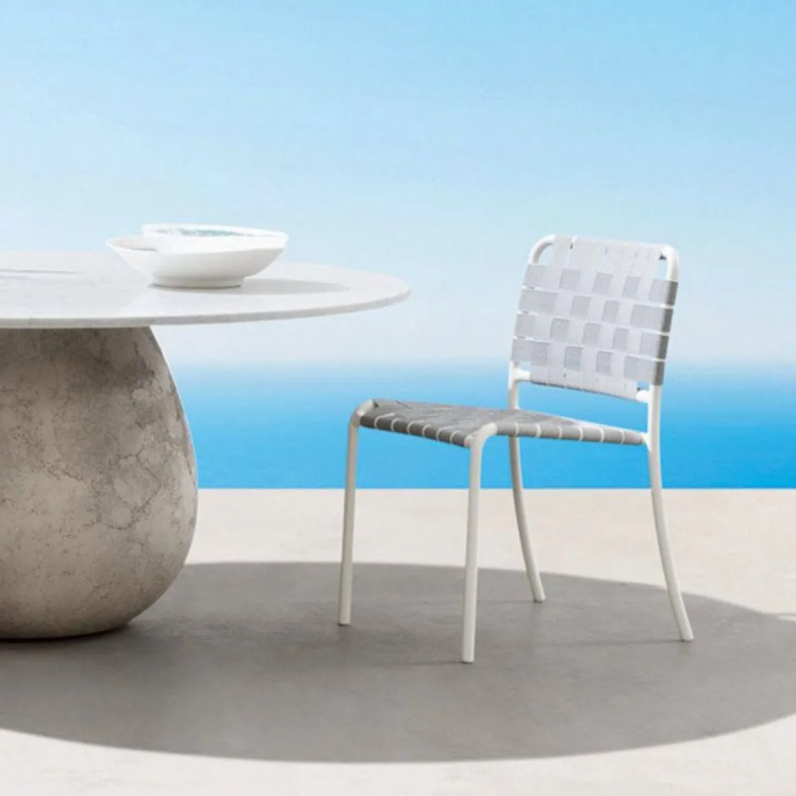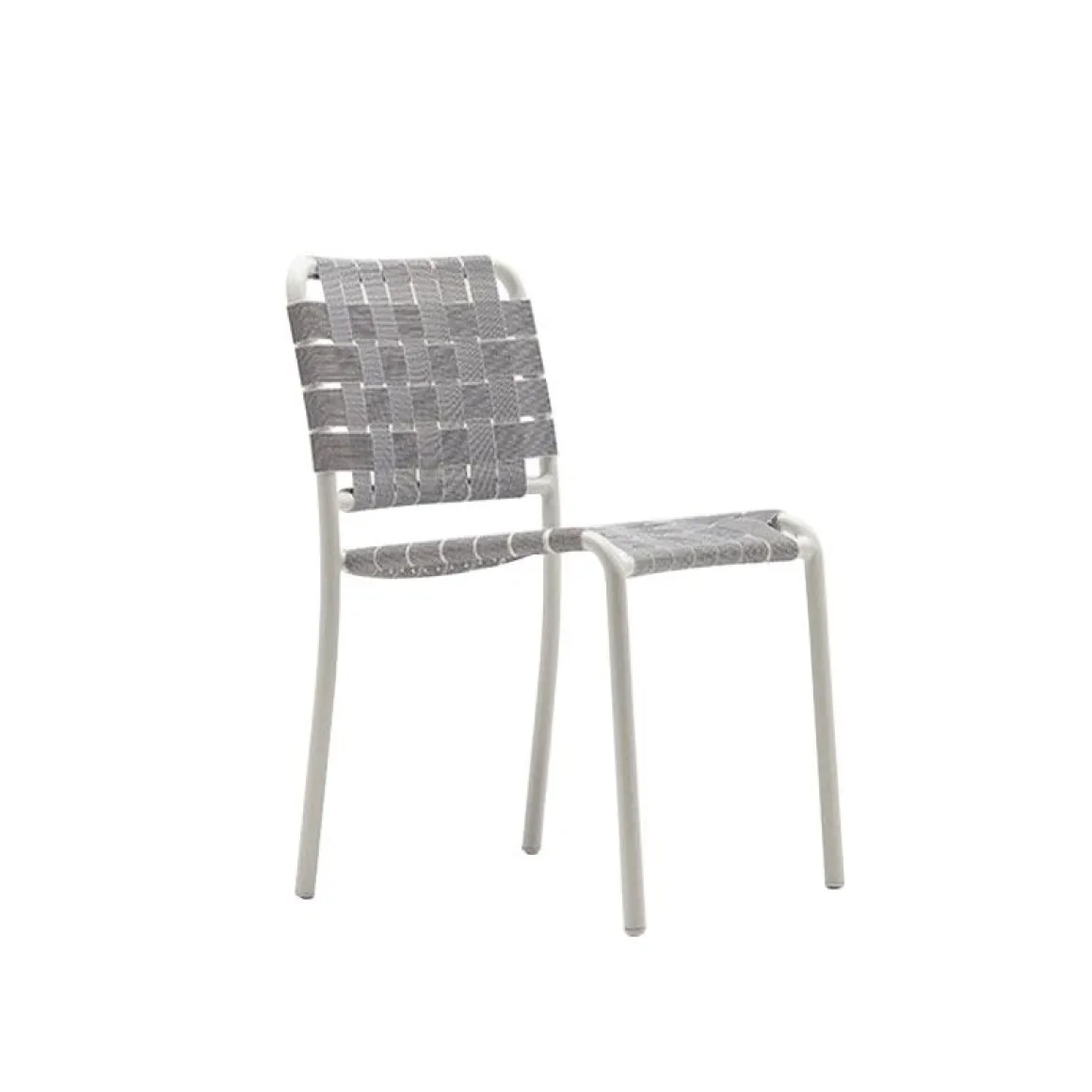 Inout 823 de Gervasoni par Paola Navone. Chaise, structure empilage en aluminium laqué blanc, gris ou sage mat, tressage à sangles élastiques bleu, noir ou gris.