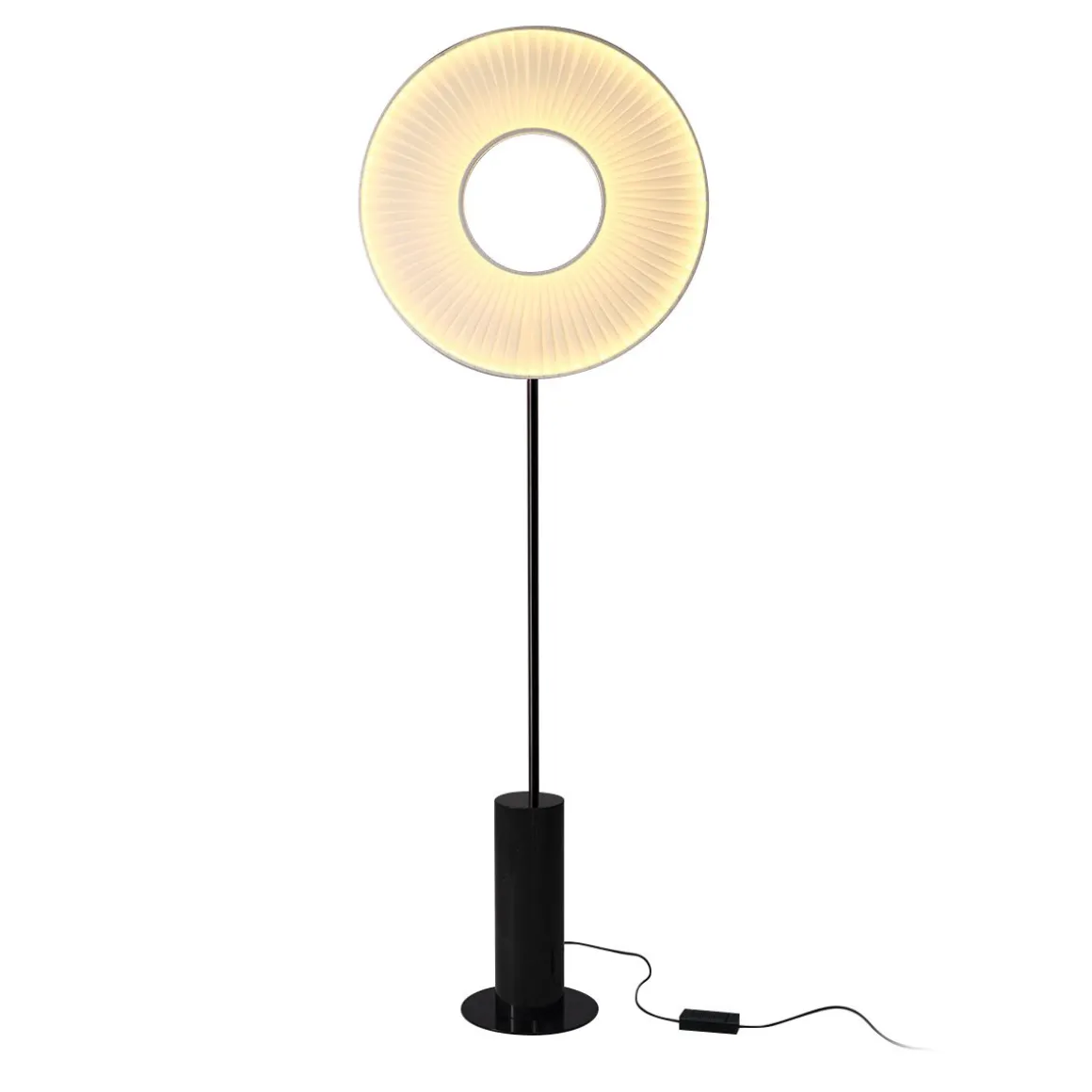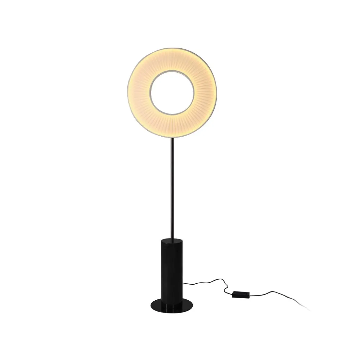 Lampadaire en ruban blanc, mât et platine finition canon de fusil, et base en marbre blanc ou noir.