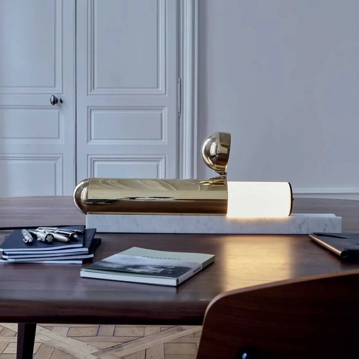 Plus q’une simple lampe de table, l’ISP TABLE est un bijou mécanique posé sur une rampe de marbre.