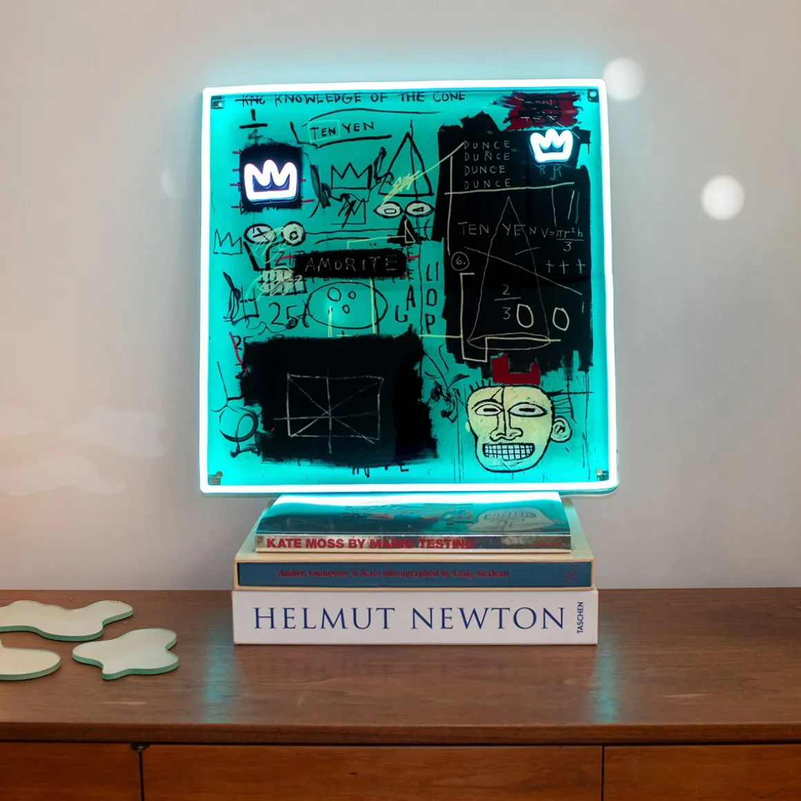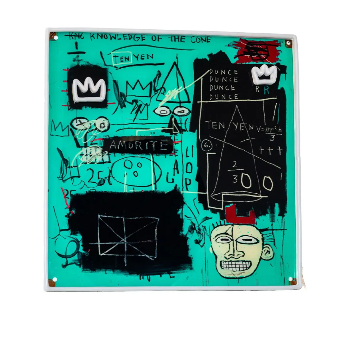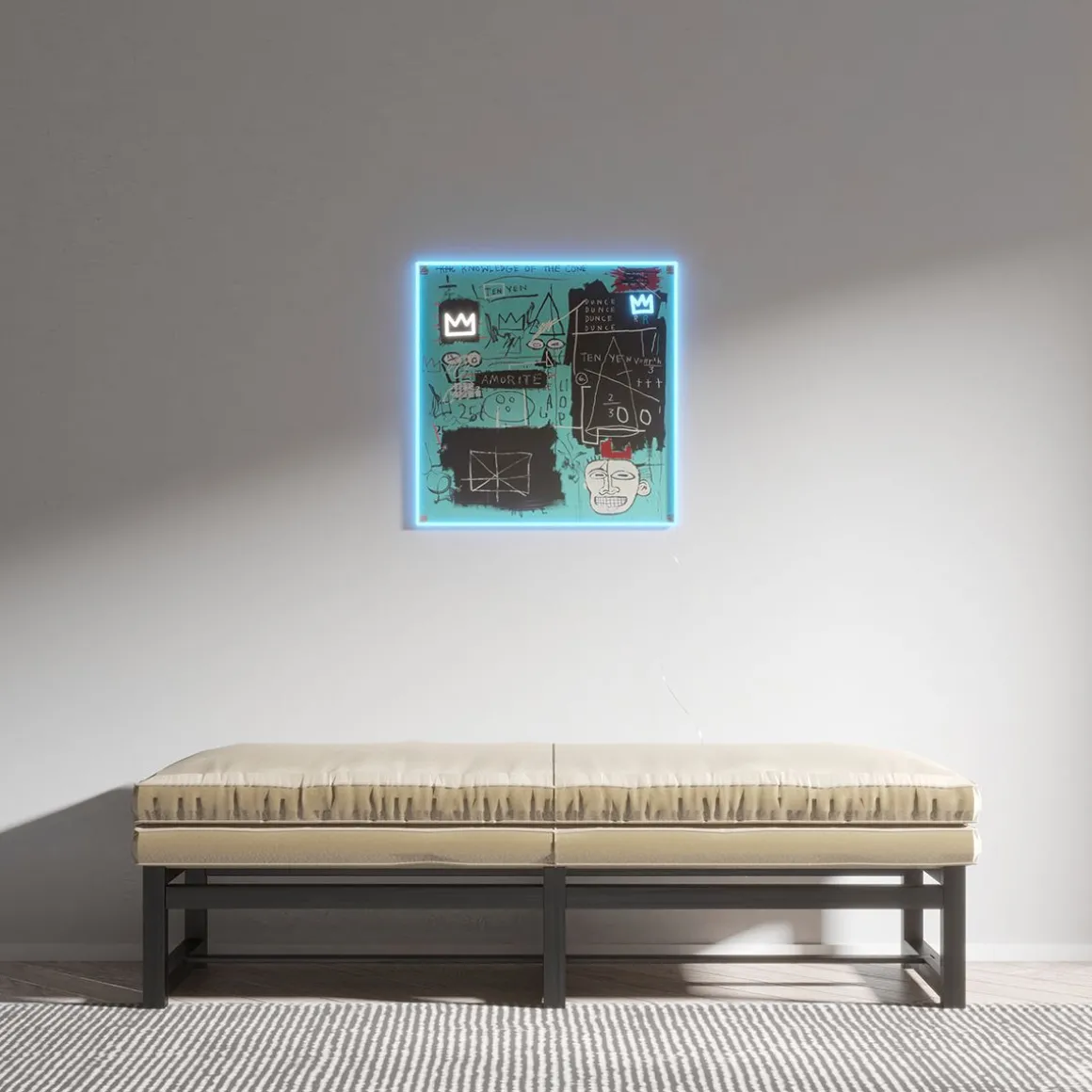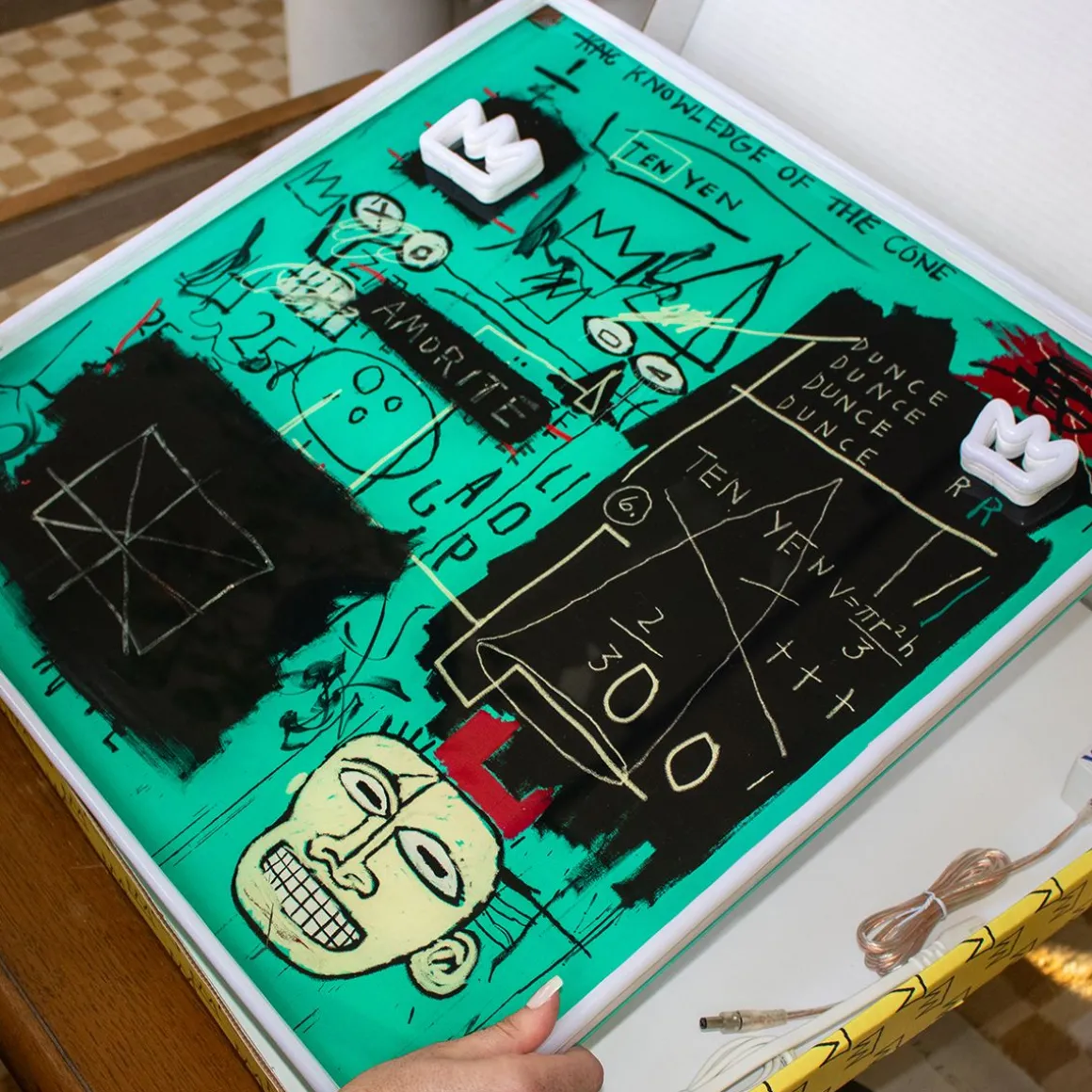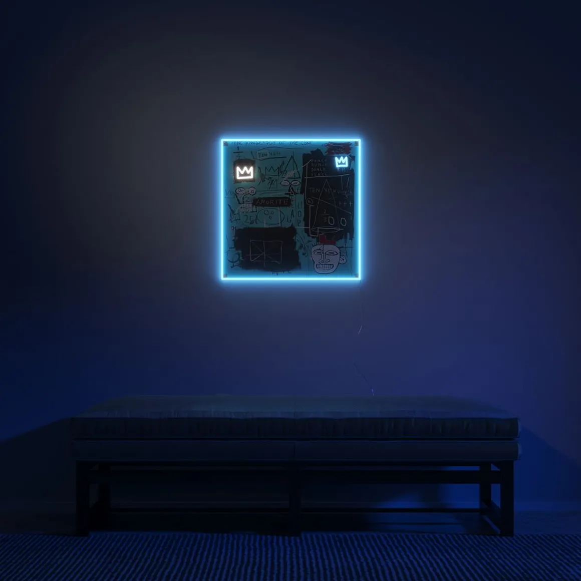 Plongez dans le génie du chef-d’œuvre de Basquiat de 1982 avec l’enseigne néon LED « Equals Pi » de Yellowpop. Irradiant d’une lueur bleue, cette enseigne capture l’essence de sa couronne emblématique et de son visage énigmatique sur fond de gribouillis cryptiques et d’équations mathématiques. Il s’agit d’une œuvre d’art audacieuse qui introduit dans n’importe quelle pièce les commentaires de Basquiat sur la connaissance et le pouvoir, enveloppés dans la mystique de son année la plus convoitée. Il ne s’agit pas d’un simple décor, mais d’une tranche d’histoire de l’art en néon, qui vous invite à réfléchir à la valeur réelle de la sagesse et à l’ironie du bonnet d’âne dans un monde avide d’illumination.