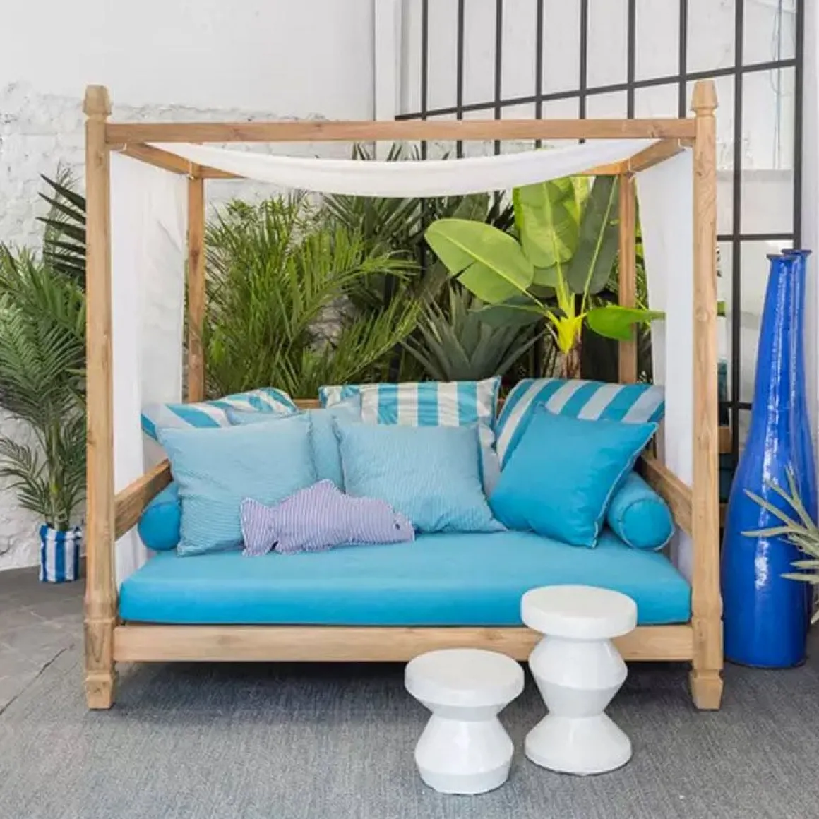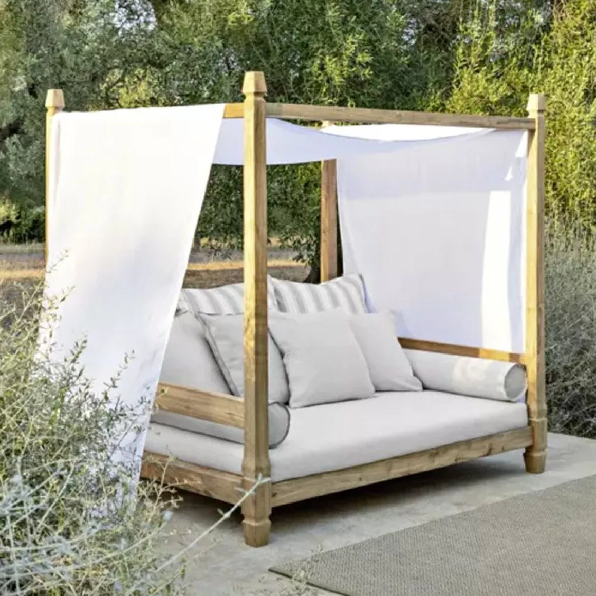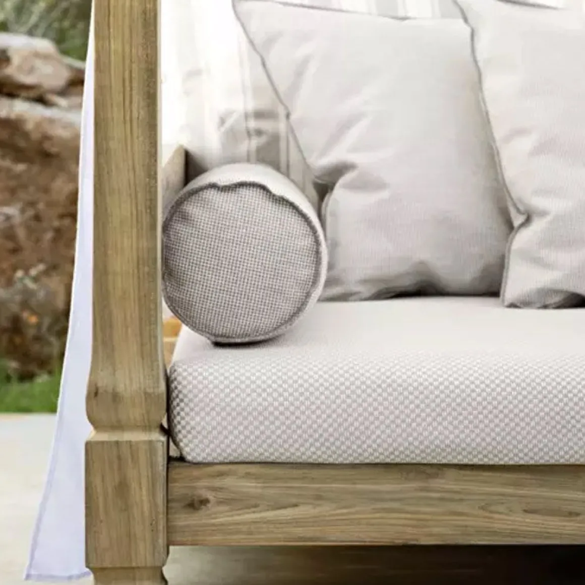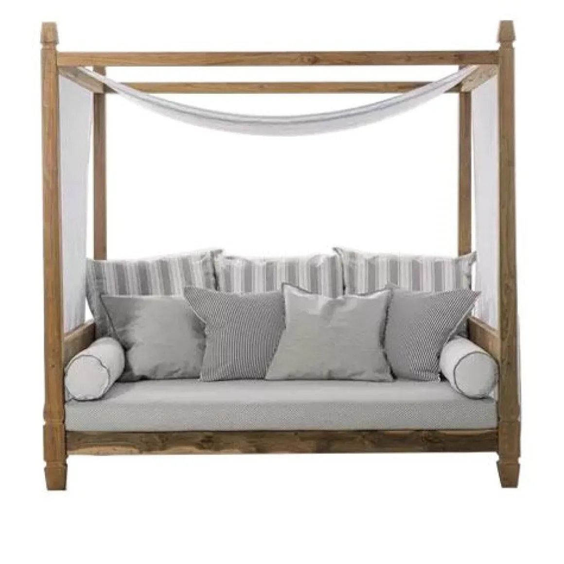 Des quatre coins du canapé partent 4 colonnes en bois qui forment le baldaquin sur lequel est posé un voilage blanc pour d’intimité.