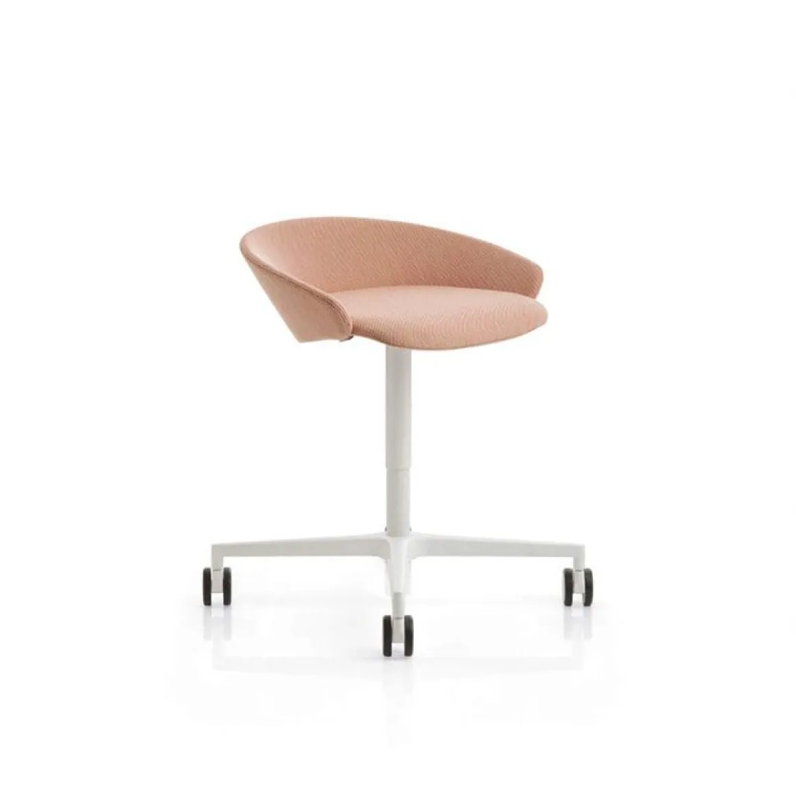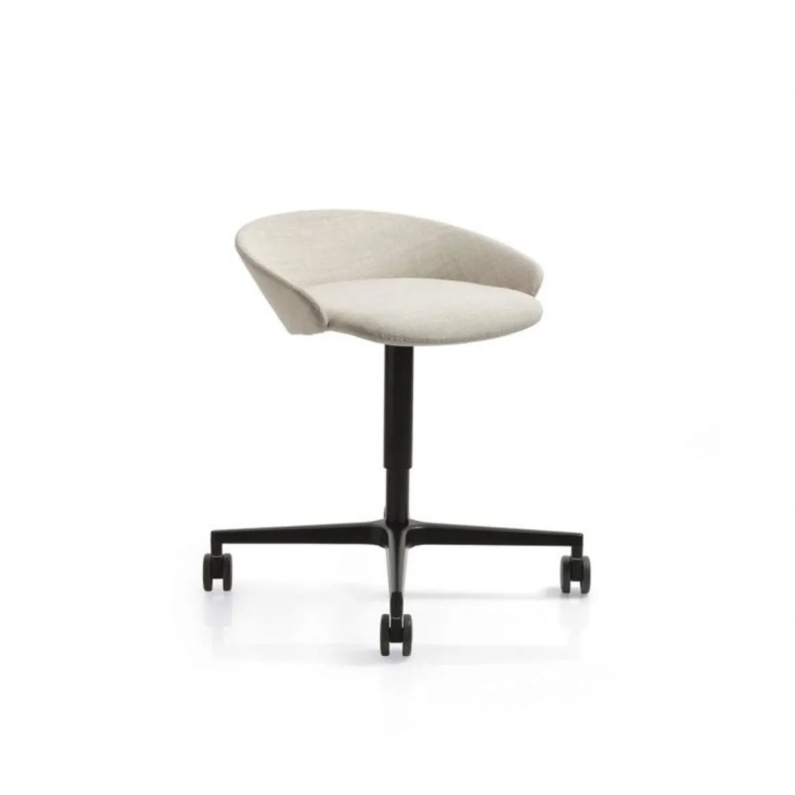 Matériaux : assise et dossier revêtus tissus, structure laqué noir ou blanc, piètement 4 branches avec roulettes