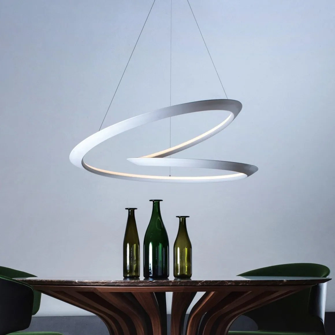 La ligne continue est réalisée à travers un procédé tridimensionnel d’extrusion d’aluminium, dessiné sur la base principe géométrique du ruban mœbius.