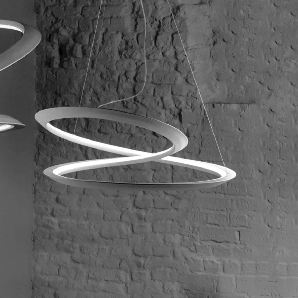 Version petite de la lampe KEPLER Minor Suspension en aluminium extrudé, vernis à poudre. Disponible dans les finitions blanc mat, noir et la nouvelle finition or. La ligne continue est réalisée à travers un procédé tridimensionnel d’extrusion d’aluminium, dessinée sur la base du principe géométrique du ruban de Moebius.