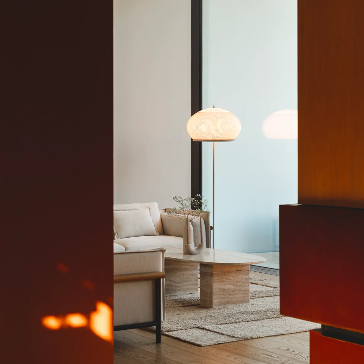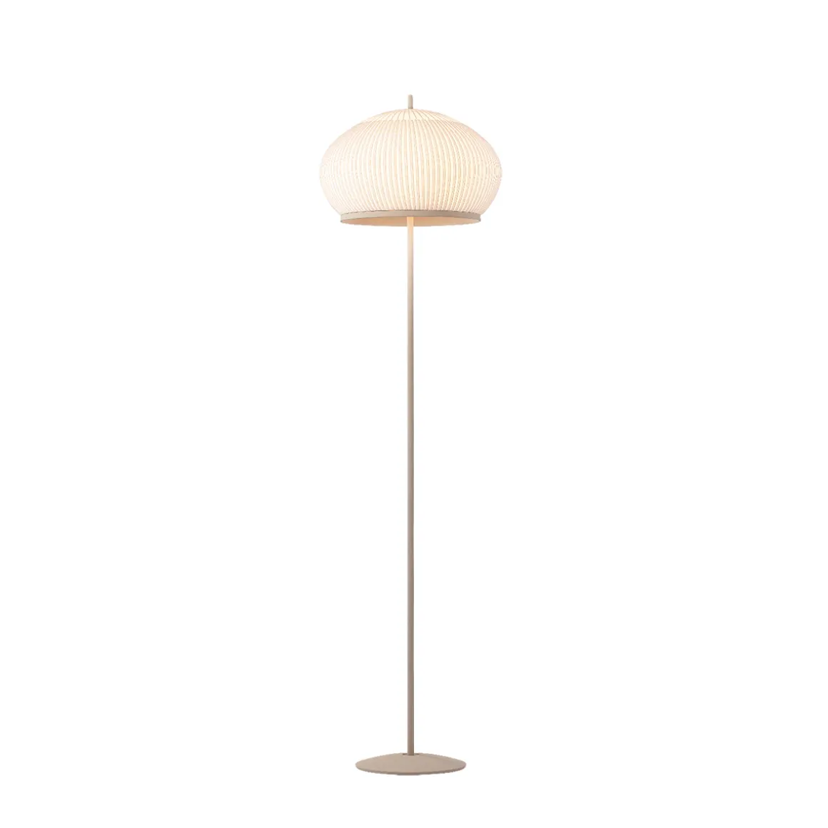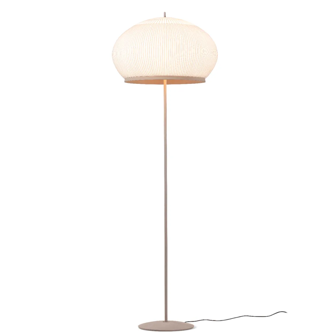 Knit de Vibia par Meike Harde. Forme, matière et présence sont les maîtres-mots du lampadaire Knit. Sa texture, magnétique, invite à s’en approcher et à y poser les doigts pour ressentir sa chaleur. La lumière s’échappe de l’abat-jour textile du lampadaire Knit et filtre vers le bas depuis le diffuseur translucide qui en atténue la luminosité. Les deux couleurs de fils du tissage, associées à l’effet magique des différents niveaux d’intensité, dessinent une matrice hypnotique aux teintes subtiles, qui vont du gris chaud à l’ocre, en passant par des nuances cuivrées et rose léger.