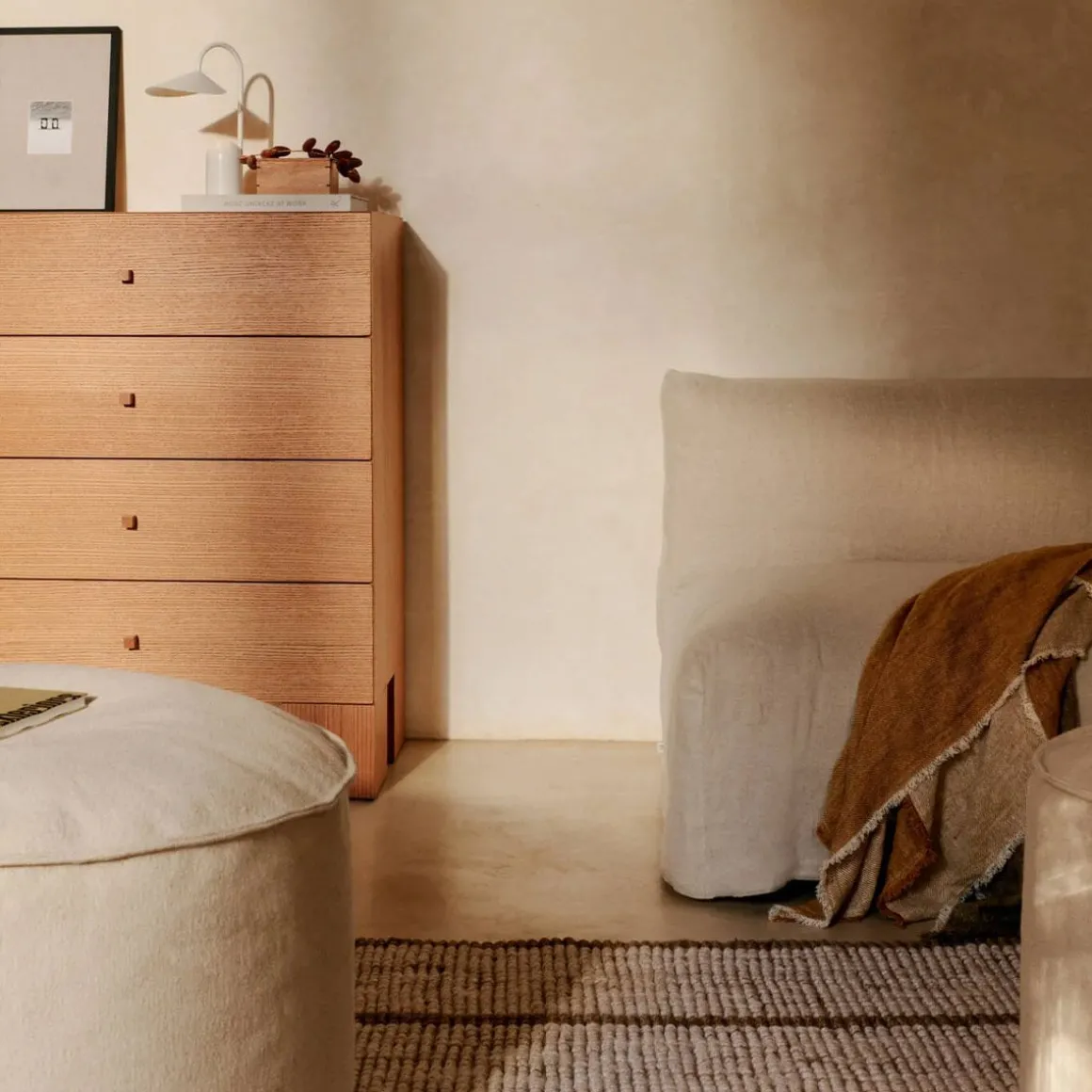 Kuben de Ferm Living. La commode Kuben est fabriqué en placage chêne naturel certifié FSC®. Sa forme cubique anguleuse et son assemblage à l’onglet créent l’illusion d’une boîte sans raccords, tandis que les pieds surdimensionnés en forme de cube apportent un caractère audacieux. Les poignées délicates apportent une touche raffinée, renforçant l’intrigue ludique du design. Alliant efficacement fonctionnalité et esthétique minimaliste, il offre un espace de rangement généreux pour les vêtements et autres articles essentiels.