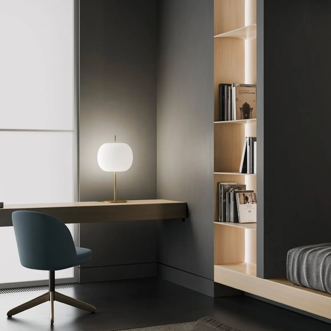 La lampe de table Kushi XL surélève le diffuseur grâce à une tige conique, sa silhouette est gracieuse, elle a une forte personnalité.