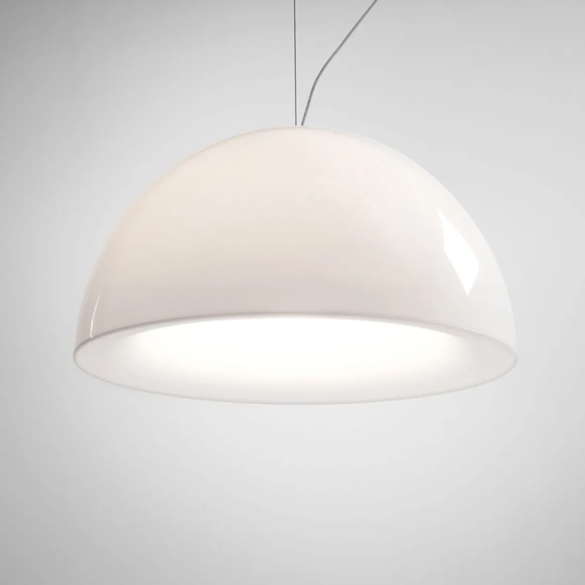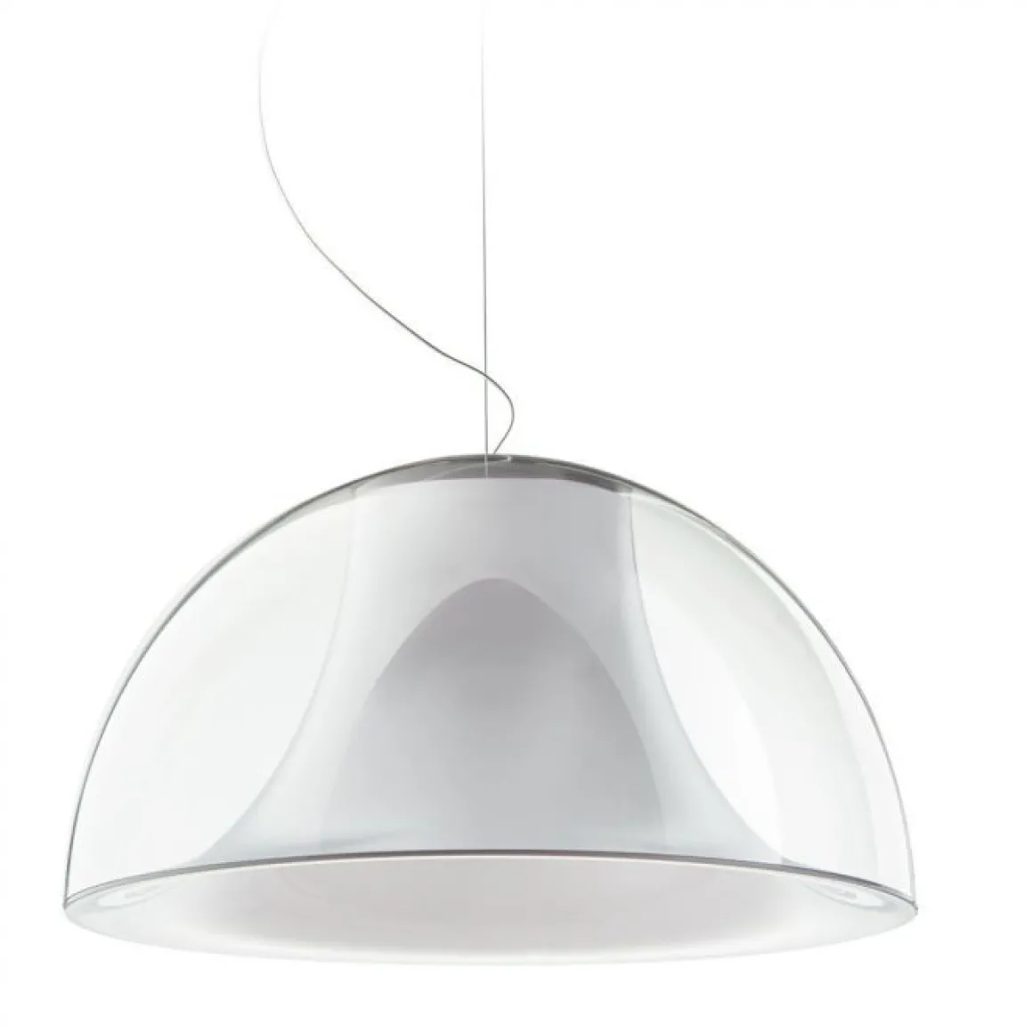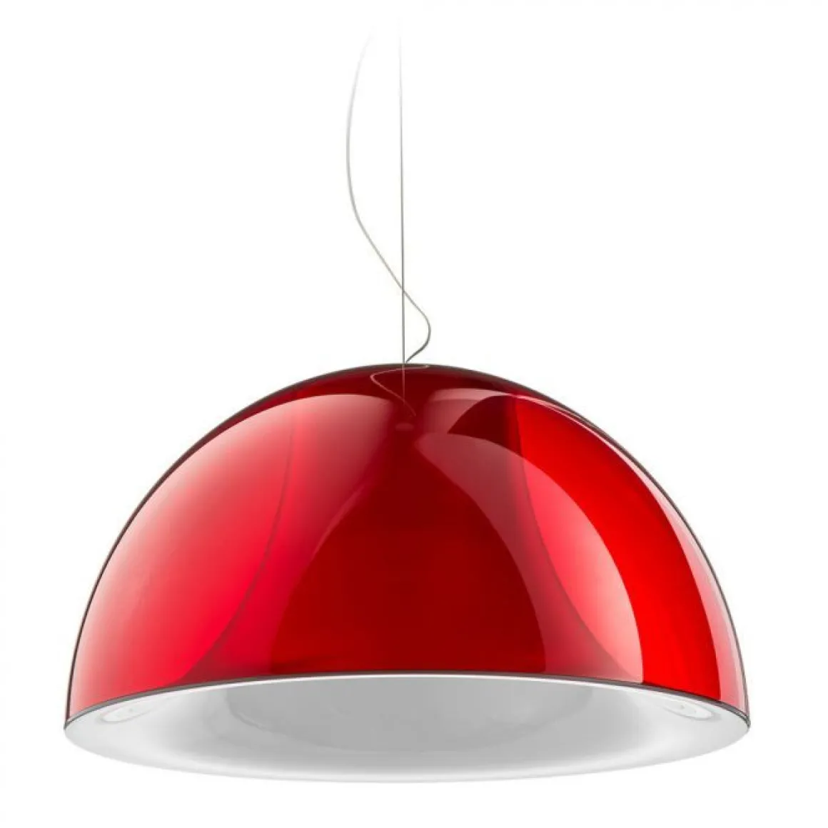Lampe à suspension avec diffuseur extérieur Ø 520 mm en polycarbonate coloris transparent, rouge et jaune transparent. Le diffuseur intérieur, en polycarbonate coloris opaline, sert à protéger l’ampoule et répandre la lumière en manière diffuse. La lampe est disponible même avec diffuseur coloris plein blanc et noir. Le diffuseur intérieur est toujours seulement blanc.