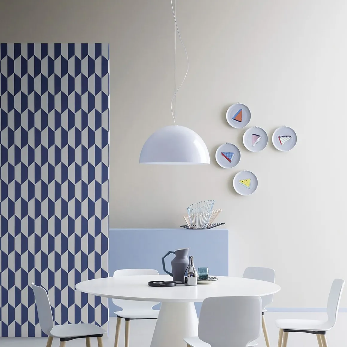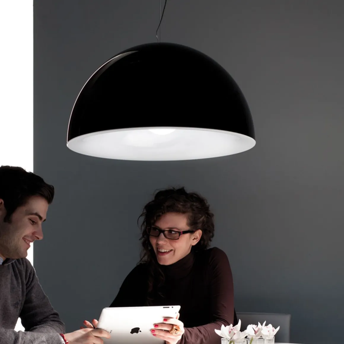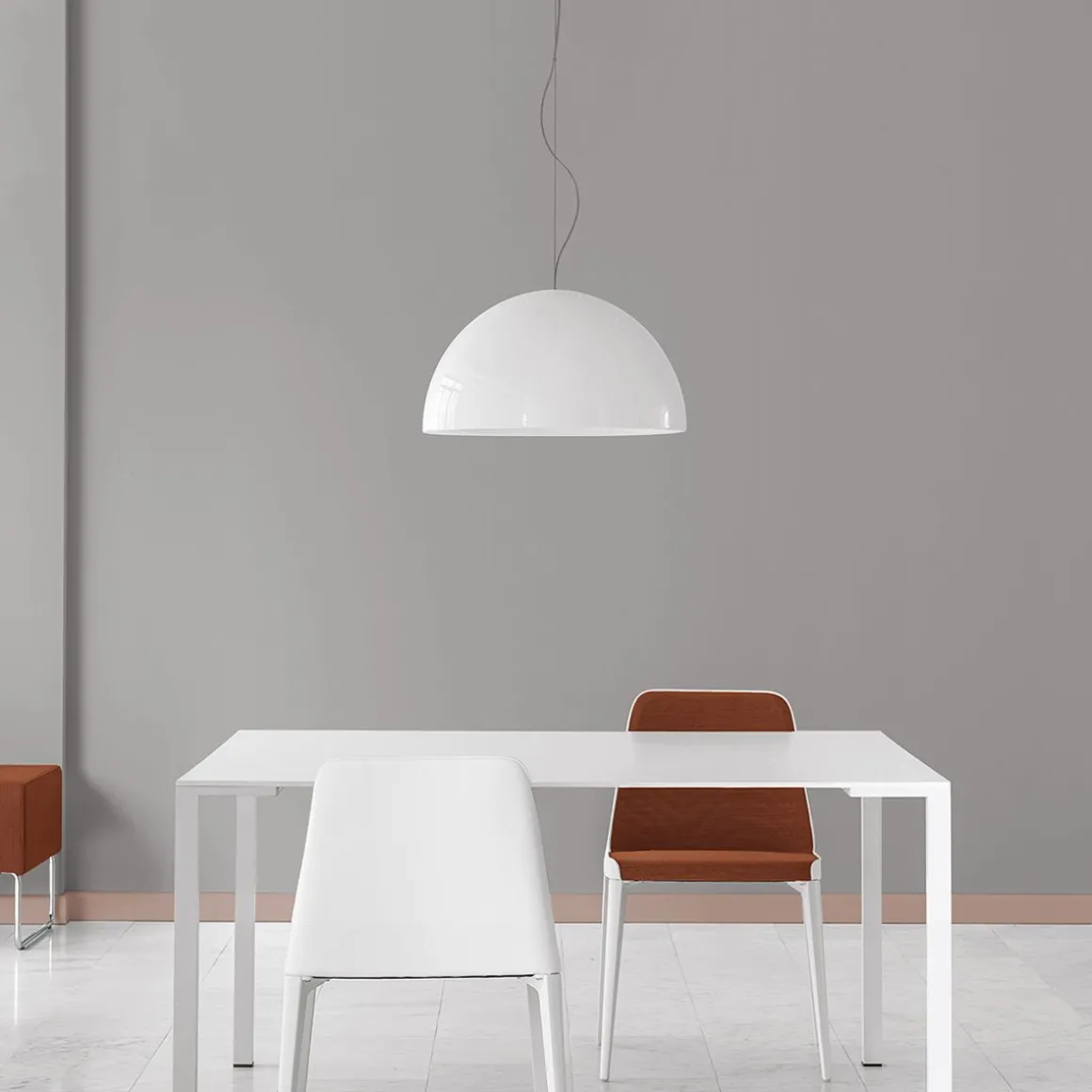 Lampe à suspension avec diffuseur extérieur Ø 520 mm en polycarbonate coloris transparent, rouge et jaune transparent. Le diffuseur intérieur, en polycarbonate coloris opaline, sert à protéger l’ampoule et répandre la lumière en manière diffuse. La lampe est disponible même avec diffuseur coloris plein blanc et noir. Le diffuseur intérieur est toujours seulement blanc.