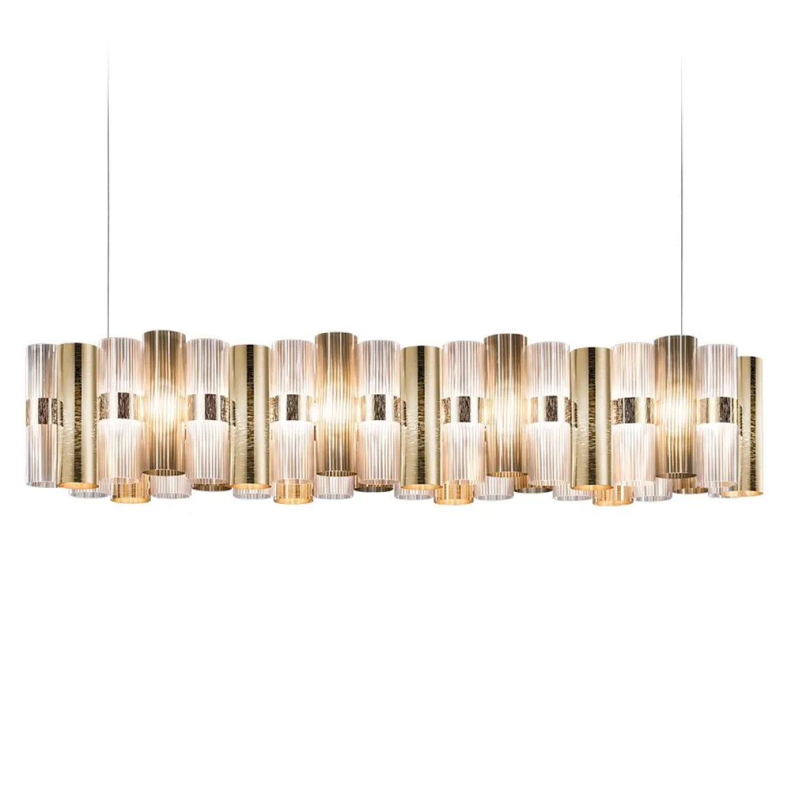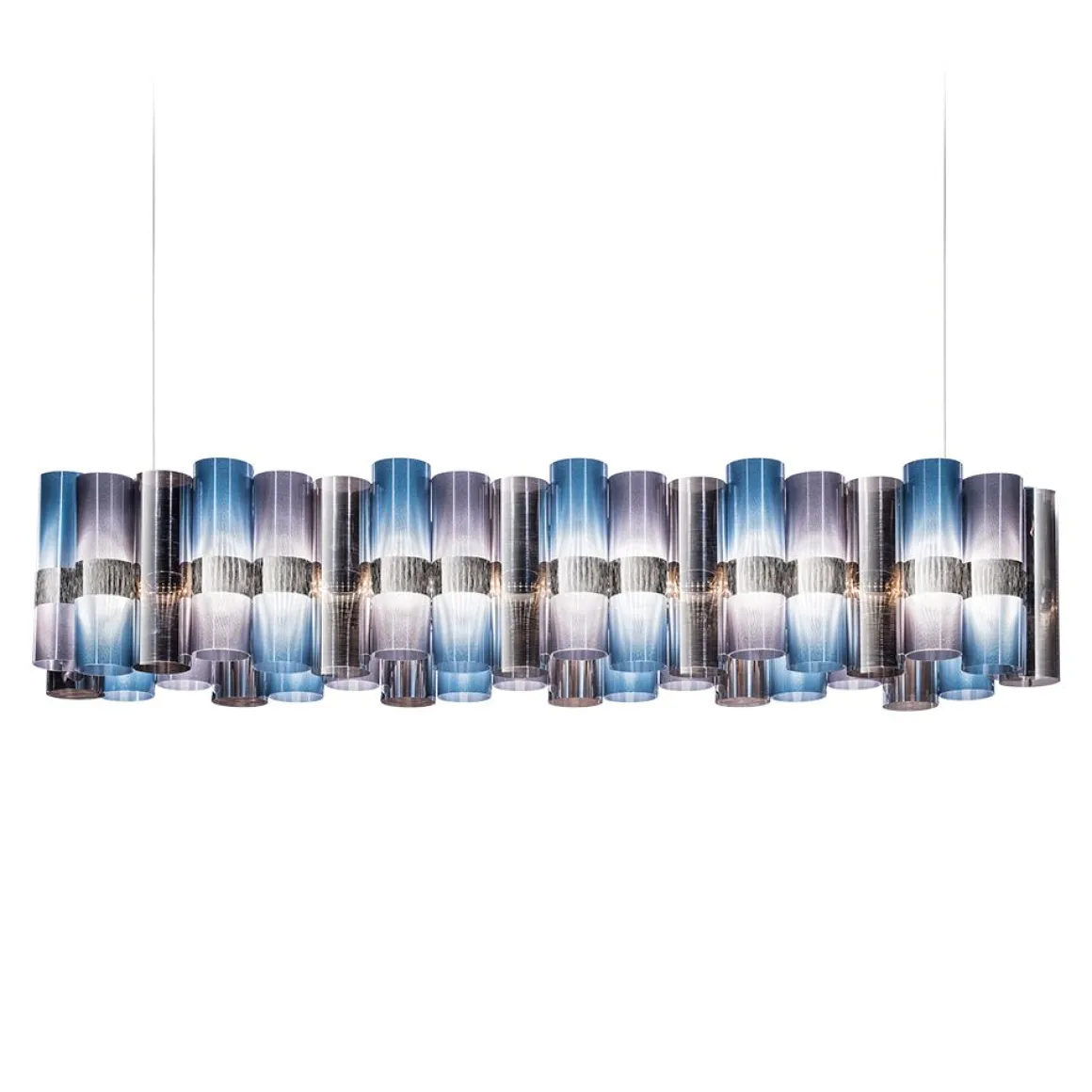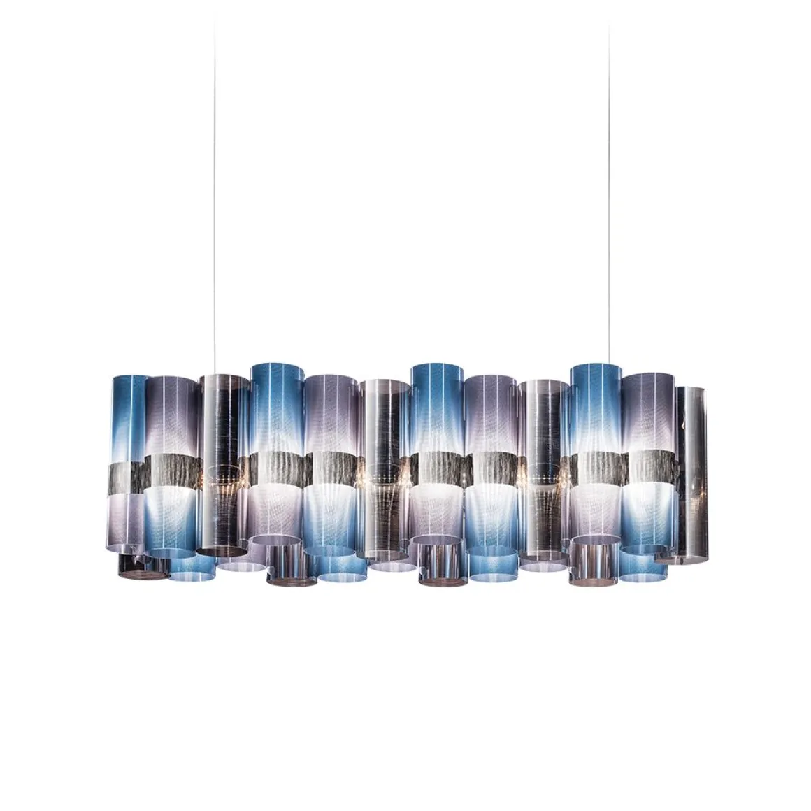 La suspension La Lollo linear est un hommage aux grondement des années 50, une série de suspension gracieuses qui réveillent des images de divas sous les projecteurs. Les cylindres en technopolymère, dans des nuances variées de métallisation prismatique contemporaine et de motifs géométriques, alternent autour d’un anneau central éclairé. La collection comprend 2 tailles, ainsi qu’un lustre opulent, tous conçus pour les espaces publics ou domestique, ou à combiner dans des installations dramatiques.