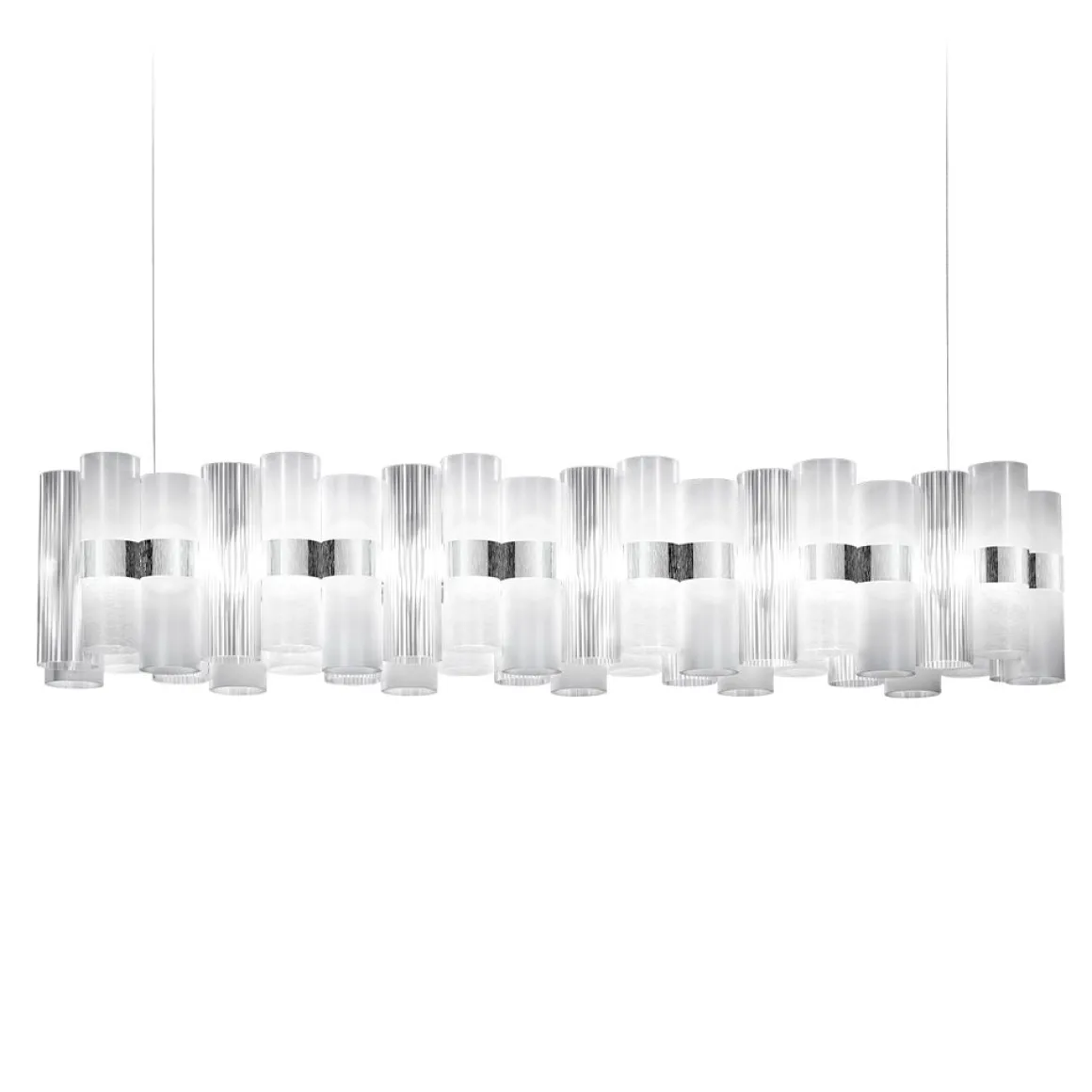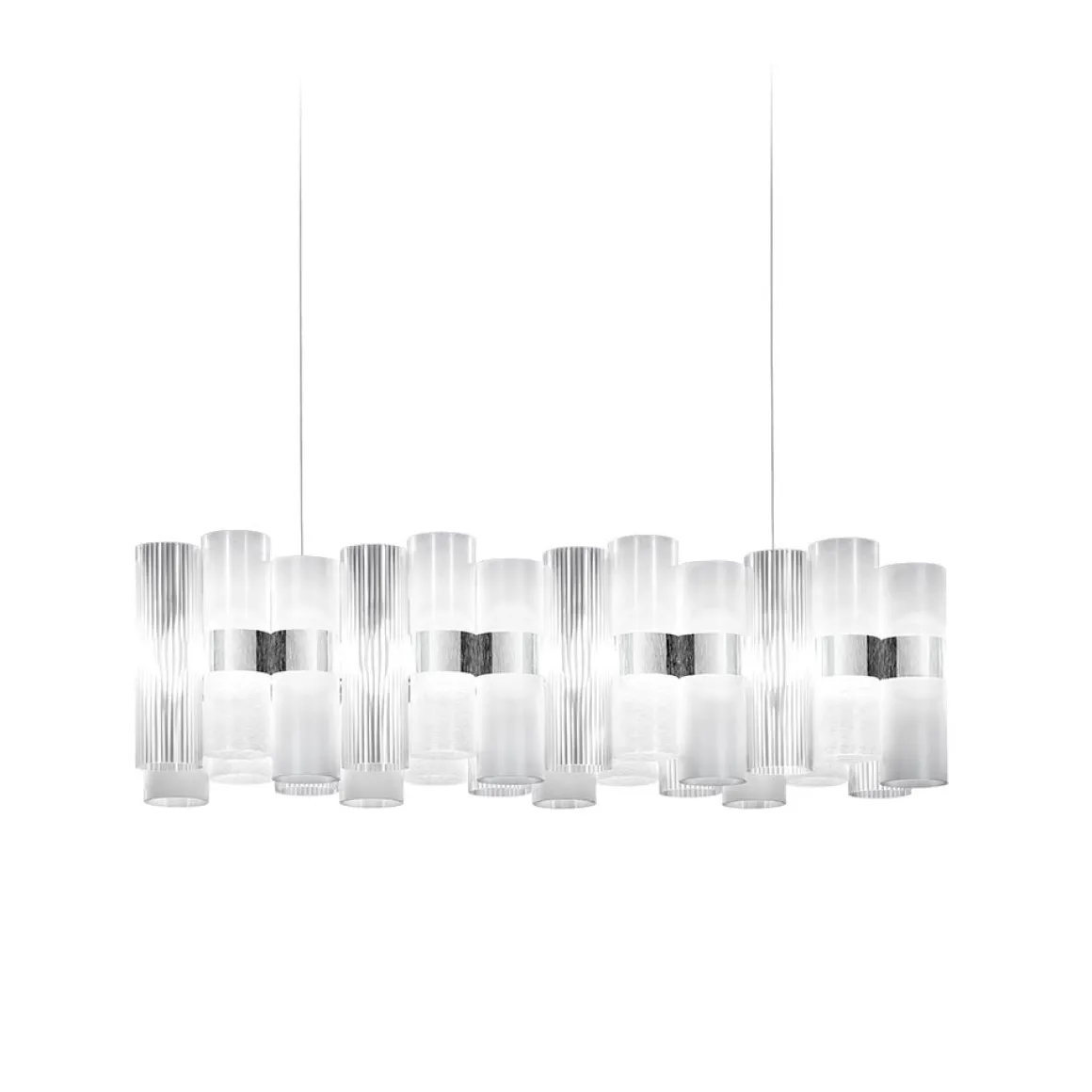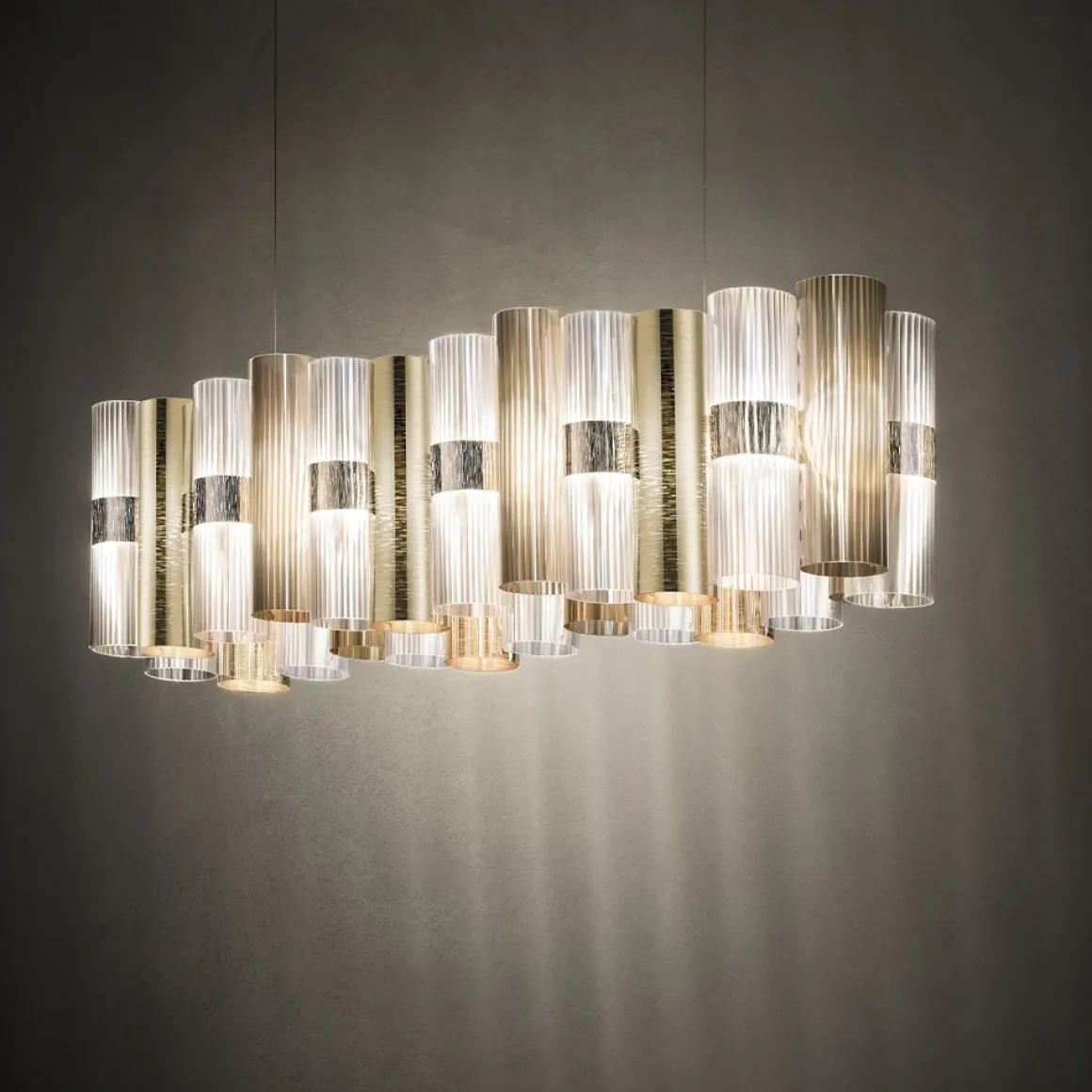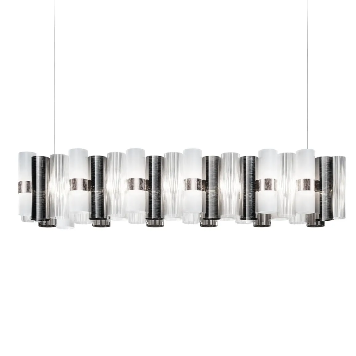 La suspension La Lollo linear est un hommage aux grondement des années 50, une série de suspension gracieuses qui réveillent des images de divas sous les projecteurs. Les cylindres en technopolymère, dans des nuances variées de métallisation prismatique contemporaine et de motifs géométriques, alternent autour d’un anneau central éclairé. La collection comprend 2 tailles, ainsi qu’un lustre opulent, tous conçus pour les espaces publics ou domestique, ou à combiner dans des installations dramatiques.