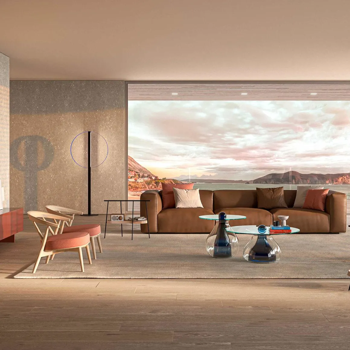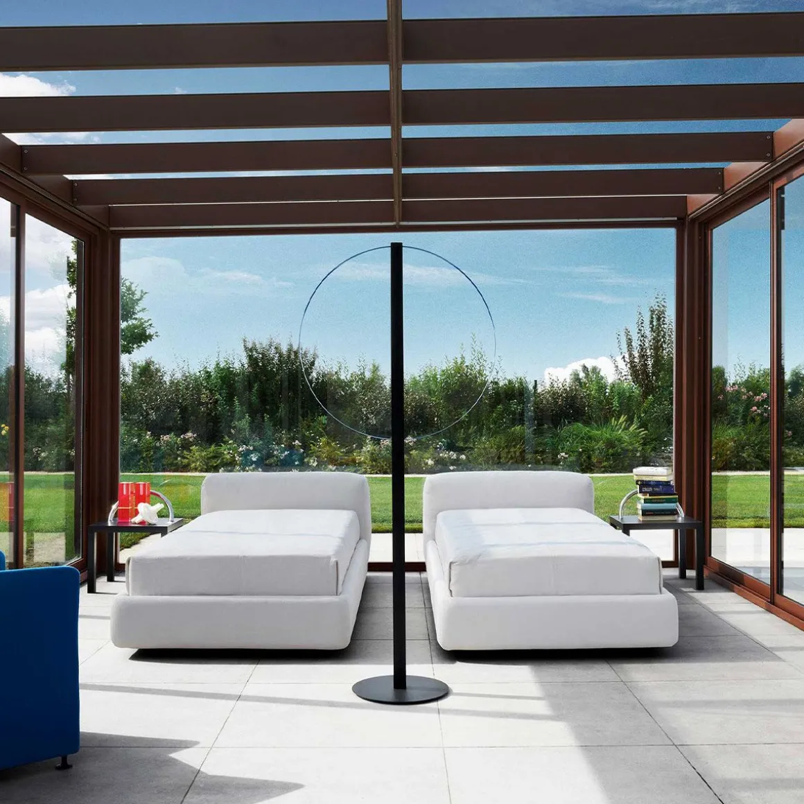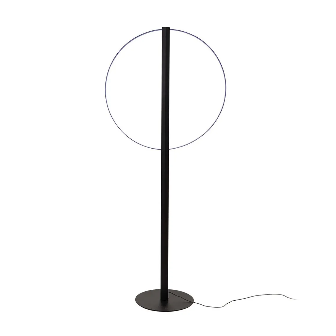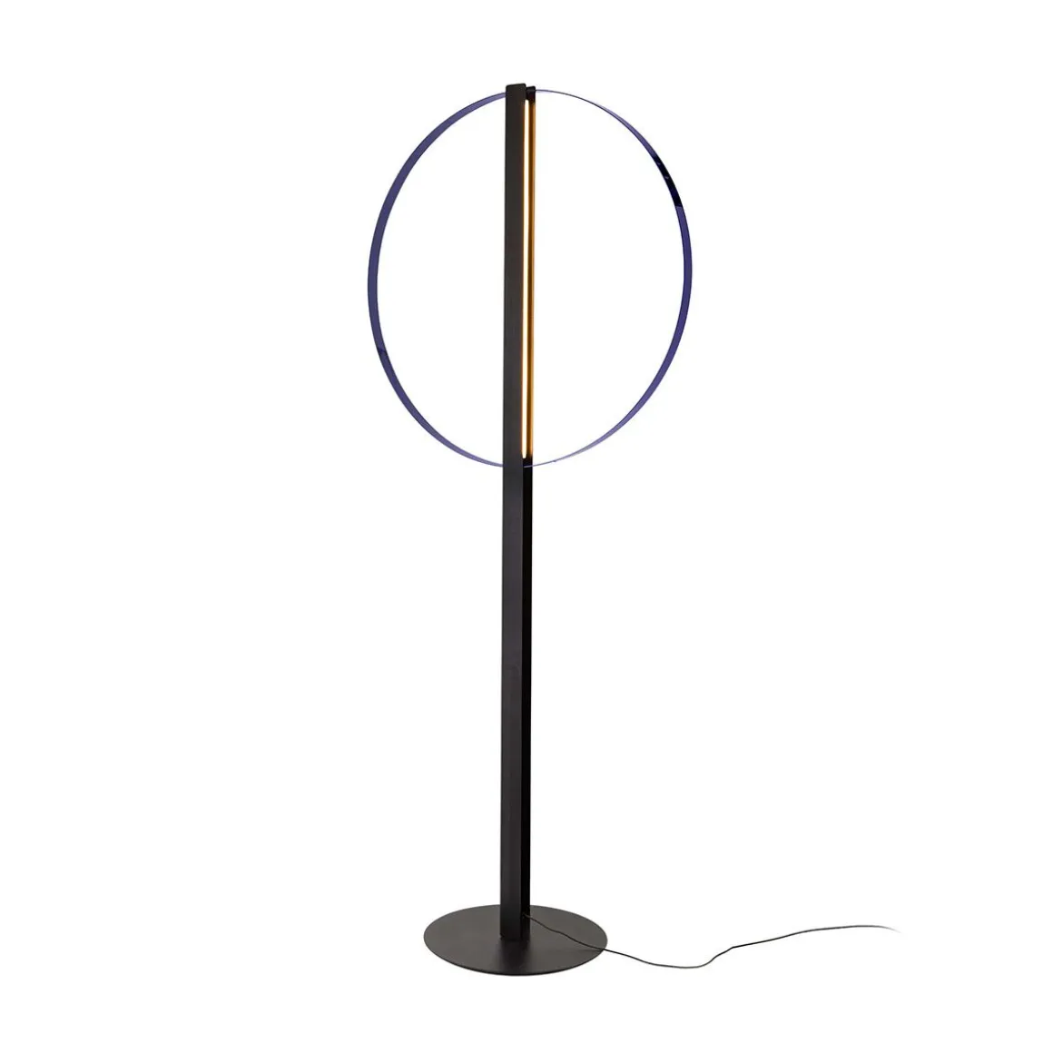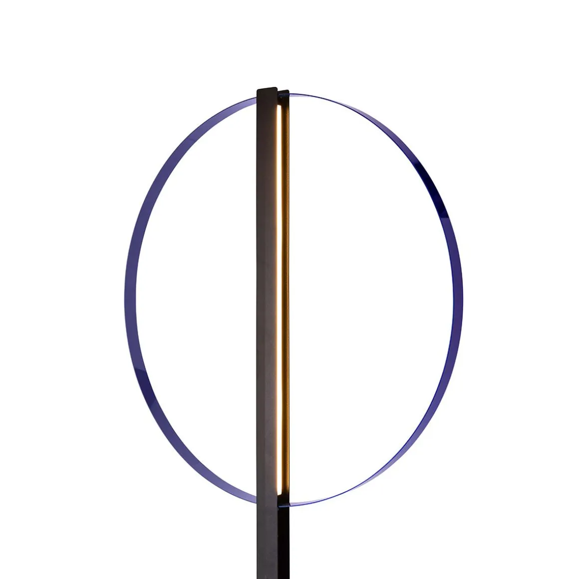 Conçue par le studio suisse Panter & Tourron et présentée pour la première fois en 2022 comme prototype dans la version unique au sol, en 2023 la famille Lampada da Appartamento fait officiellement partie de la collection Cappellini avec à la fois la version au sol et la nouvelle version murale spectaculaire. La structure des lampes est composée d’un élément métallique vertical, peint en noir mat, et de deux arceaux métalliques en finition bleu métallisé : les deux bandes LED à l’intérieur de l’élément central réfléchissent la lumière sur les arcs, créant un anneau lumineux parfait. Caractérisée par sa forme géométrique circulaire, Lampada da Appartamento est un objet minimal aux dimensions immenses, capable de meubler n’importe quel environnement de manière très sculpturale.