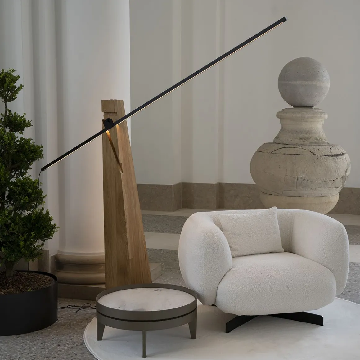 L’épopée chevaleresque inspire le nouveau lampadaire Astolfo, une union entre la force ancestrale du bois et de la technologie LED (3000K CRI> 85). Sa base est en noyer massif.