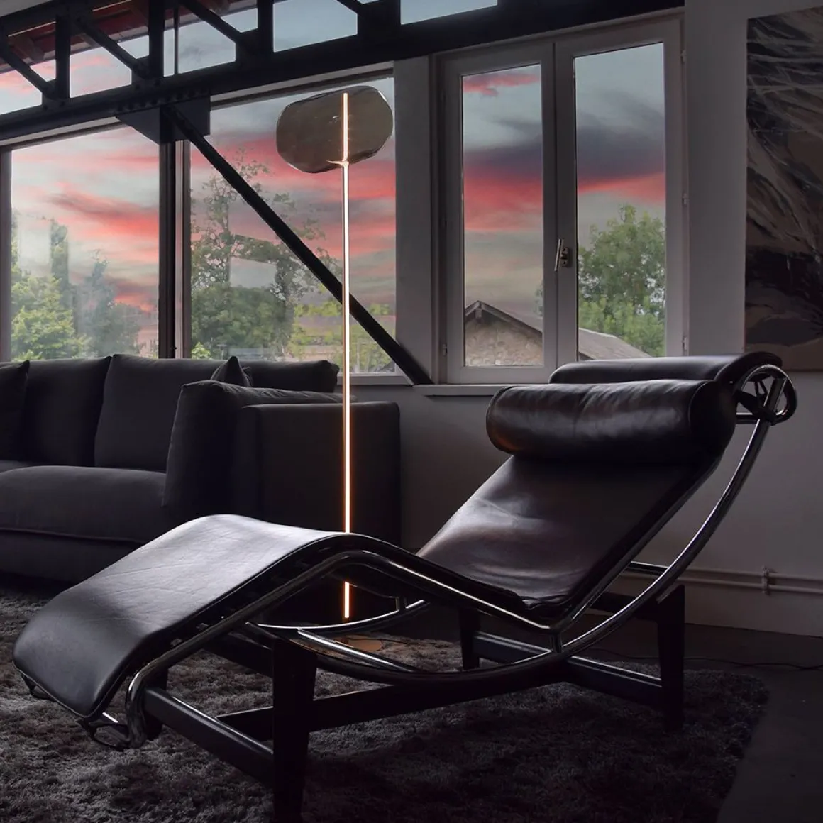 Le lampadaire design G-222 combine un style minimaliste et aérien. Le lampadaire à éclairage variable se compose d’un tube en aluminium rainuré d’où s’extrait une lumière discrète et fonctionnelle et d’un galet de verre italien soufflé à la bouche. Ce galet interchangeable s’ajuste selon vos envies mais également aux ambiances de votre intérieur.