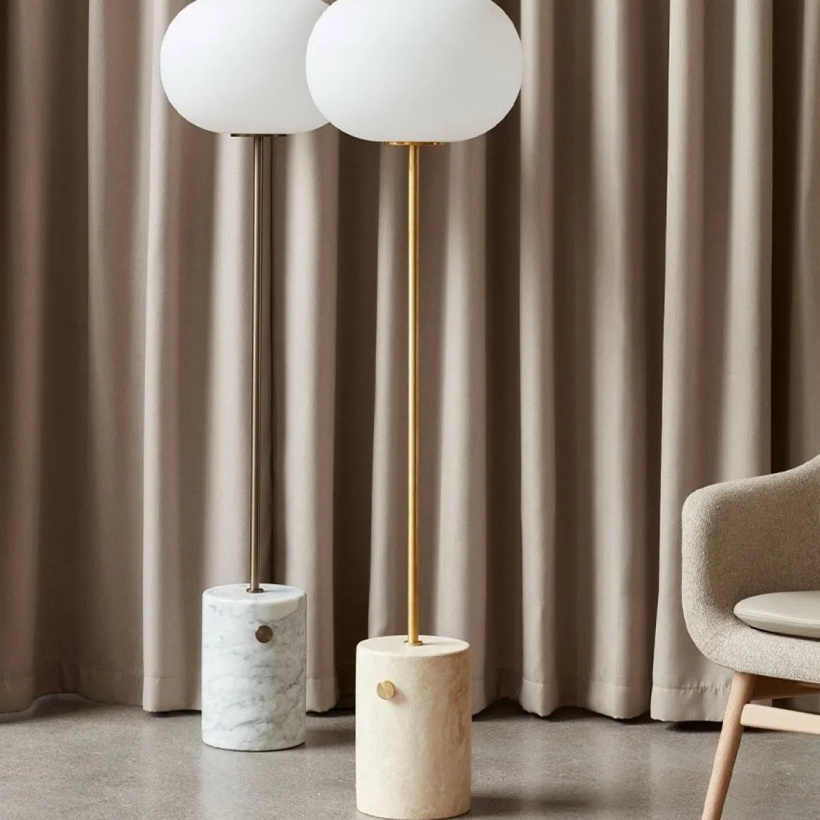 Retravaillant les dimensions de la lampe de table JWDA pour créer une lumière épurée avec une personnalité audacieuse, le lampadaire est le dernier ajout à la série. Le design simple et autonome fusionne les éléments contrastés pour un effet élégant: fixé sur une tige en laiton bronzé, brossé ou massif, l’abat-jour est formé de verre opale dans une forme elliptique, tandis que la base conserve sa forme caractéristique, fabriquée en marbre avec des arrondis doux bords et ponctués d’un gradateur décoratif en laiton brossé ou bronzé.