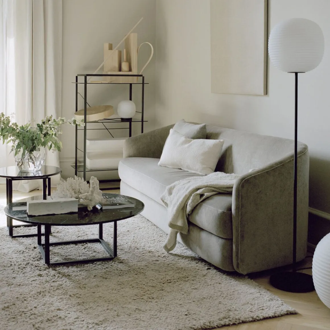 Apportant l’éclairage doux de son prédécesseur suspendu, le lampadaire Lantern et la lampe de table Lantern complètent cette famille emblématique. Inspirées des lanternes chinoises traditionnelles en papier de riz, leurs formes en verre dépoli reproduisent cette lueur en apesanteur. Gardant fermement cette forme sculpturale au centre de la scène, une simple base en acier noir rehausse sa lueur chaleureuse.