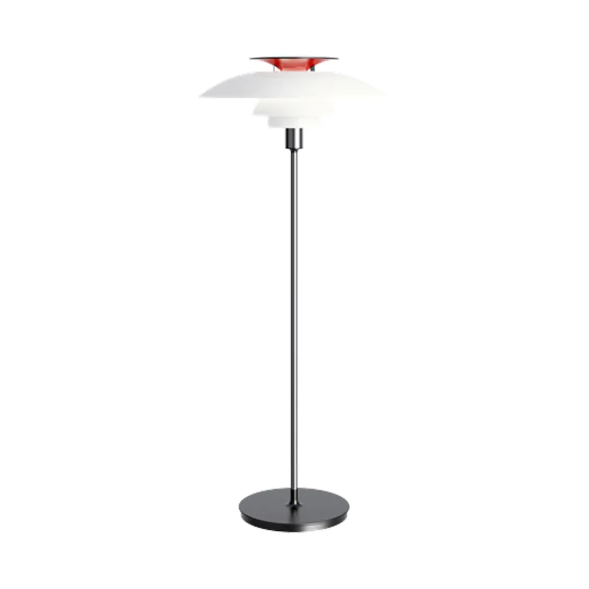 Ce luminaire émet une lumière diffuse et symétrique. La majeure partie de la lumière est dirigée vers le bas et les abat-jour en acrylique opalisé fournissent un éclairage confortable à la pièce. La teinte rouge du réflecteur supérieur donne à la lumière un éclat plus chaleureux.