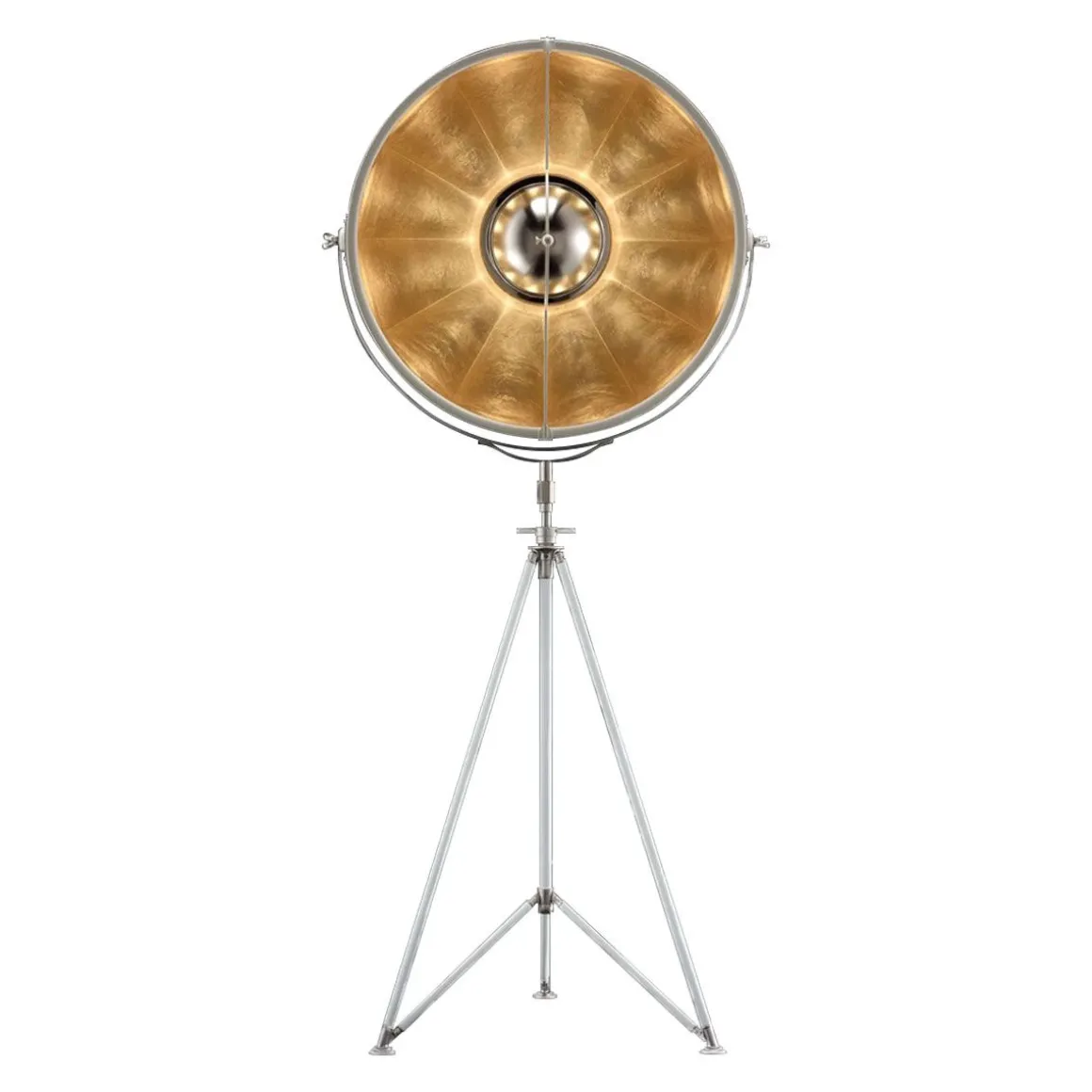 La lampe sur pied Fortuny® Tripod avec abat-jour en aluminium et structure en acier offre une capacité de pivotement et d’inclinaison de 360 degrès. La lumière est indirecte et diffuse.