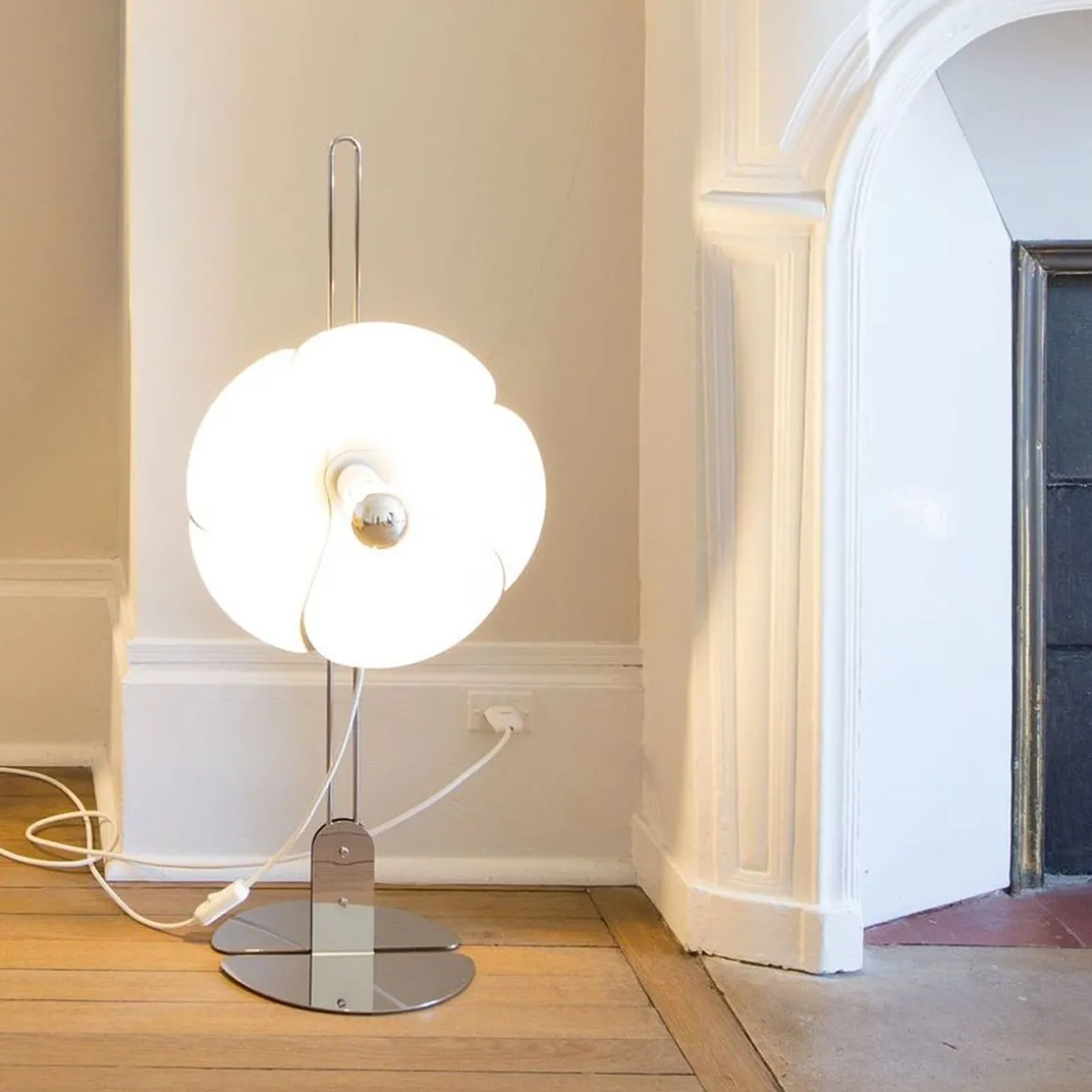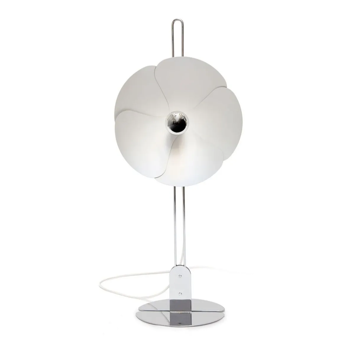 En 1967, Olivier Mourgue invente un appareil d’éclairage en forme de fleur en pétales d’aluminium fixé sur deux fils en métal chromé pour donner des appliques, des plafonniers, des lampes ou des lampadaires. Il utilise cette nouvelle ampoule de l’époque dotée d’une calotte argentée qui permet de produire une lumière réfléchie et donc un éclairage de très belle qualité.