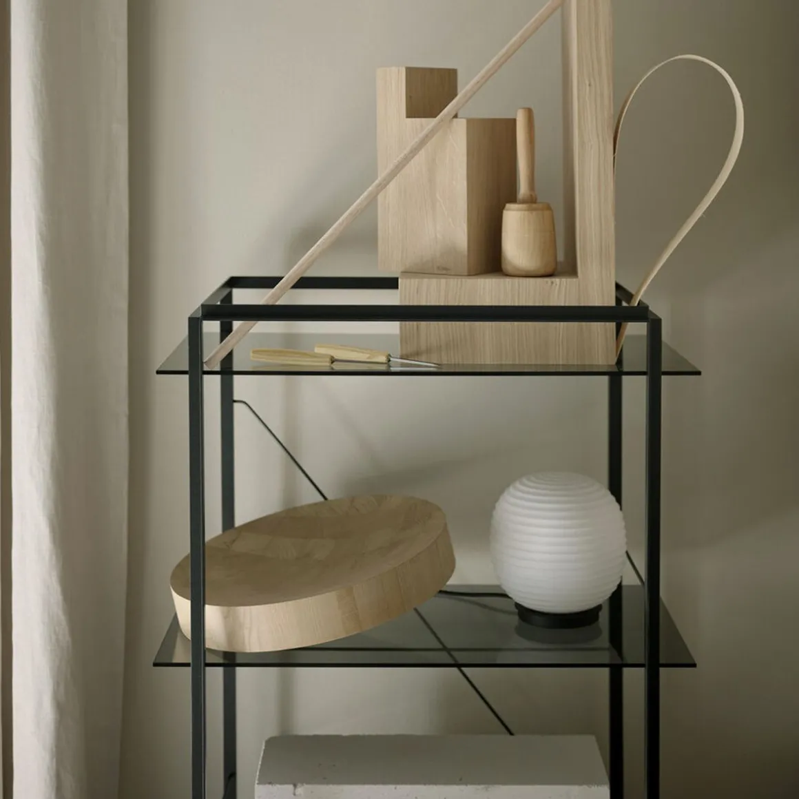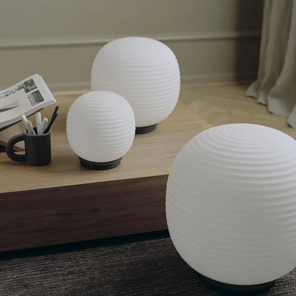 Apportant l’éclairage doux de son prédécesseur suspendu, le lampadaire Lantern et la lampe de table Lantern complètent cette famille emblématique. Inspirées des lanternes chinoises traditionnelles en papier de riz, leurs formes en verre dépoli reproduisent cette lueur en apesanteur. Gardant fermement cette forme sculpturale au centre de la scène, une simple base en acier noir rehausse sa lueur chaleureuse.
