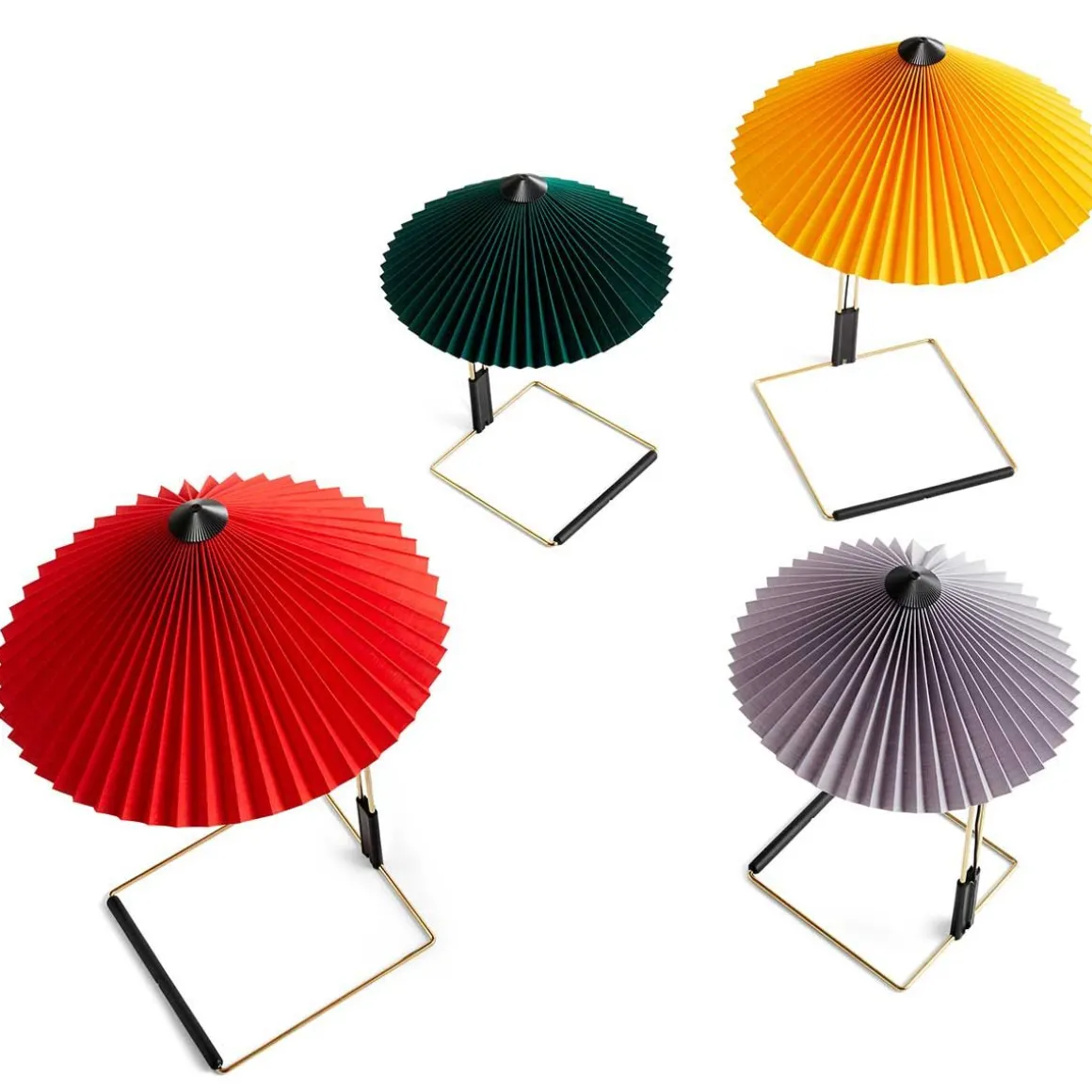 Lampe à Poser Matin de Hay. Conçue par Inga Sempé, la lampe de table Matin offre un design contemporain mais poétique, avec une construction qui allie délicatesse visuelle et robustesse physique. Le cadre en fil d’acier courbé est complété par un abat-jour en coton plissé dans une variété de couleurs vives. La source lumineuse est une LED intégrée, offrant une lumière diffuse qui est accompagnée d’un variateur numérique en ligne pour ajuster la puissance de la lumière si nécessaire.