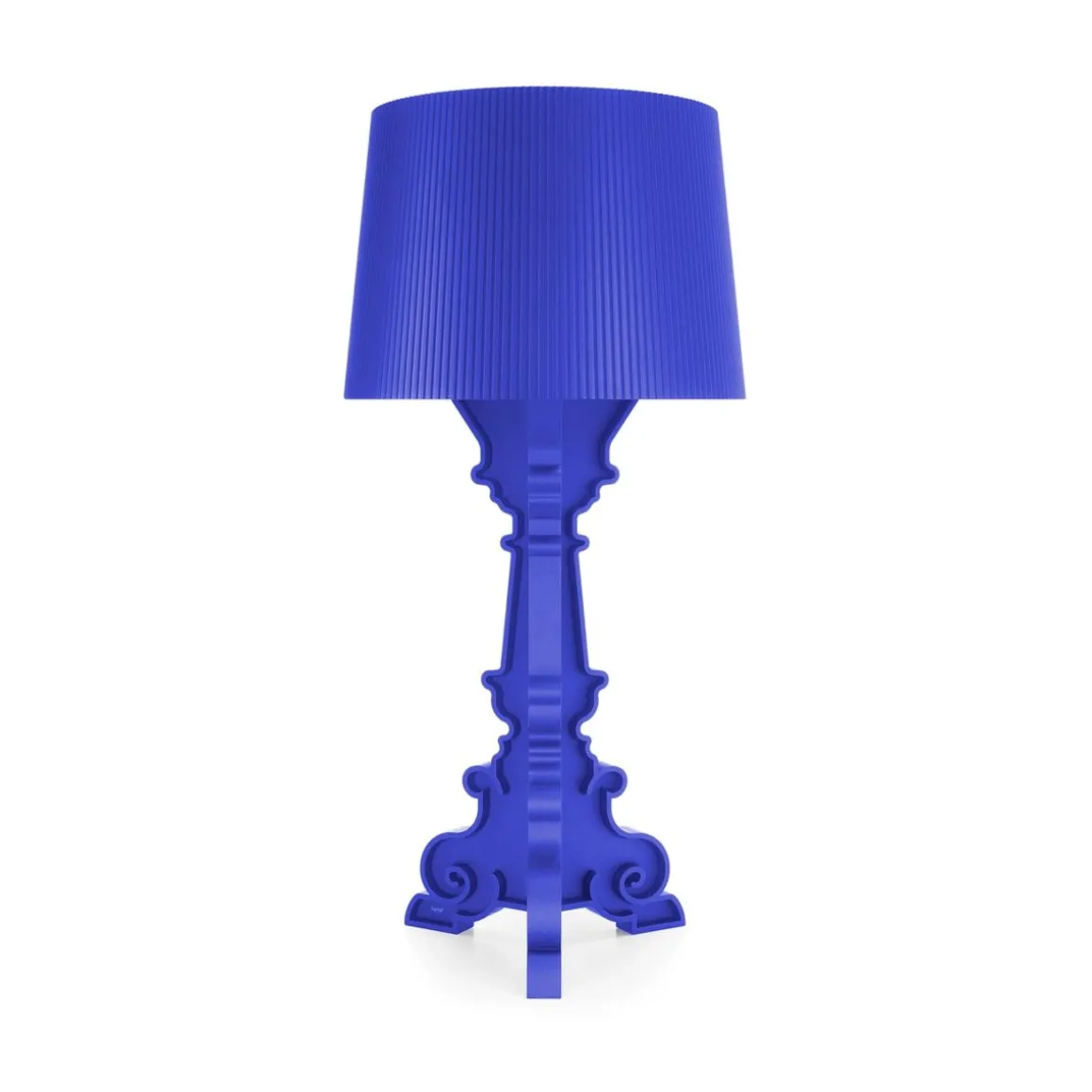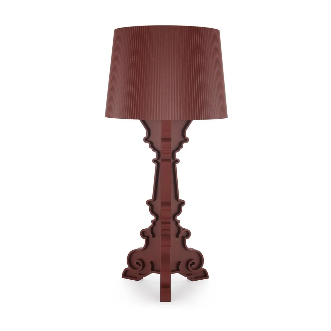 La lampe Bourgie de Kartell est une lampe design transparente en polycarbonate transparent ou teinté dans la masse. Classicisme, richesse et tradition pour cette lampe de style baroque. La qualité du travail et du matériau utilisé est telle que la lampe semble de cristal, précieuse. Sa base, de style baroque, est constituée de trois niveaux décorés qui s’entrecroisent et son ample abat-jour est réalisé avec un effet plissé de manière à créer, lorsque la lampe est allumée, un jeu de mille reflets. Grâce à un système particulier d’accrochage, il est possible d’obtenir trois hauteurs différentes : 68, 73 et 78 cm. Chacun peut choisir et monter la lampe à la hauteur qu’il préfère, et, avec le temps, la modifier à sa guise, selon l’utilisation qu’il veut en faire. Bourgie n’en a que plus de personnalité, offrant la possibilité de se transformer en une splendide lampe décorative, de table ou de bureau.
