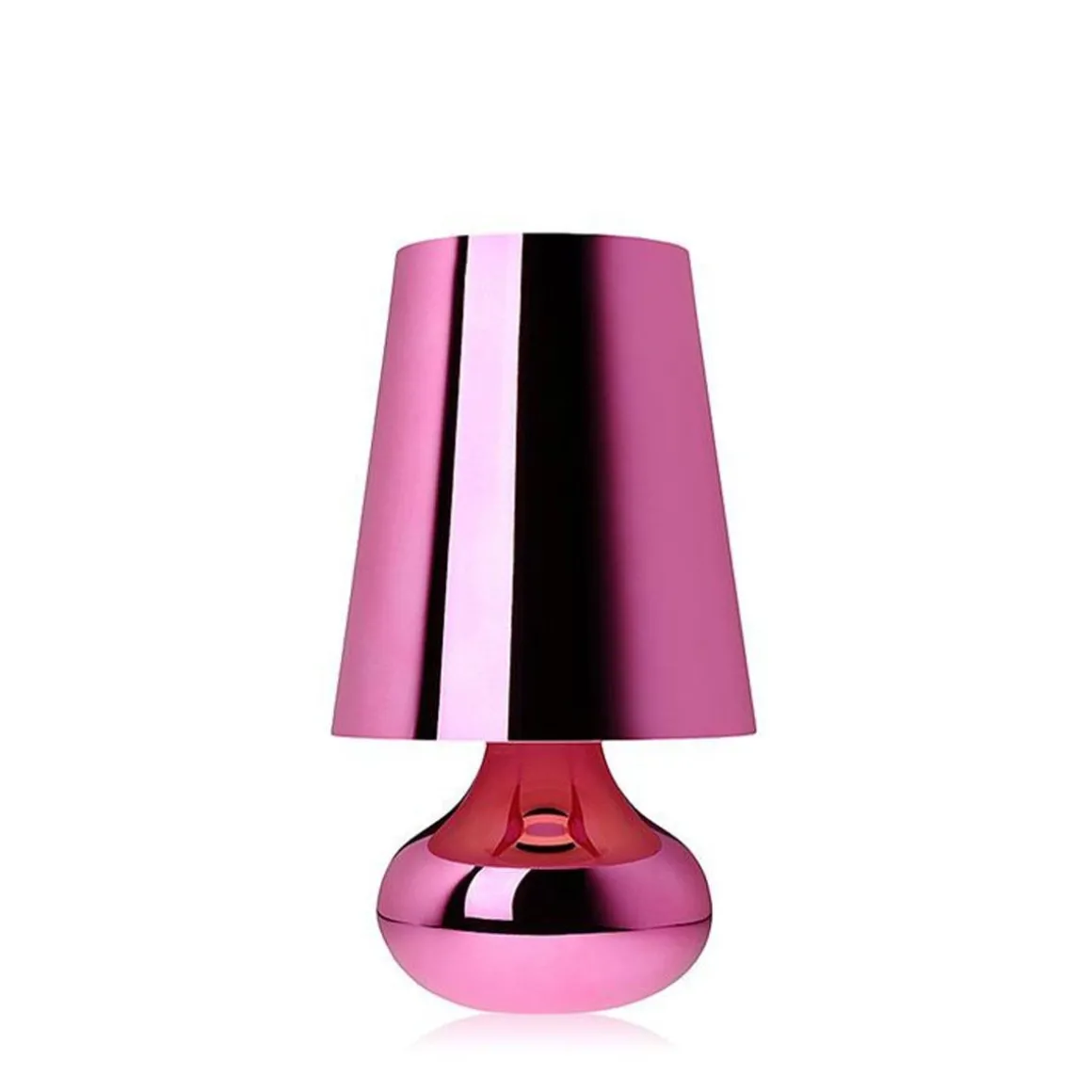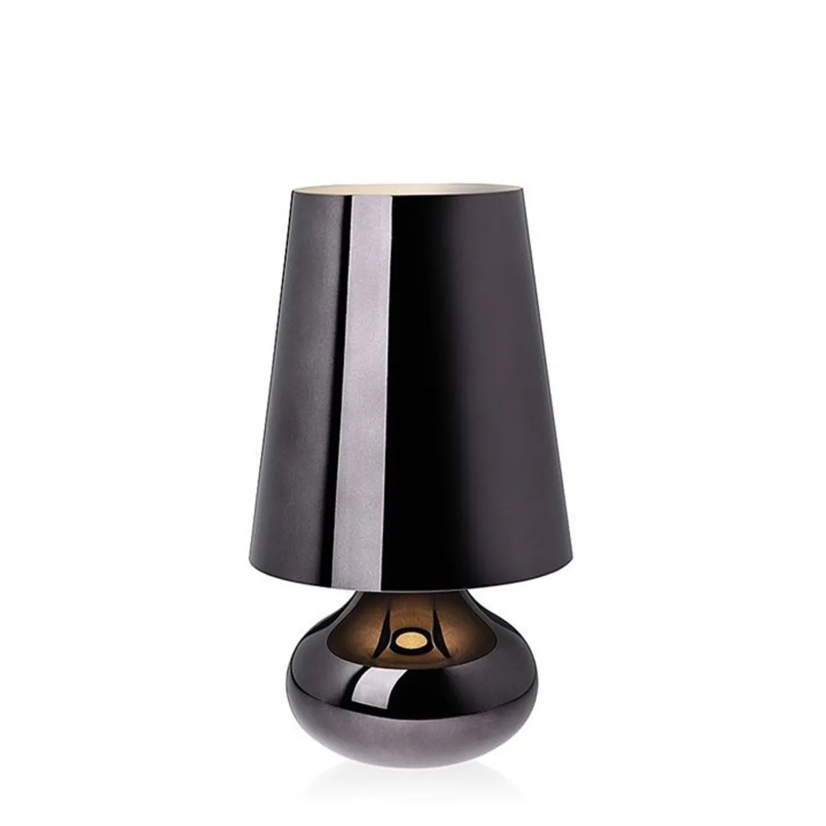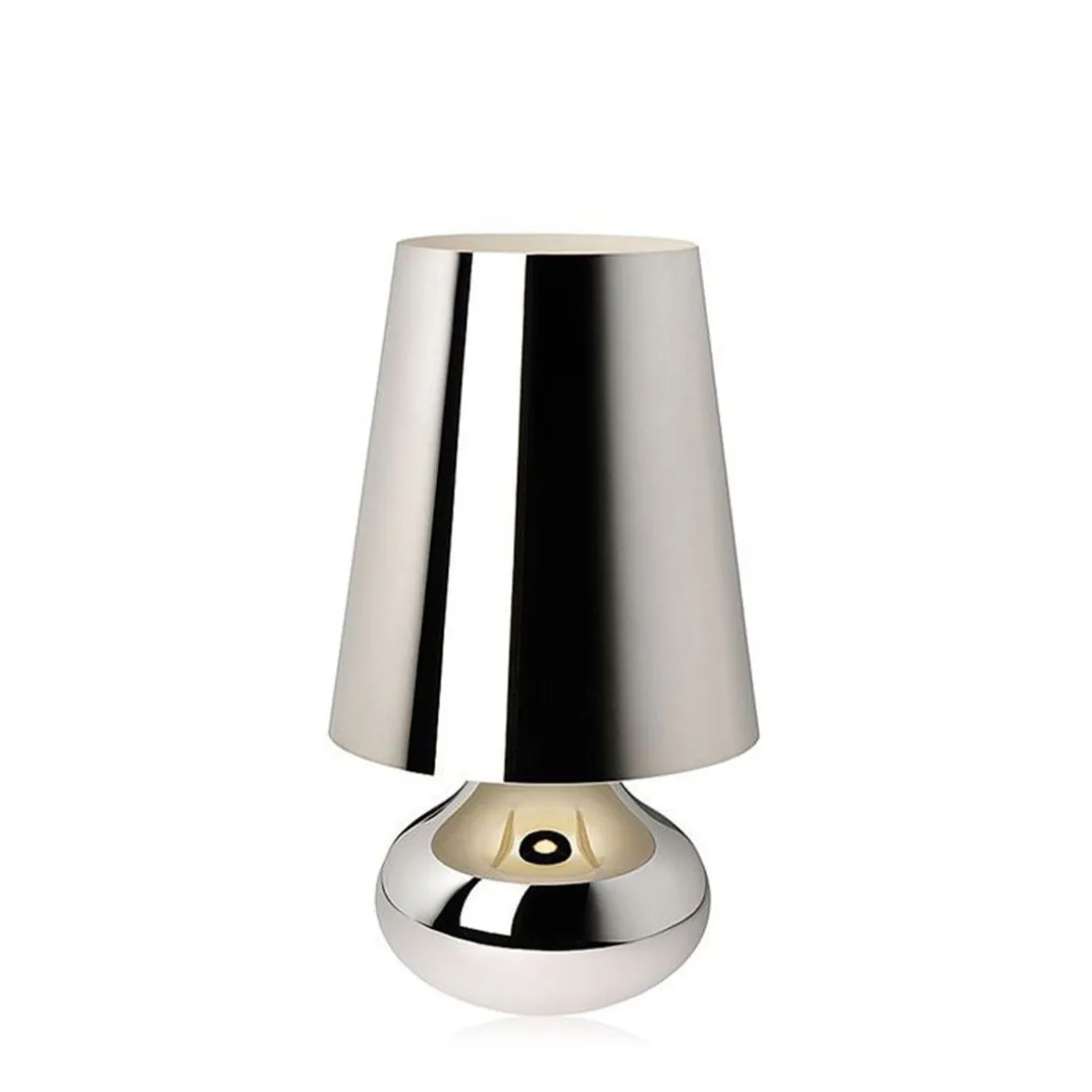 Une lampe de table typique des années 70 dont la forme et la couleur ont été modernisées. Cindy, composée d’un abat-jour conique et d’une base sphérique en forme de goutte, est proposée dans une large gamme de tonalités métallisées, toutes opaques : platine, or foncé, bleu, fuchsia, canon de fusil et violet. La véritable particularité de Cindy réside dans sa finition brillante, un chromage donnant naissance à une féerie de reflets changeants qui lui confère une touche de luxe et de modernité uniques.