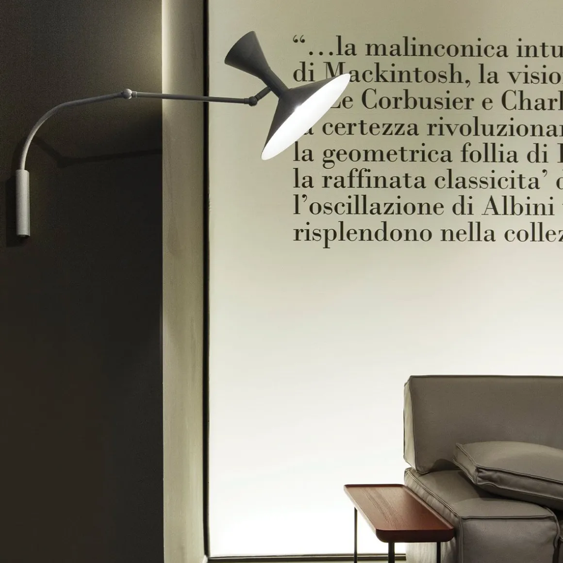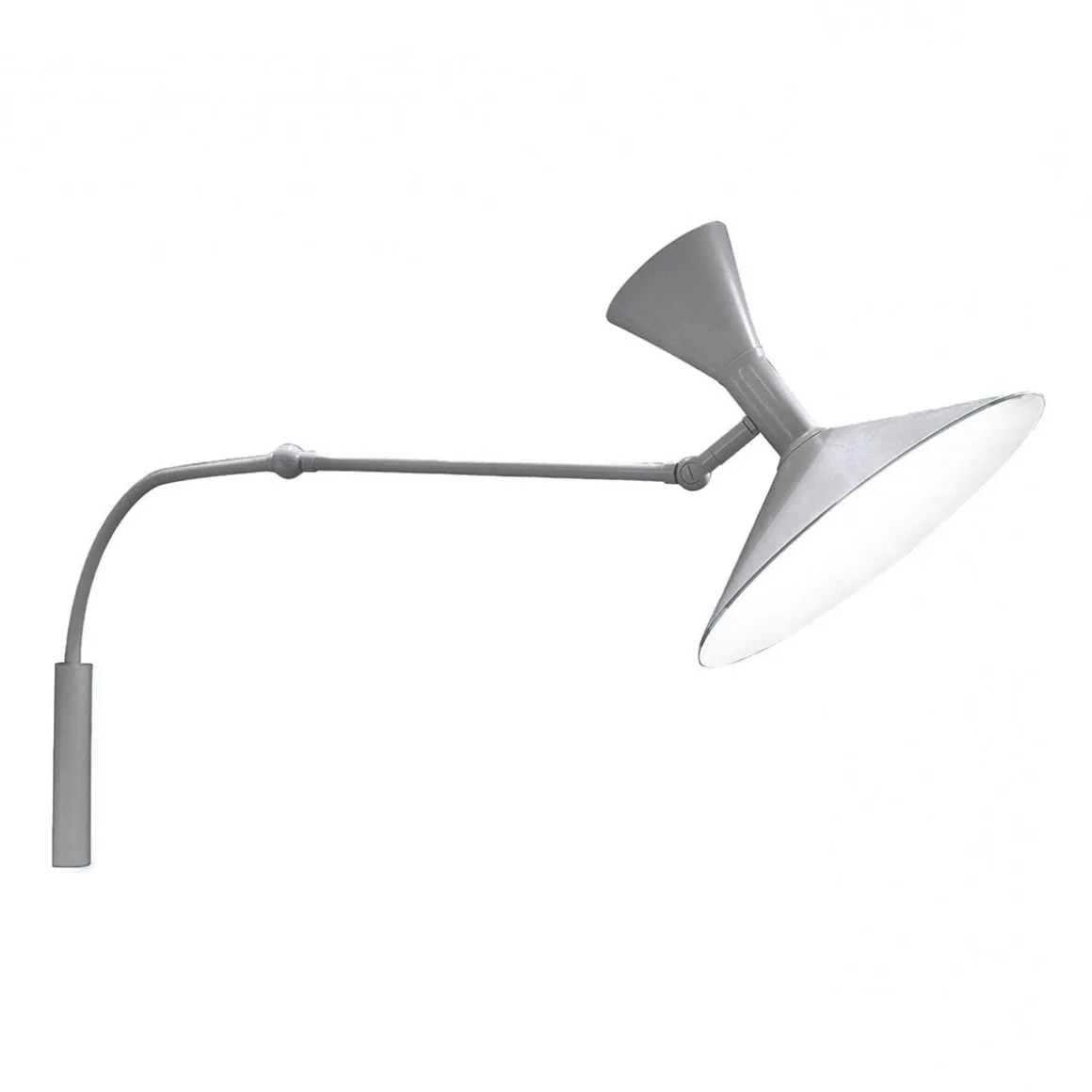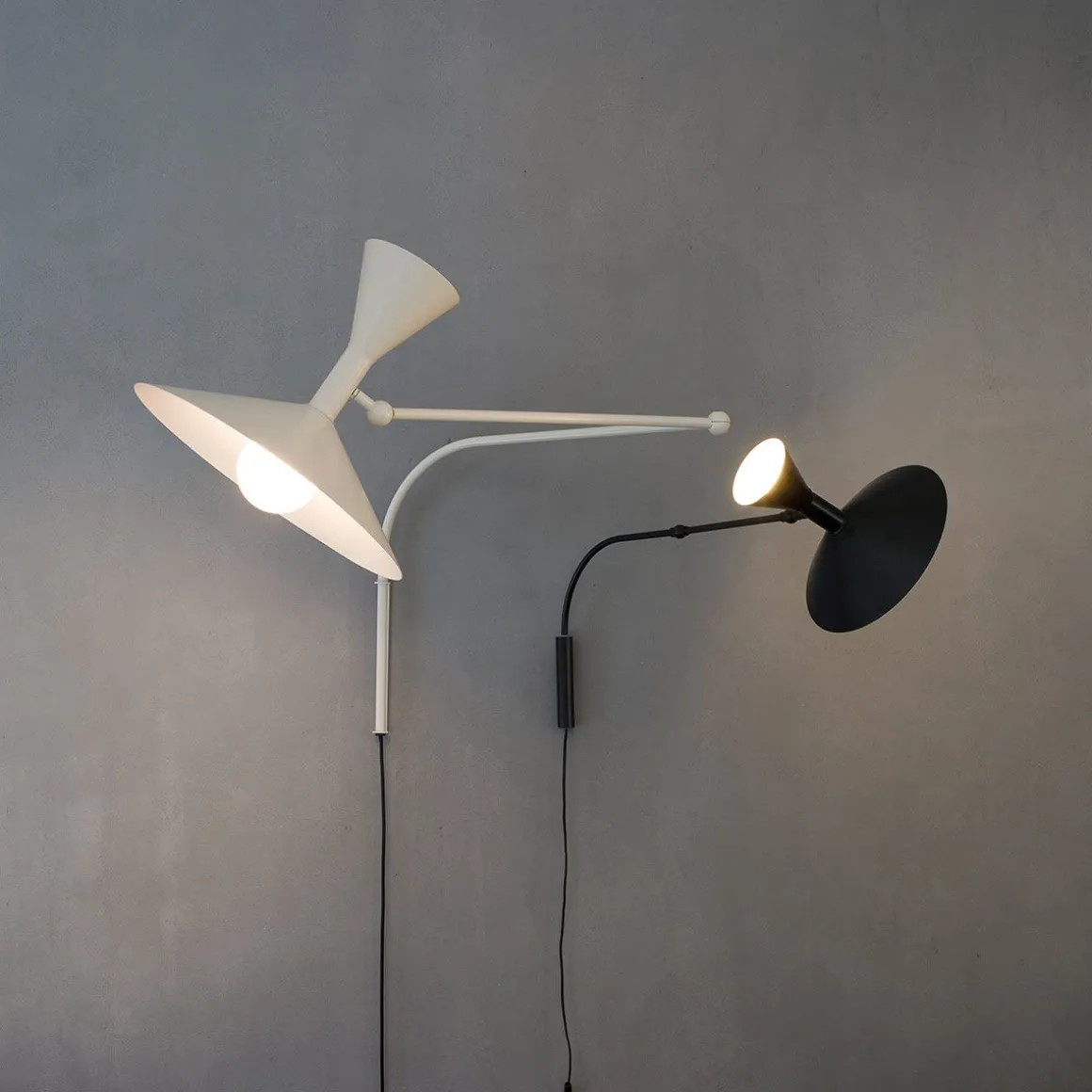 Applique Le Corbusier avec un bras déporté, connu sous le nom de La lampe de Marseille. Cette applique murale en format mini est une réédition de la lampe de Le Corbusier de 1954. Inspirée de l’éclairage industrielle de l’époque, cette applique est munie d’un abat-jour composé de deux cônes asymétriques, proposant deux sources lumineuses (direct et indirect), fixé sur un bras orientable. L’abat-jour est pivotant et son bras long peut aller jusqu’a 85cm.