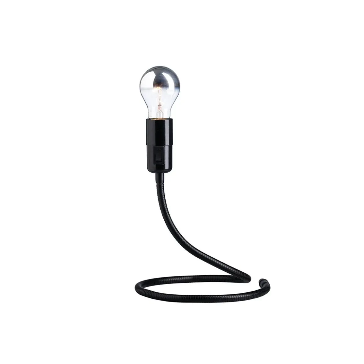 Lightworm de Tecnolumen par Walter Schnepel. Cette lampe se caractérise par sa flexibilité. Sa base est constituée de maillons métalliques flexibles, tandis que sa tête est une ampoule à embout argenté. L’interrupteur est encadré de plastique noir.