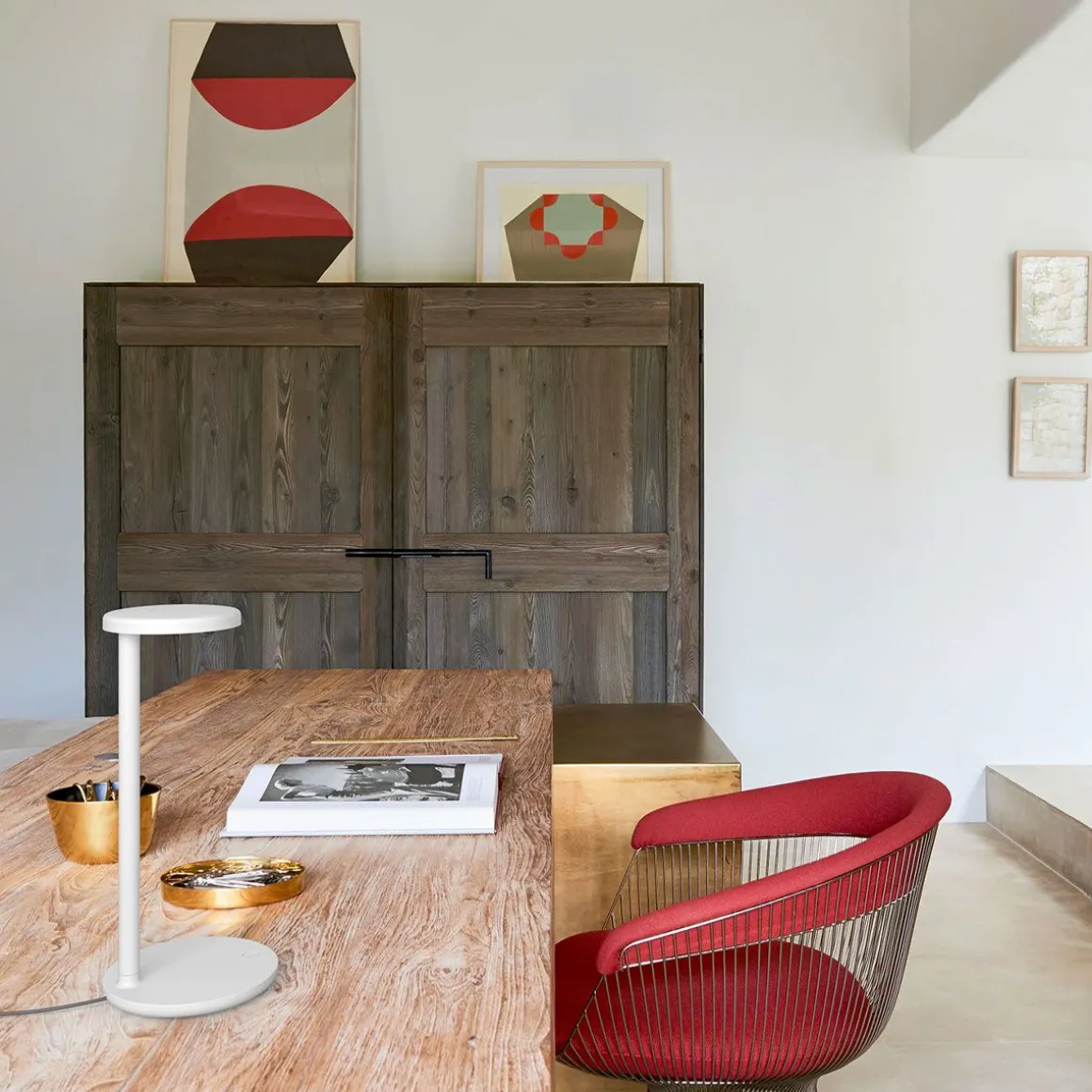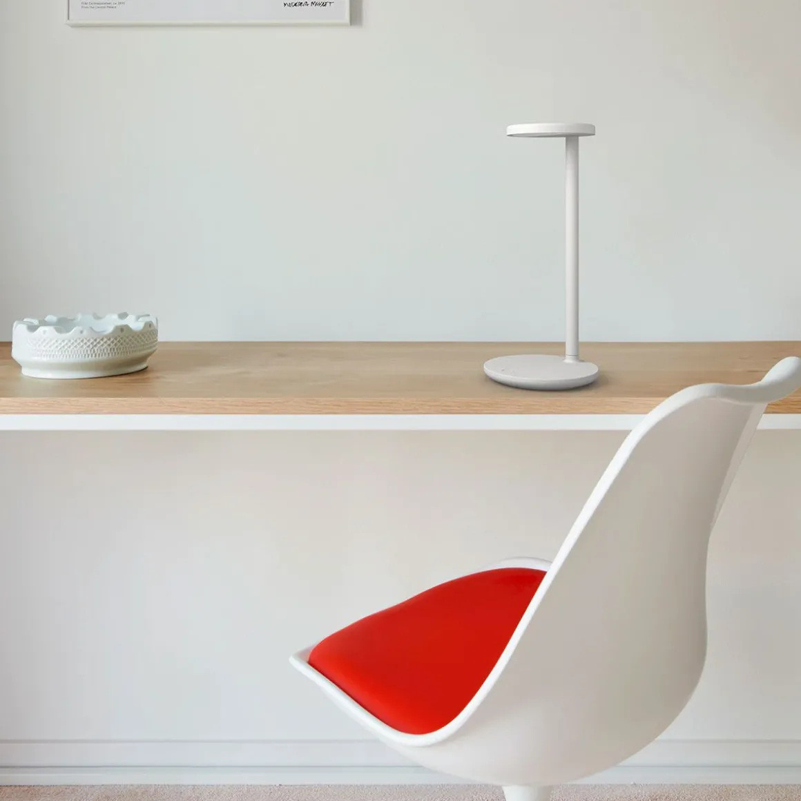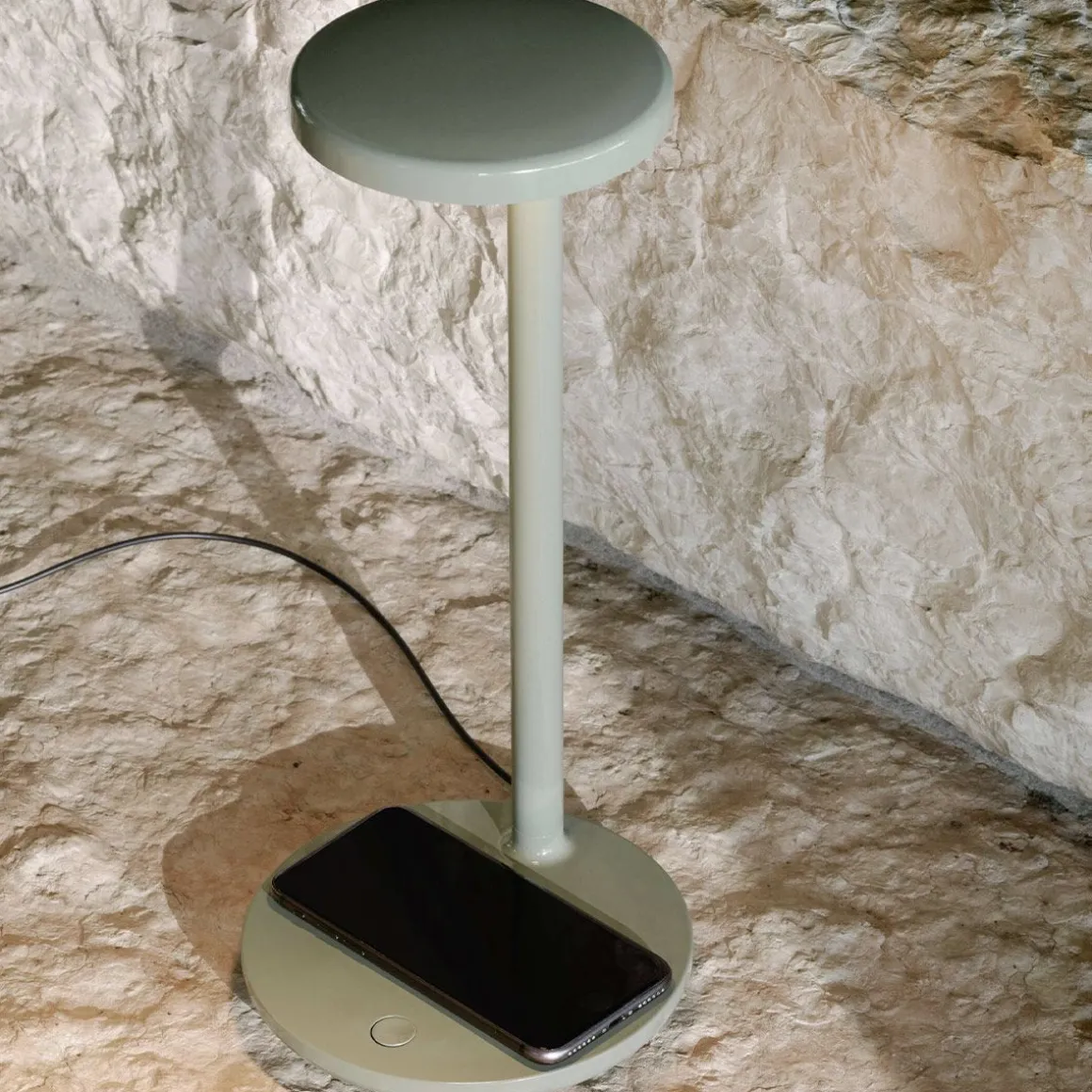 Lampe de table oblique QI professionnelle avec optique asymétrique brevetée. Alimentation externe incluse équipée avec un câble de 1500 mm. Prise USB-C intégrée dans la base de l’appareil prévue pour le chargement des appareils compatibles. Base avec système de chargement sans fil certifié Qi pour appareils mobiles et chargeurs sans fil pour dispositifs compatibles.