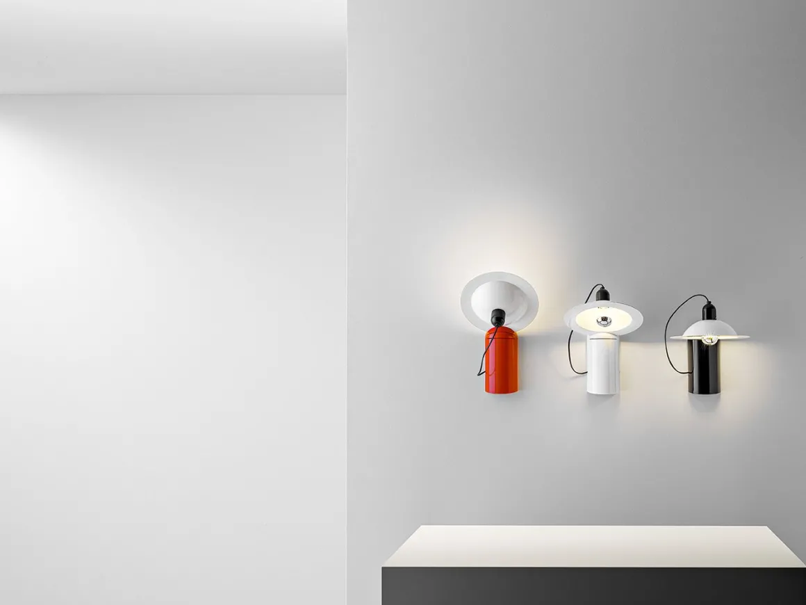 Lampiatta peut être facilement repositionnée sans l’utilisation d’articulations ou de mécanismes : l’abat-jour est conçu pour être inséré à volonté dans l’une des quatre fentes de la base, ce qui permet d’incliner et d’orienter la lumière.