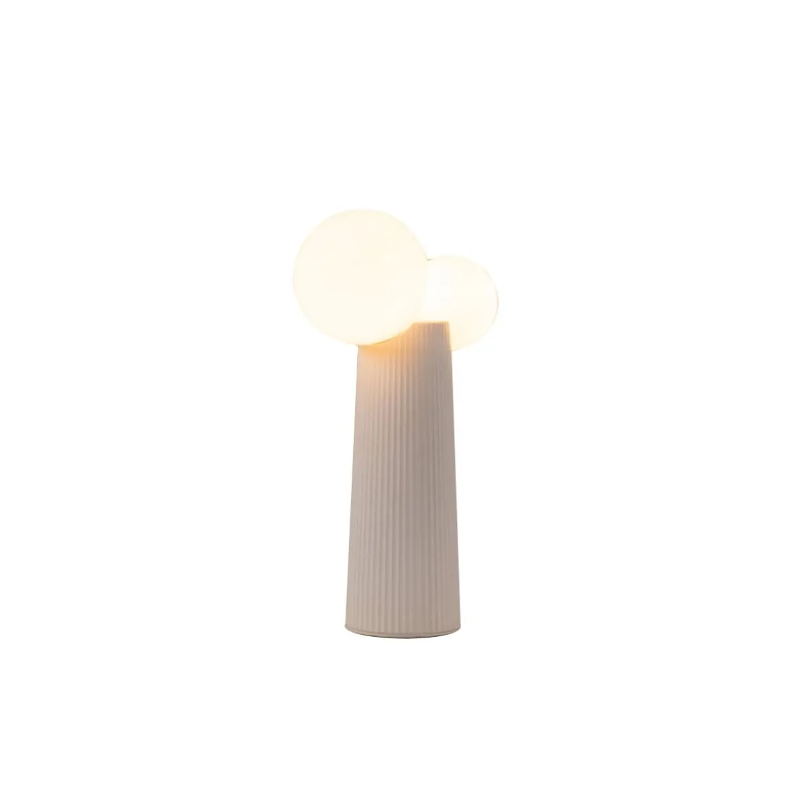 Land est une lampe à poser avec des diffuseurs de 10 et 14 cm de diamètre, en verre soufflé opale brillant. Support en verre qui le relie à la base en polycarbonate injecté, finition blanche. Fixation par système de filetage. Bases en céramique avec finition peinture acrylique. Système de fixation murale par aimants néodyme sur la base.