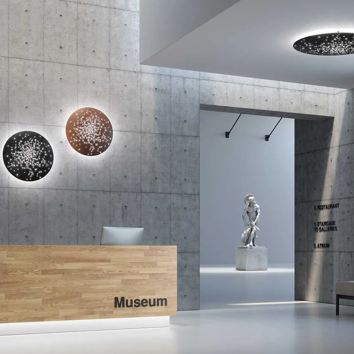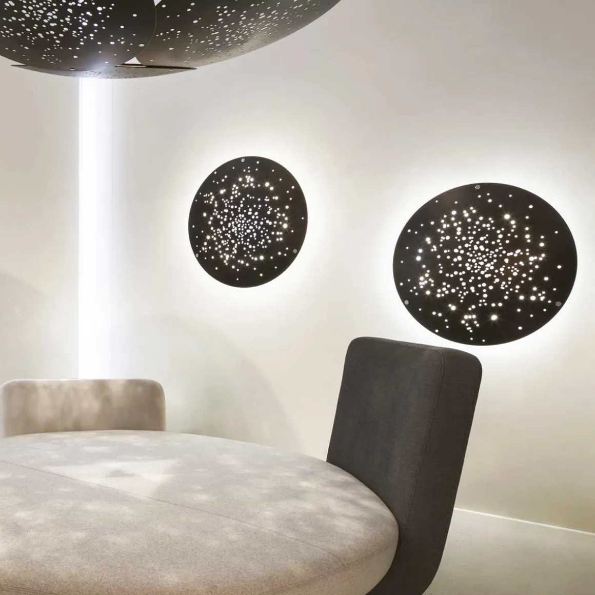 Avec la forme d’une lentille qui concentre et fait diverger les rayons du soleil, Lens a été créée dans le but de capturer la lumière, de la filtrer, pour ensuite la rediffuser dans la pièce. La forme irrégulière sur la surface des lentilles permet à la lumière de se propager en créant un jeu d’ombres et de lumières sur les éléments situés en-dessous. L’environnement, éclairé par ces nouvelles nuances, se fond avec le corps d’éclairage en créant un effet décoratif harmonieux. Les lentilles qui se croisent entre elles par groupes de trois, évoquent la rencontre entre l’élément cosmique et l’élément terrestre, où la lumière représente la synthèse entre ces deux sphères.