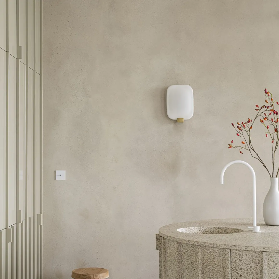 Light me tender de DCW par Patrick Jouin. Light me tender permet de faire varier la lumière et la matière. Nous voulions travailler l’univers de la salle de bain, propre à la temporalité du matin ou du soir. Une élégante lumière pour un objet qui joue avec l’intimité. Inspiré par les nuances de l’aube ou du crépuscule, Light me tender est une lumière douce qui nous révèle dans le miroir. S’attendrir, c’est s’éclairer. S’accepter, c’est varier la lumière. Le dessin est très simple, comme un unique nuage se détachant d’un ciel bleu. Initialement pensé pour la salle de bain, Light me tender peut néanmoins habiller un couloir ou une entrée.